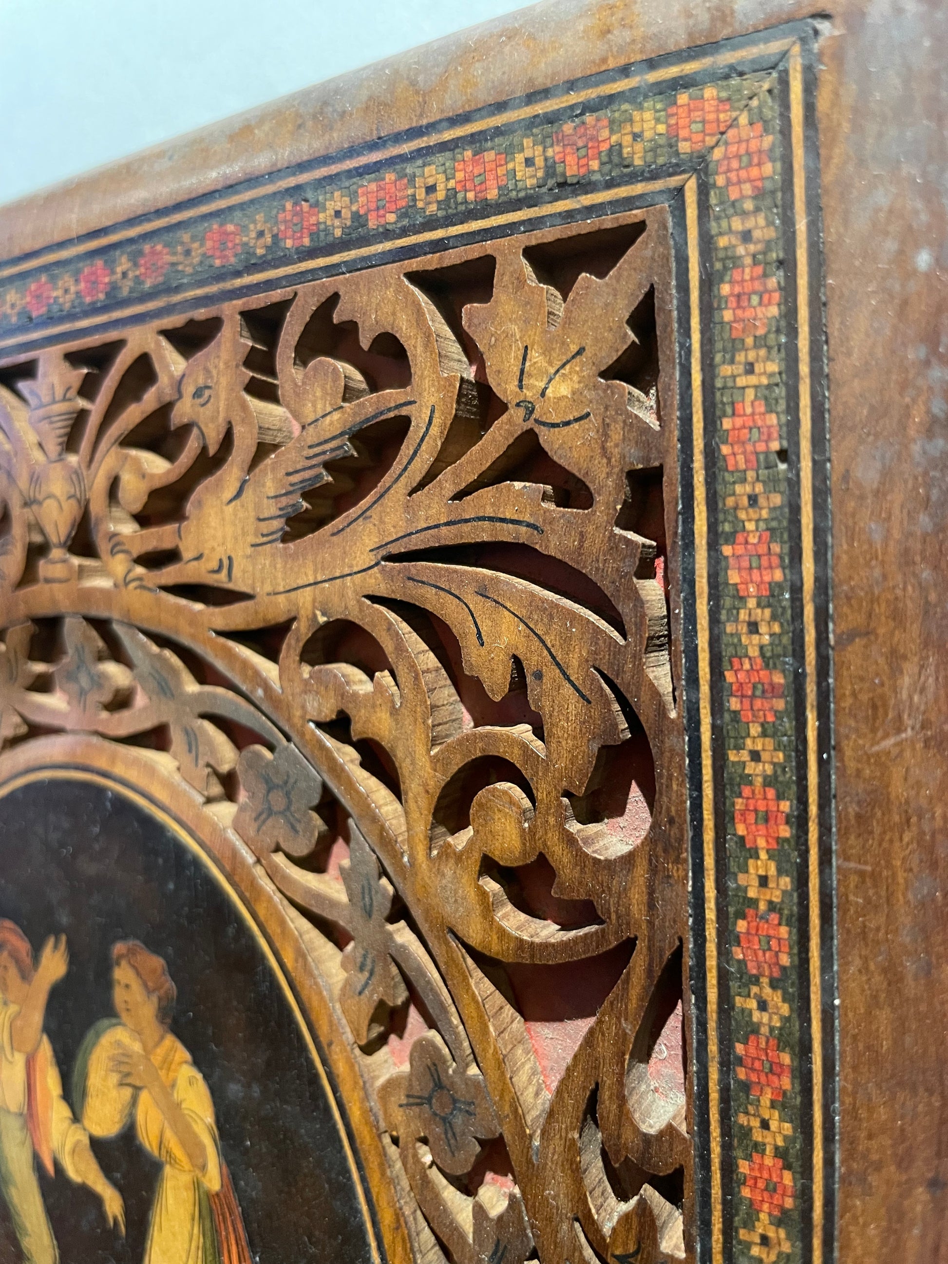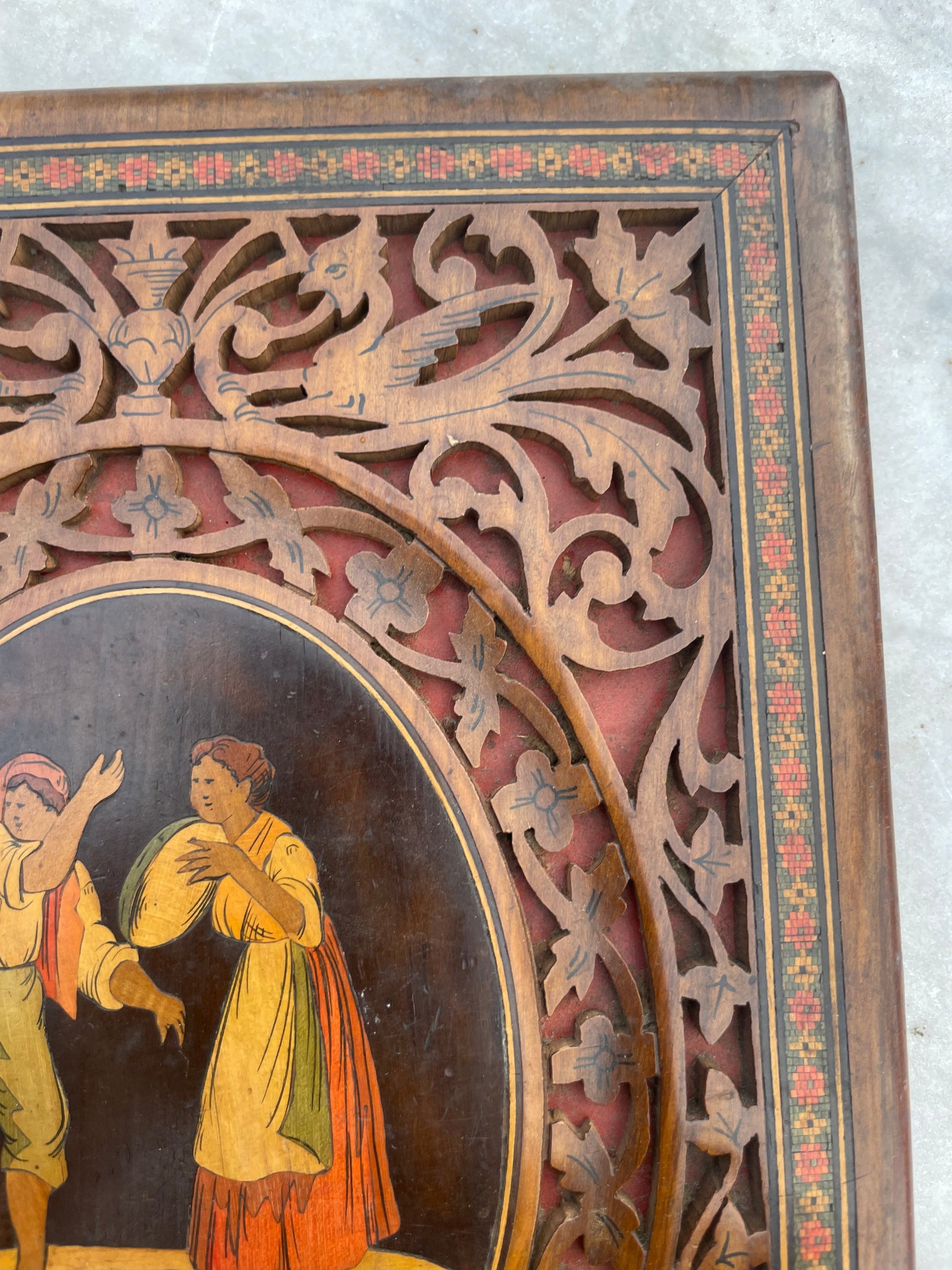 La façade è arricchita da una cornice traforata a motivi vegetali e volute; al centro, un medaglione ovale raffigura una scena di danza popolare con tamburello (“tamburiata”), dai toni caldi su fondo scuro, tipica della produzione sorrentina destinata al mercato turistico colto dell’epoca.