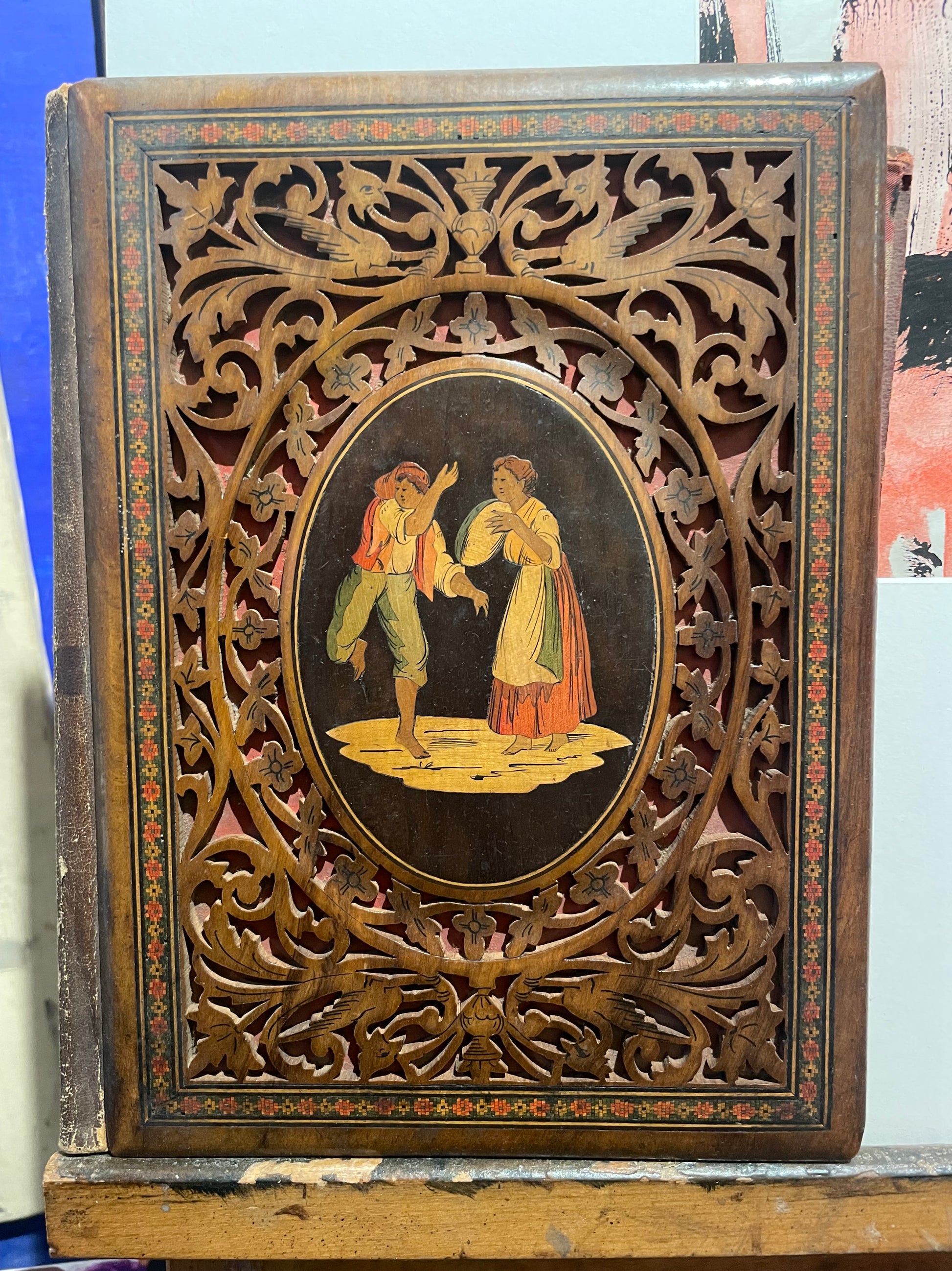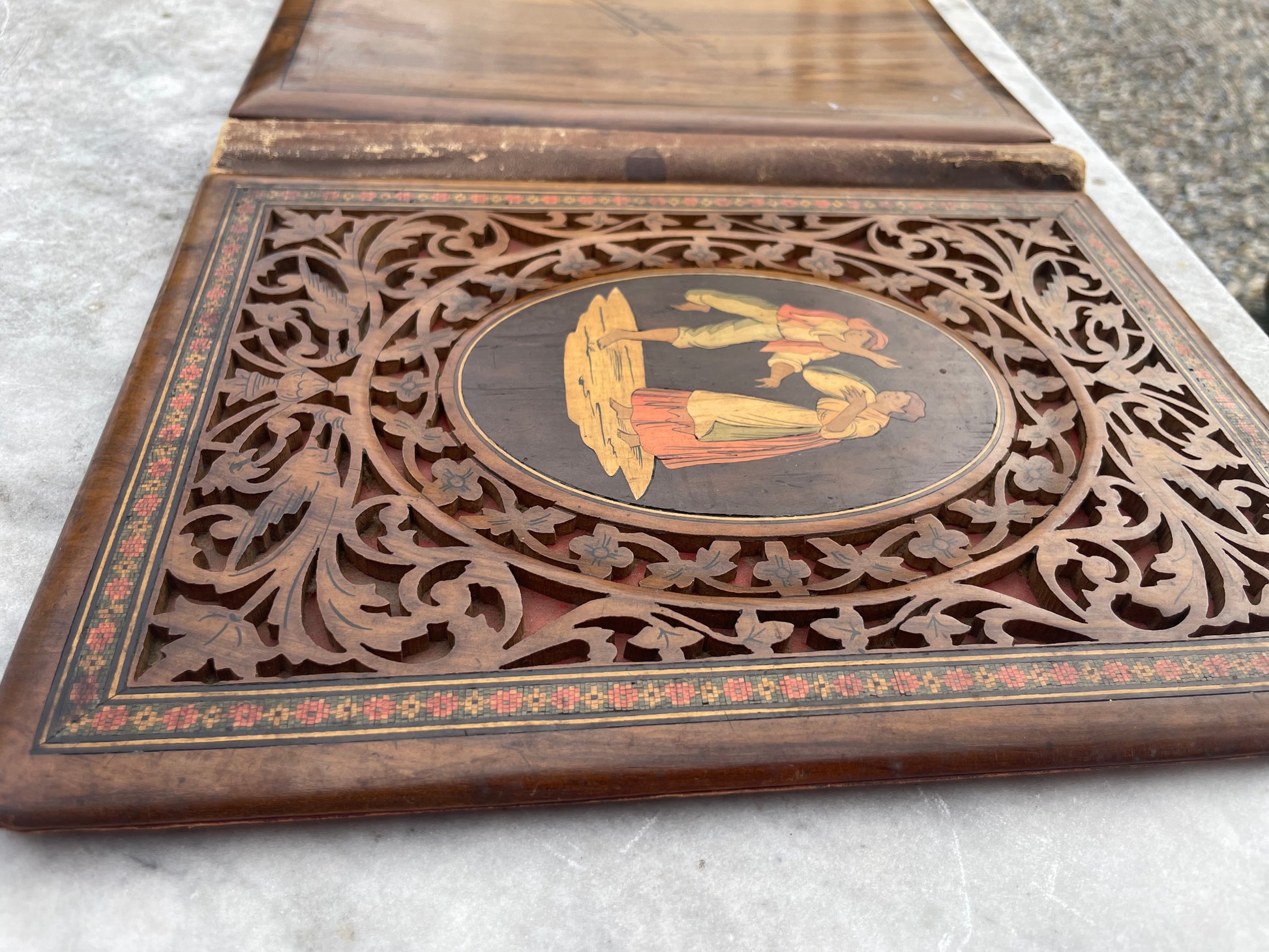 Cartella portalettere intarsiata “Tamburiata”, Sorrento, seconda metà XIX secolo, cm 26 x 20 (chiusa), cm 26 x 41 (aperta)