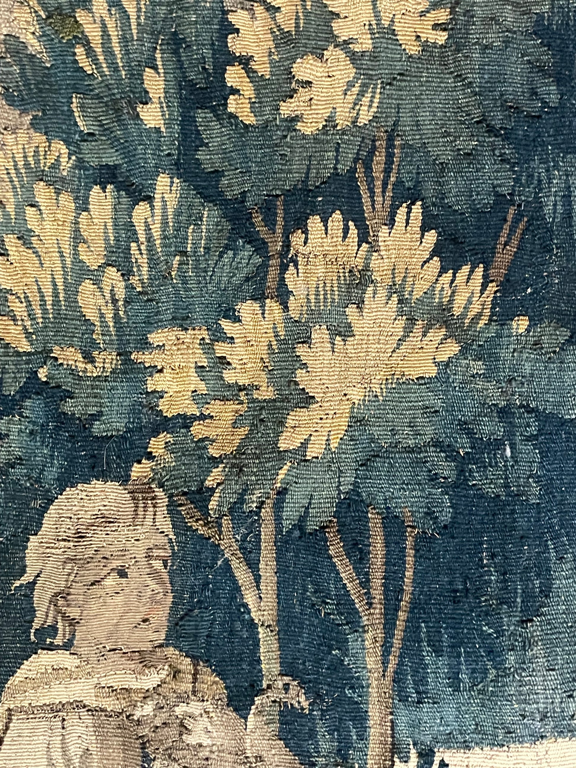 The tapestry is woven in wool. It is without borders, likely due to an early adaptation for interior decoration. The reverse is lined with a carefully applied green fabric. Metal hanging hooks are sewn into the lining along the upper edge.