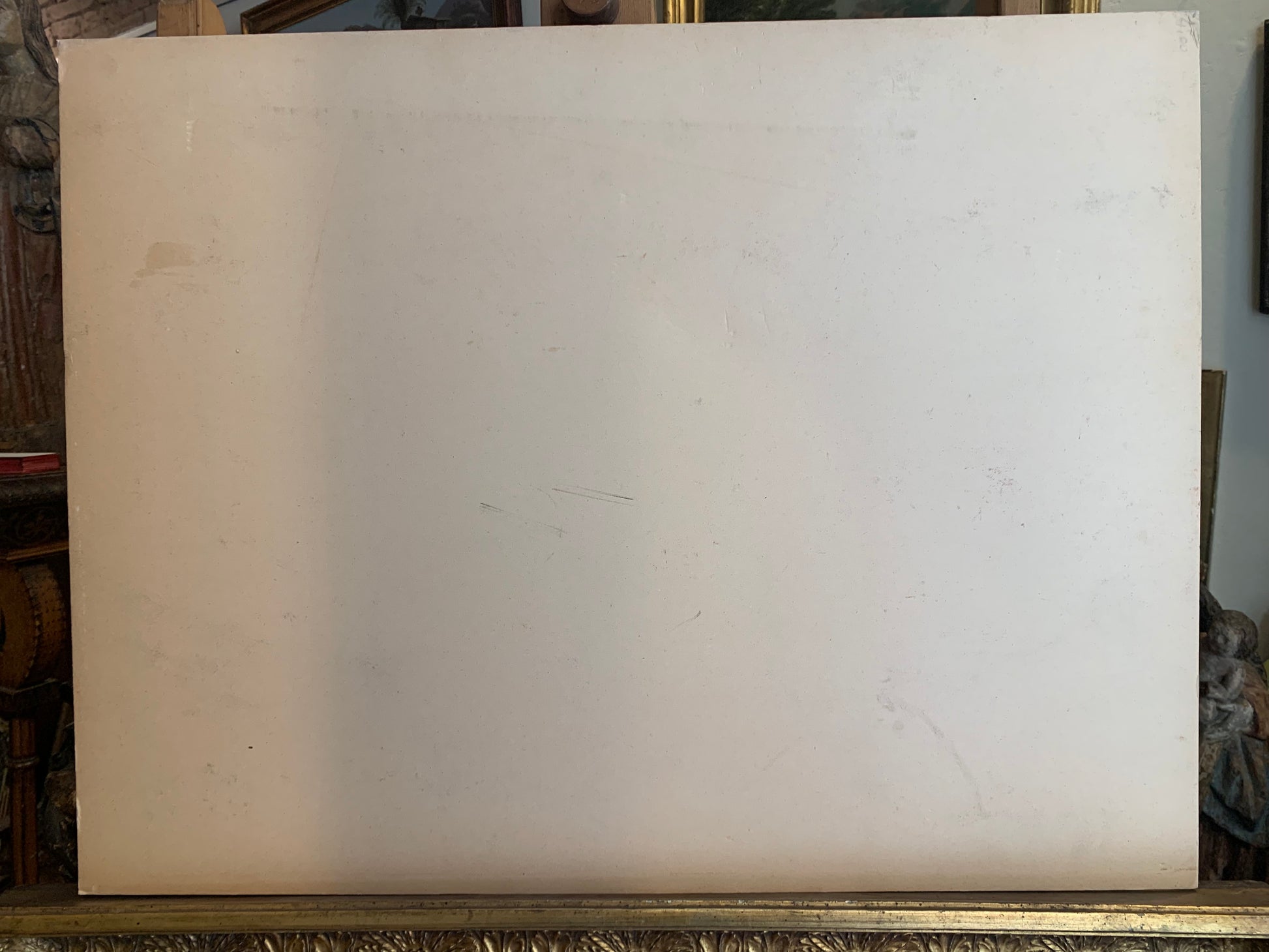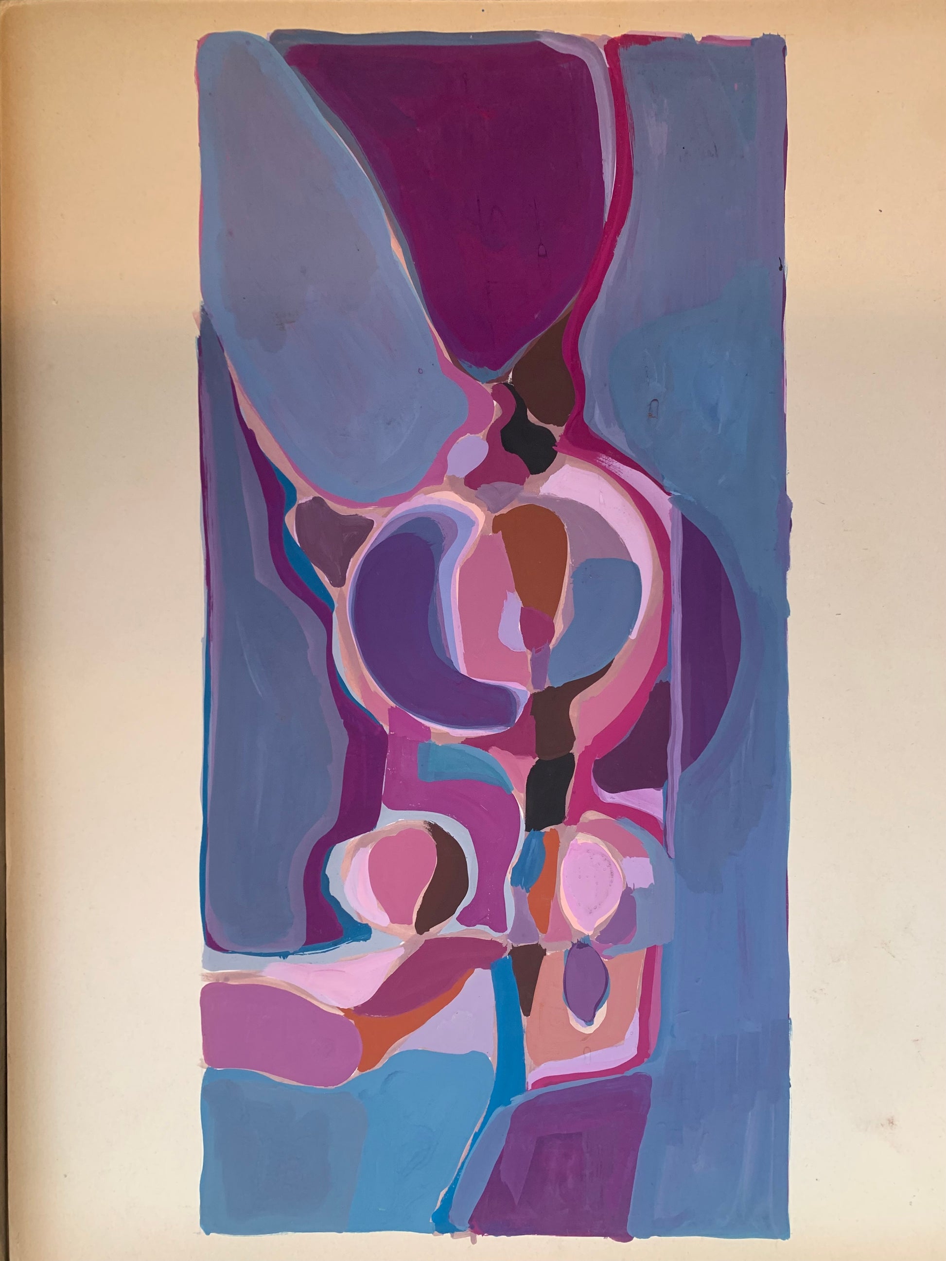 This abstract geometric composition subtly resembles the forms of the female body. The artist creates a series of overlapping blocks and curves, where contours and volumes can be discerned, evoking a stylized human figure. The vivid colors, primarily shades of blue, purple, and pink, bring dynamism to the work, with a structure that suggests a synthesis between abstraction and bodily elements. Despite the geometric approach, the composition retains a certain sensuality in its subtle evocation of organic shapes. The piece is in the style of geometric abstraction akin to Sonia Delaunay, with a refined balance between organic forms and geometric constructions. Originating from France, it was part of a folder containing other unsigned works by the same hand.