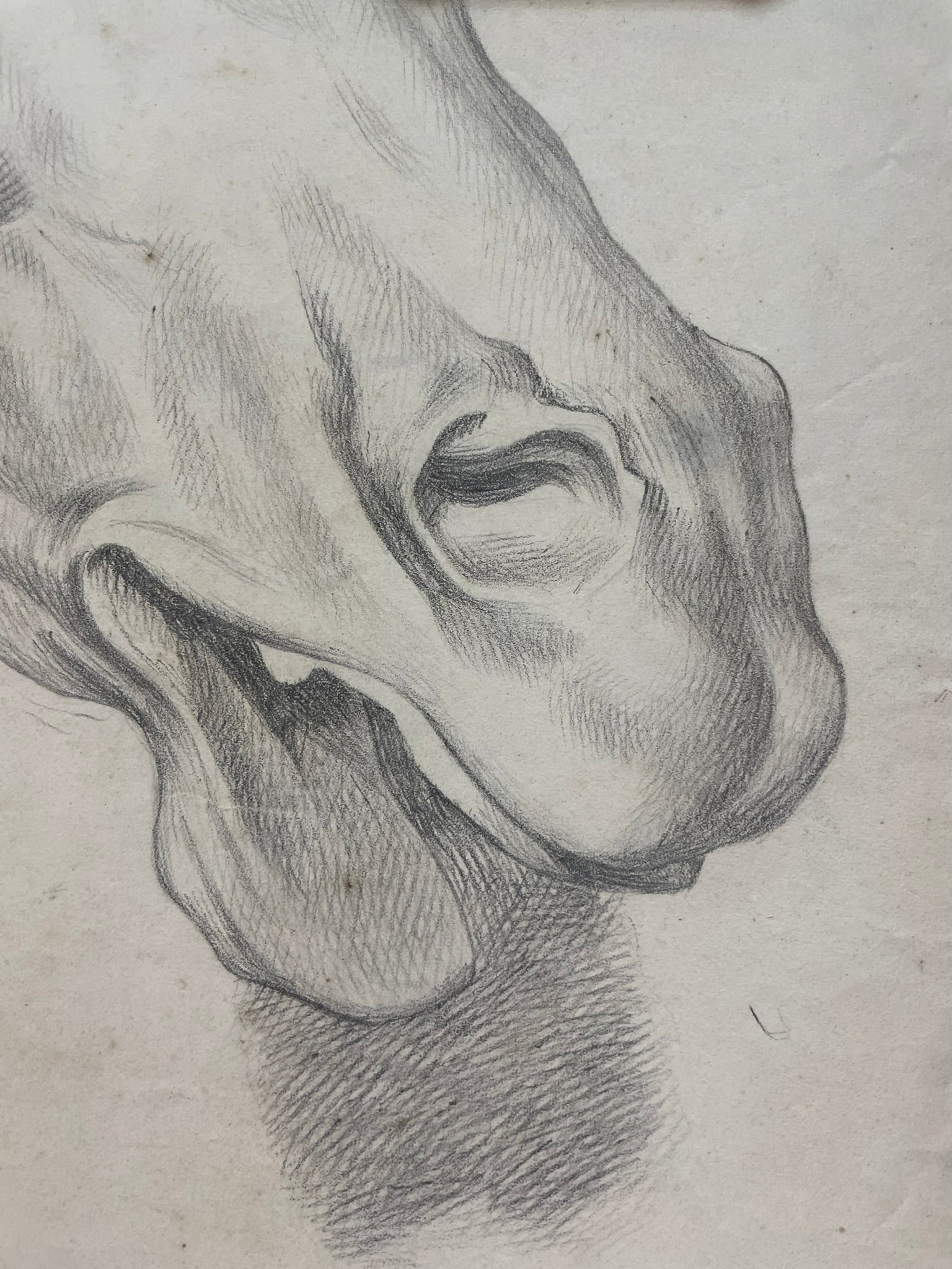 An academic study of a horse’s head, drawn as part of mid-19th-century training in anatomical rendering. The artist focuses on the bone structure of the muzzle, the orbital cavity, and the tension of the neck, using a controlled hatching that follows the modelling of the forms.