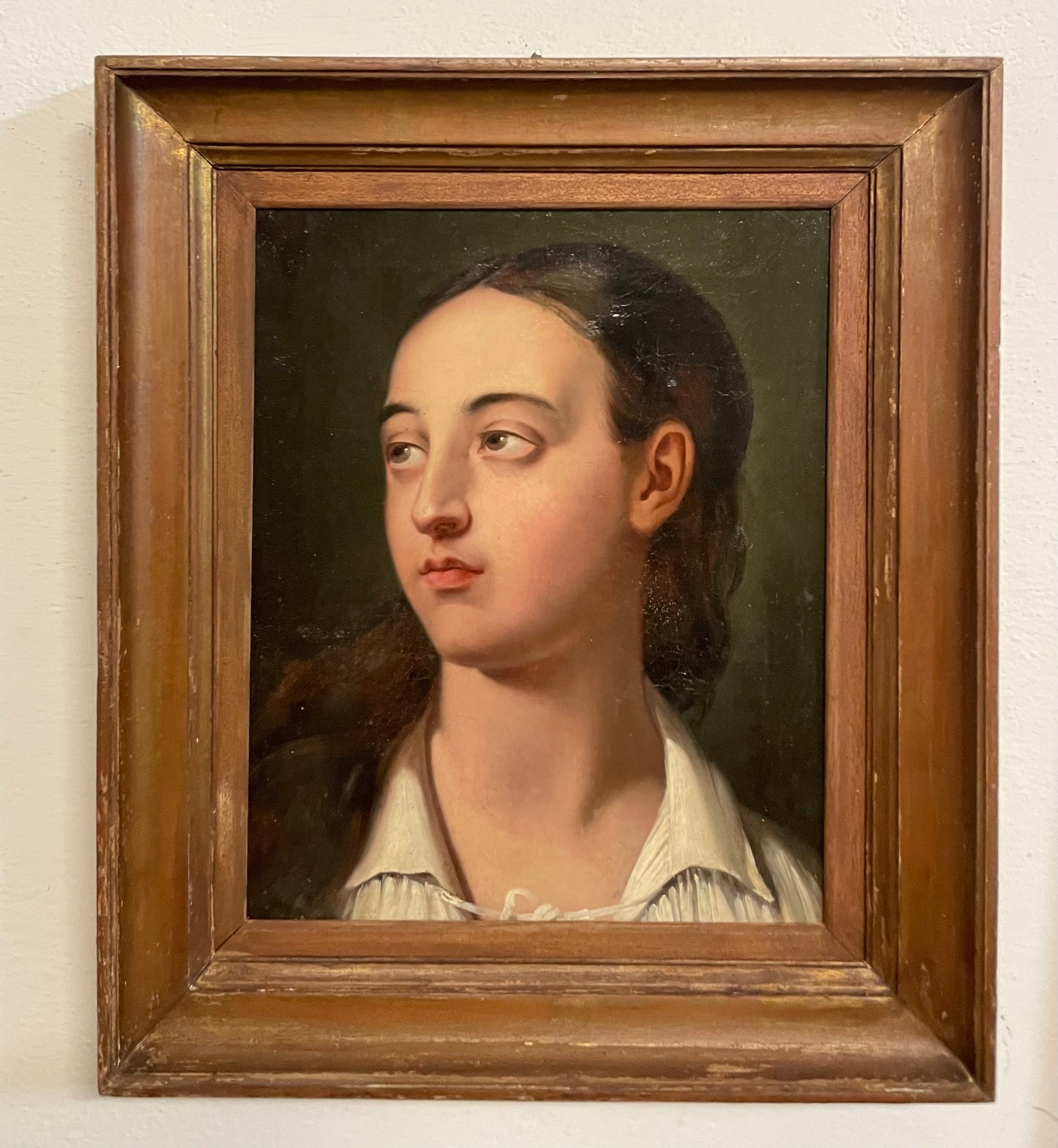 Oil on canvas, French School, dating from the first half of the 19th century. The work belongs to the post-Davidian academic context, defined by a smooth and disciplined painting style in which the pursuit of ideal form blends with a more intimate and romantic sensibility. The modelling of the face, built up through fine translucent layers, demonstrates refined control of tonal values and light.