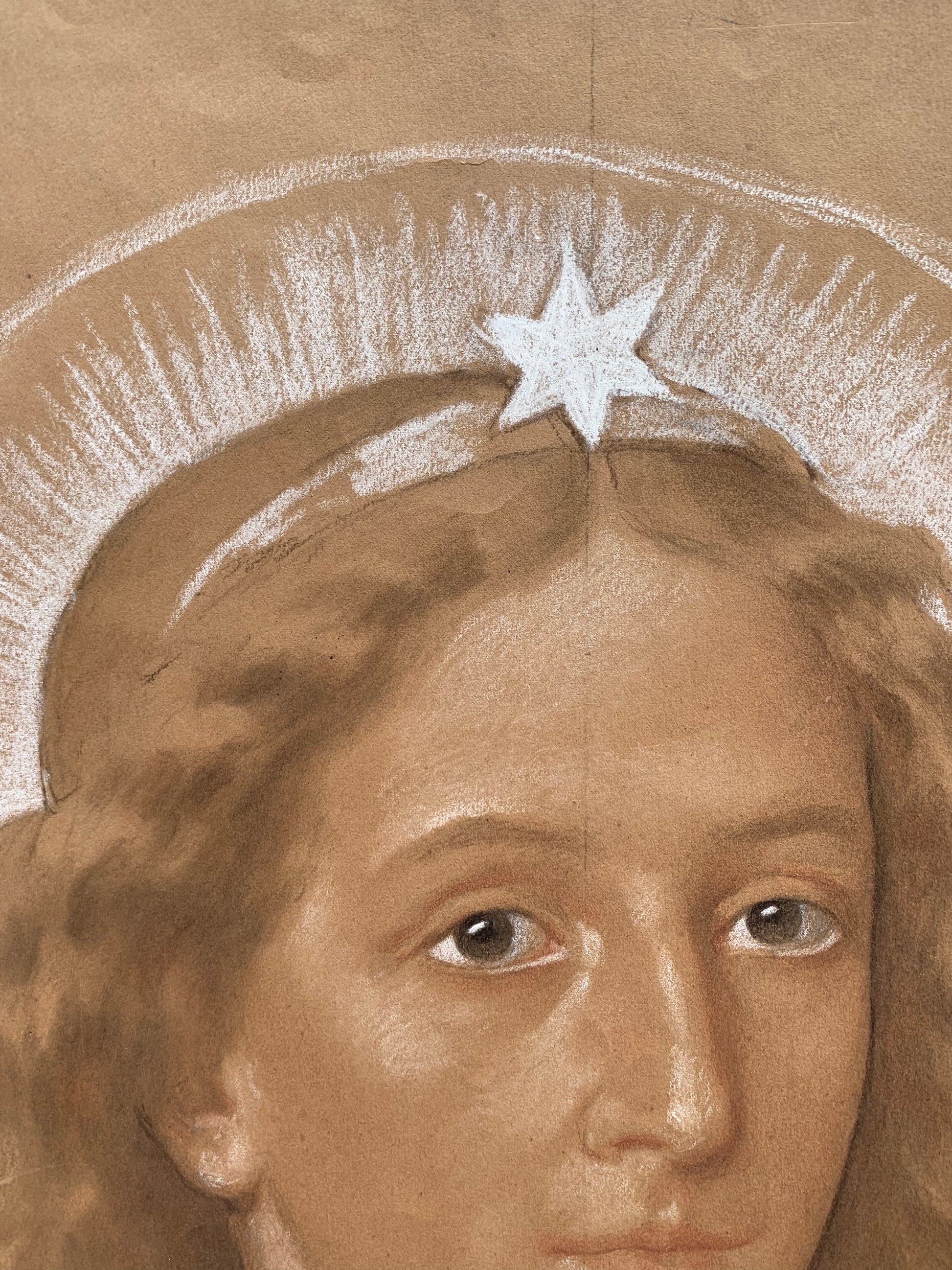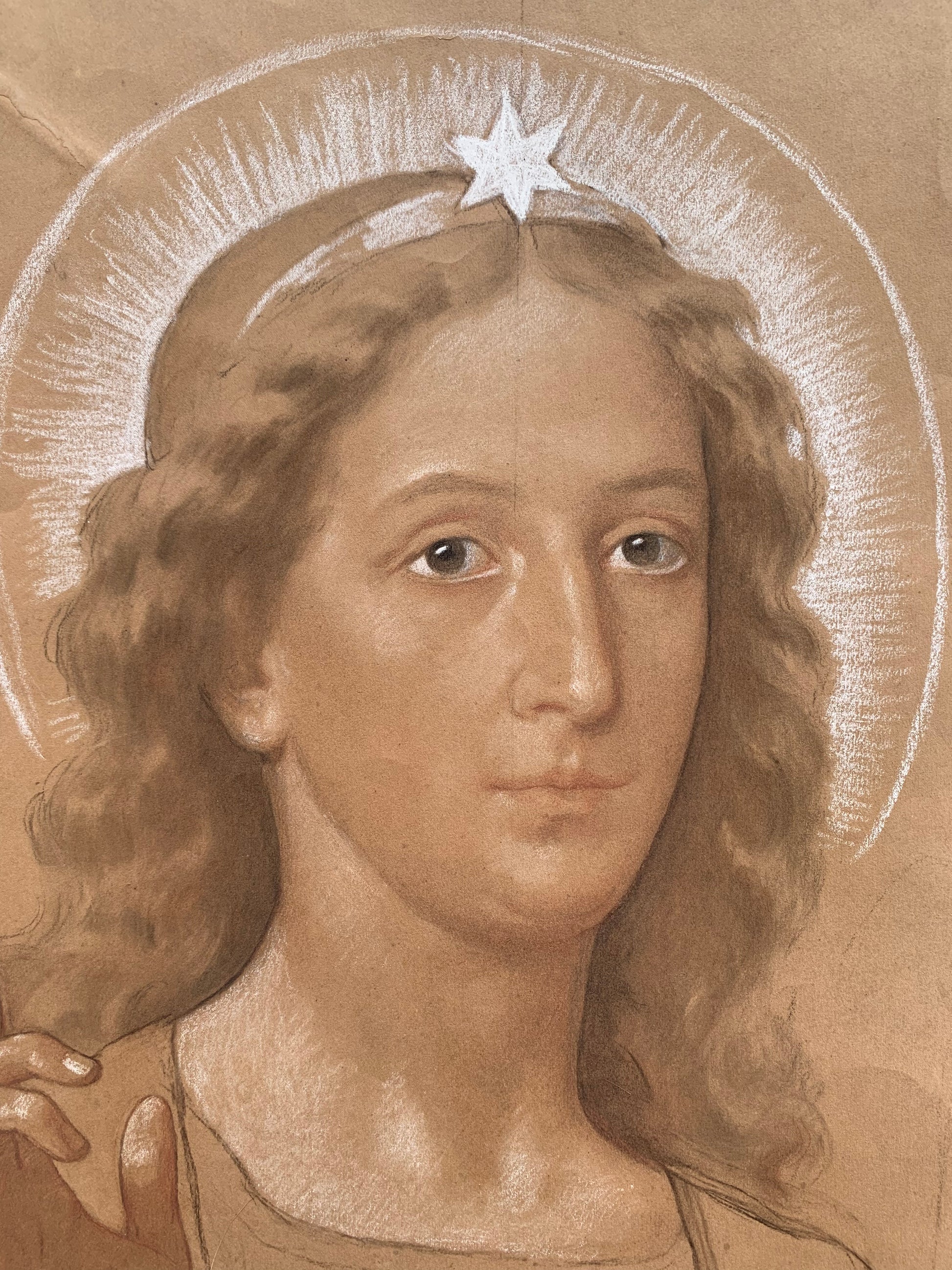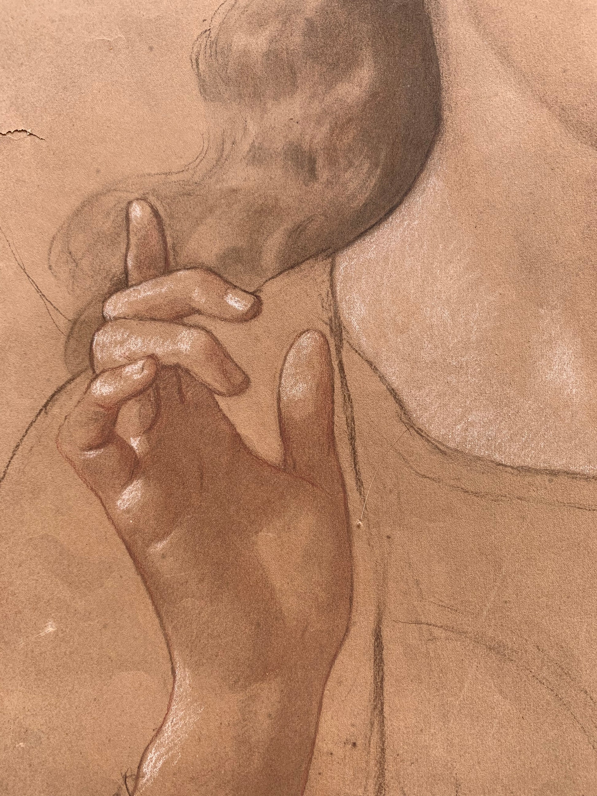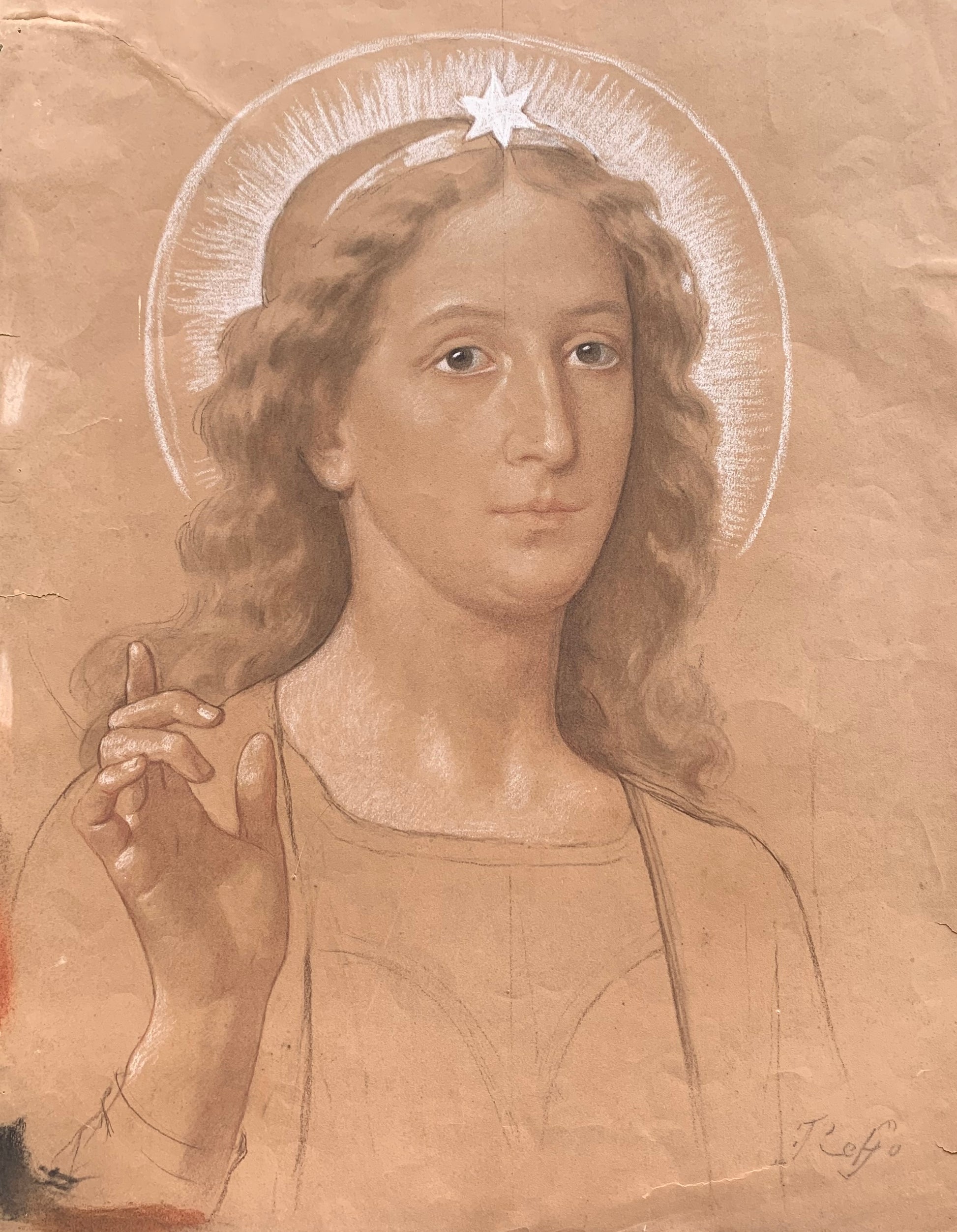 This large drawing on light brown paper shows a winged angel in a dynamic pose, turning gently to one side. Likely conceived as a preparatory study for an Annunciation scene, the figure presents the grace and physical balance typical of Enrico Reffo’s sacred imagery. The artist’s hand is revealed in the fluidity of the line and the confident modelling of volumes, building the form with sure strokes and subtle shading.