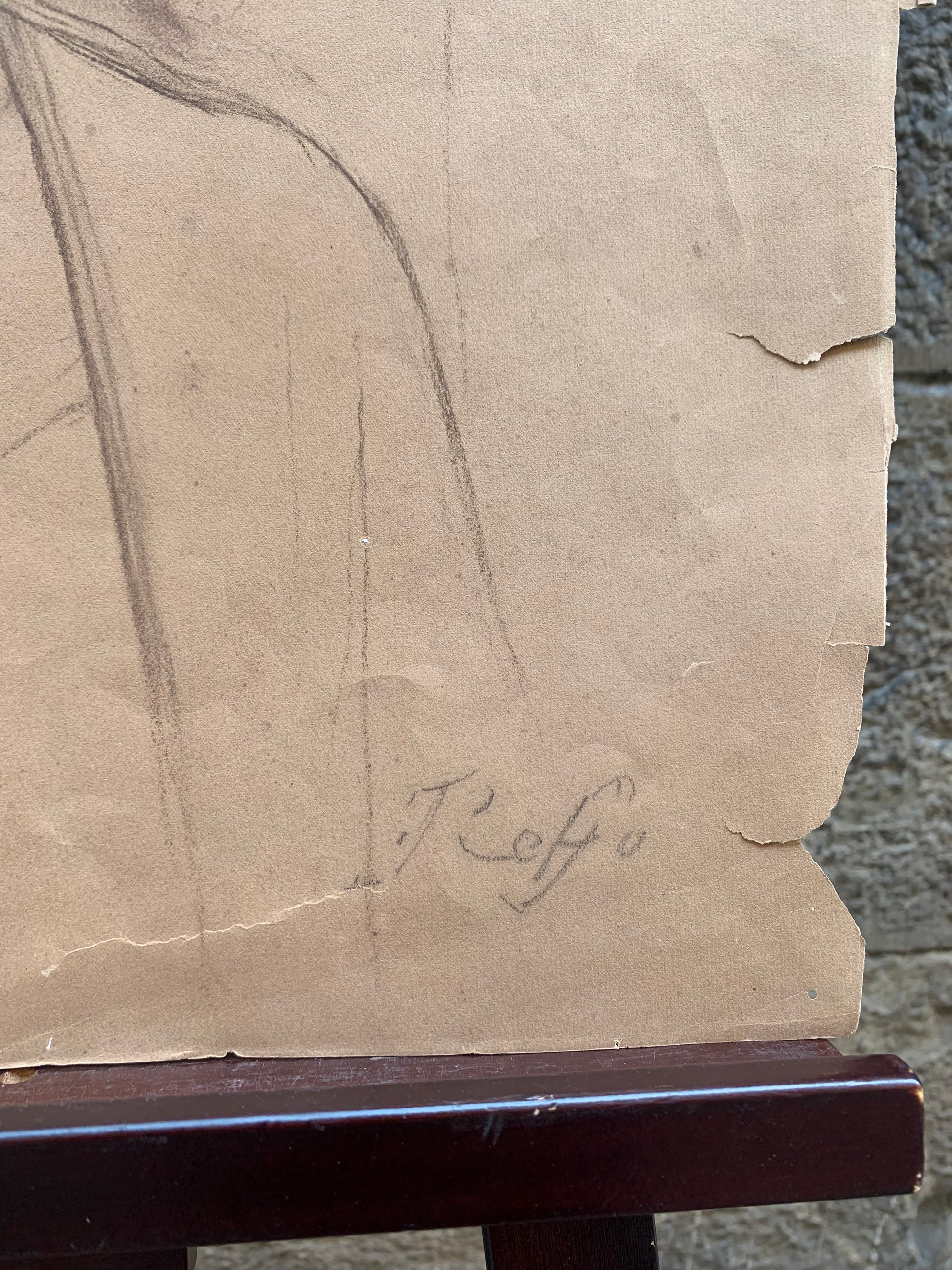 The drawing is signed in the lower right corner, making it a rare example of an autograph work on paper by Reffo. The large format, compositional clarity, and physical presence of the angel all suggest this was a final study used in the artist’s studio before execution on canvas or fresco. Slight wear and defects along the margins confirm its practical use in the painter’s workshop.