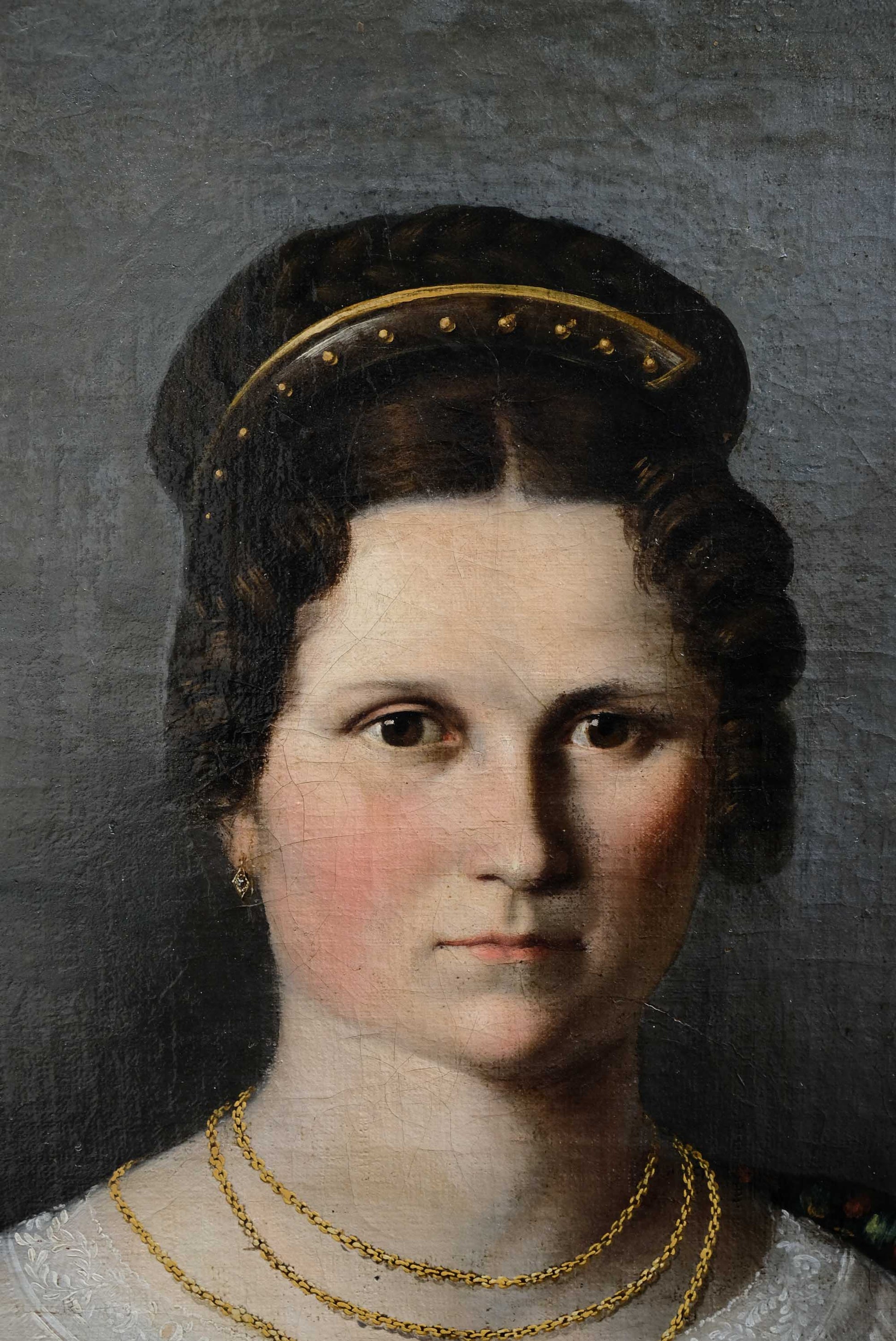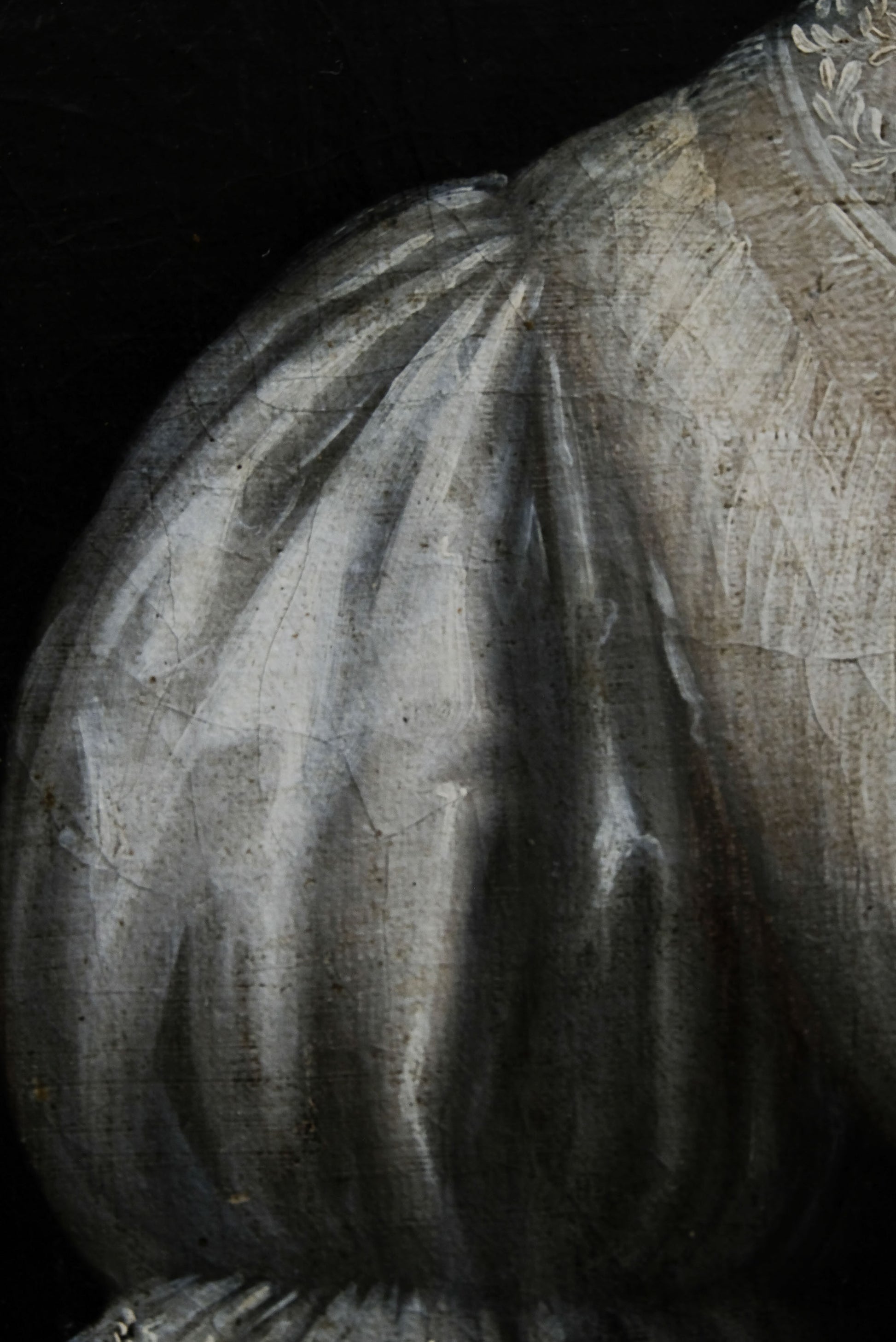 Half-length portrait of a lady, set against a dark background with a painted oval reserve, a format frequently adopted in Biedermeier portraiture. The sitter wears a white dress in light fabric, with short puffed sleeves embroidered with white floral motifs worked directly into the cloth, a refined detail much appreciated in contemporary fashion. The waist is tightened by a black belt with a rectangular buckle, typical of the years 1820–1830.