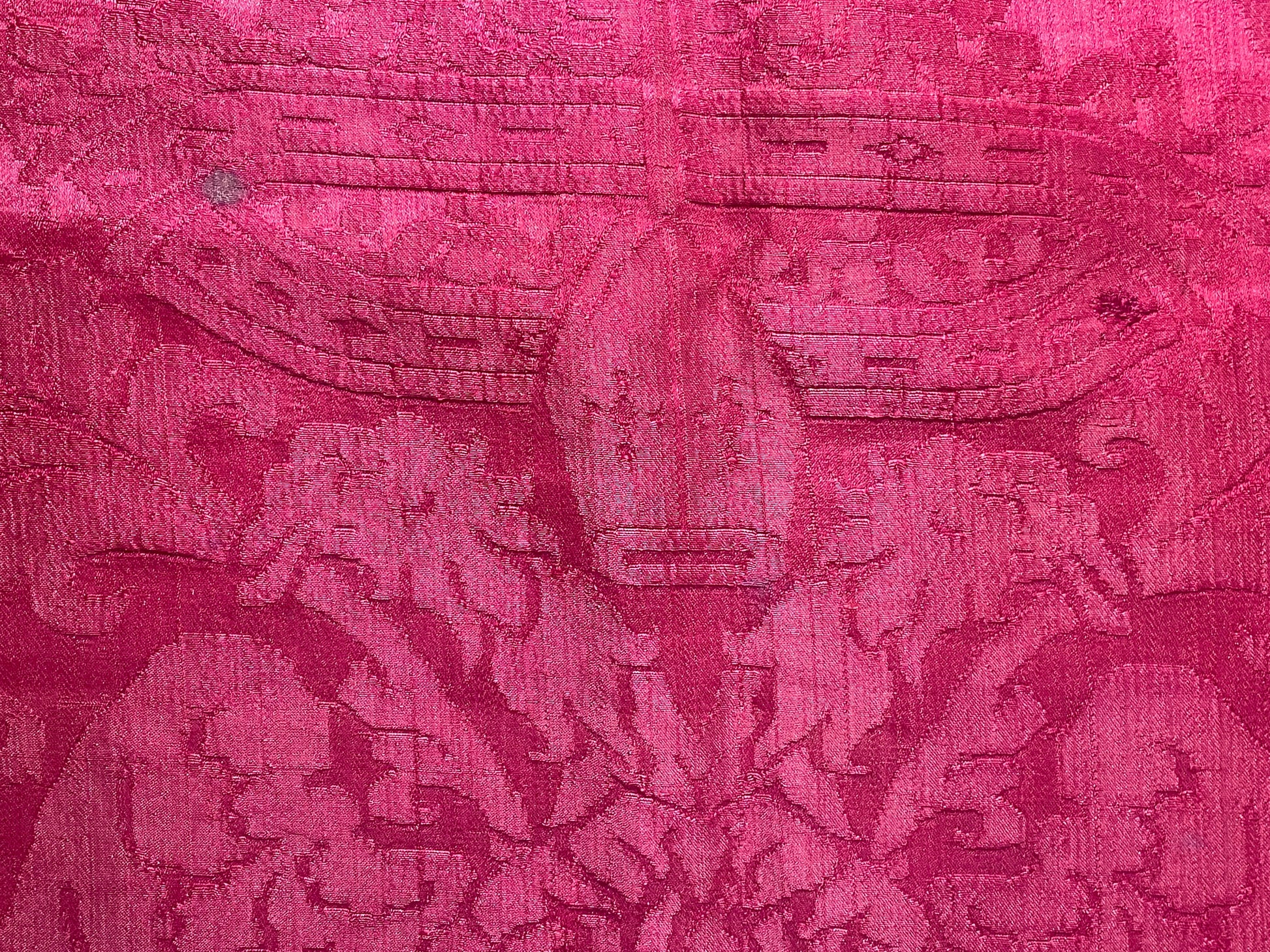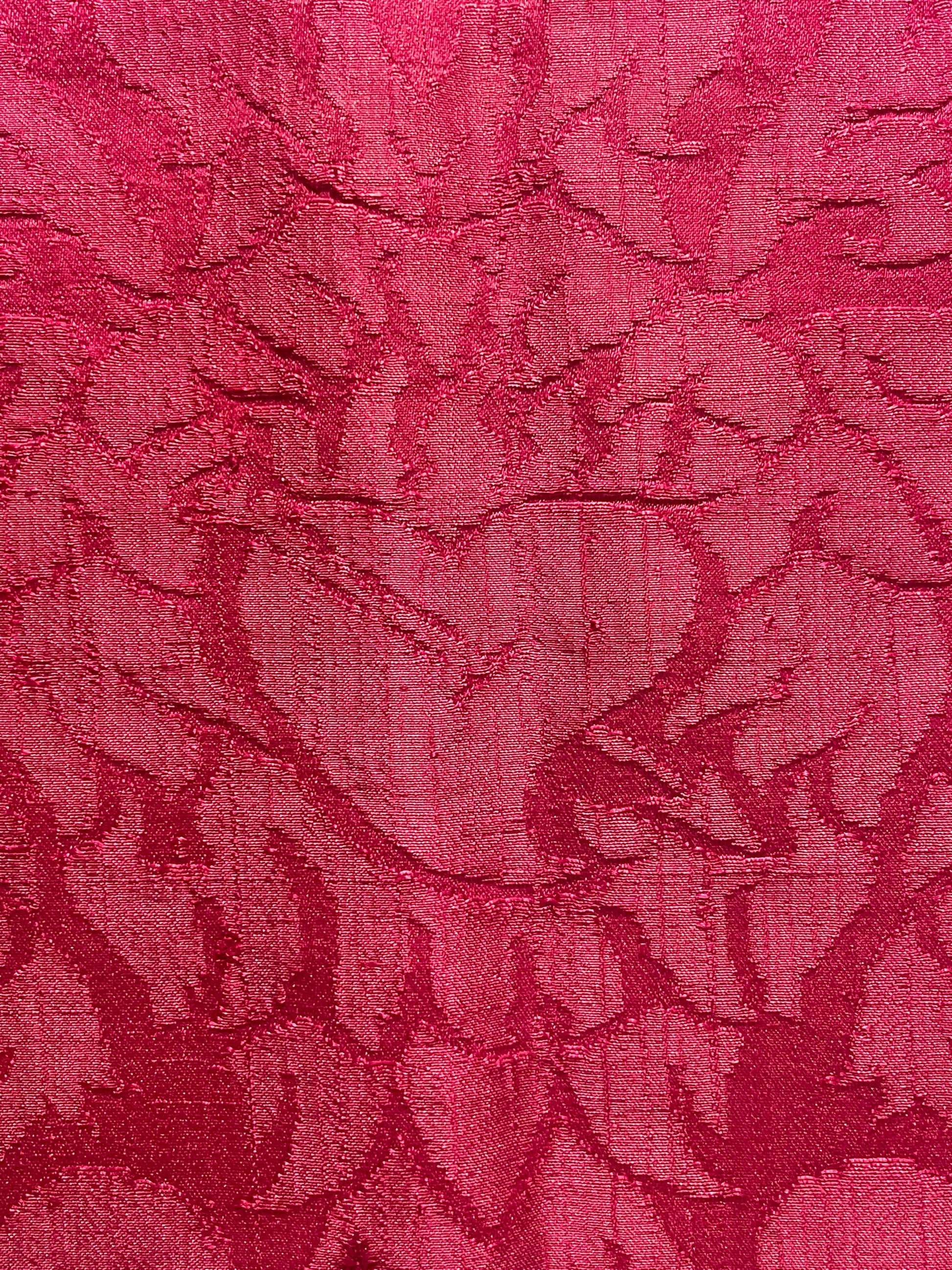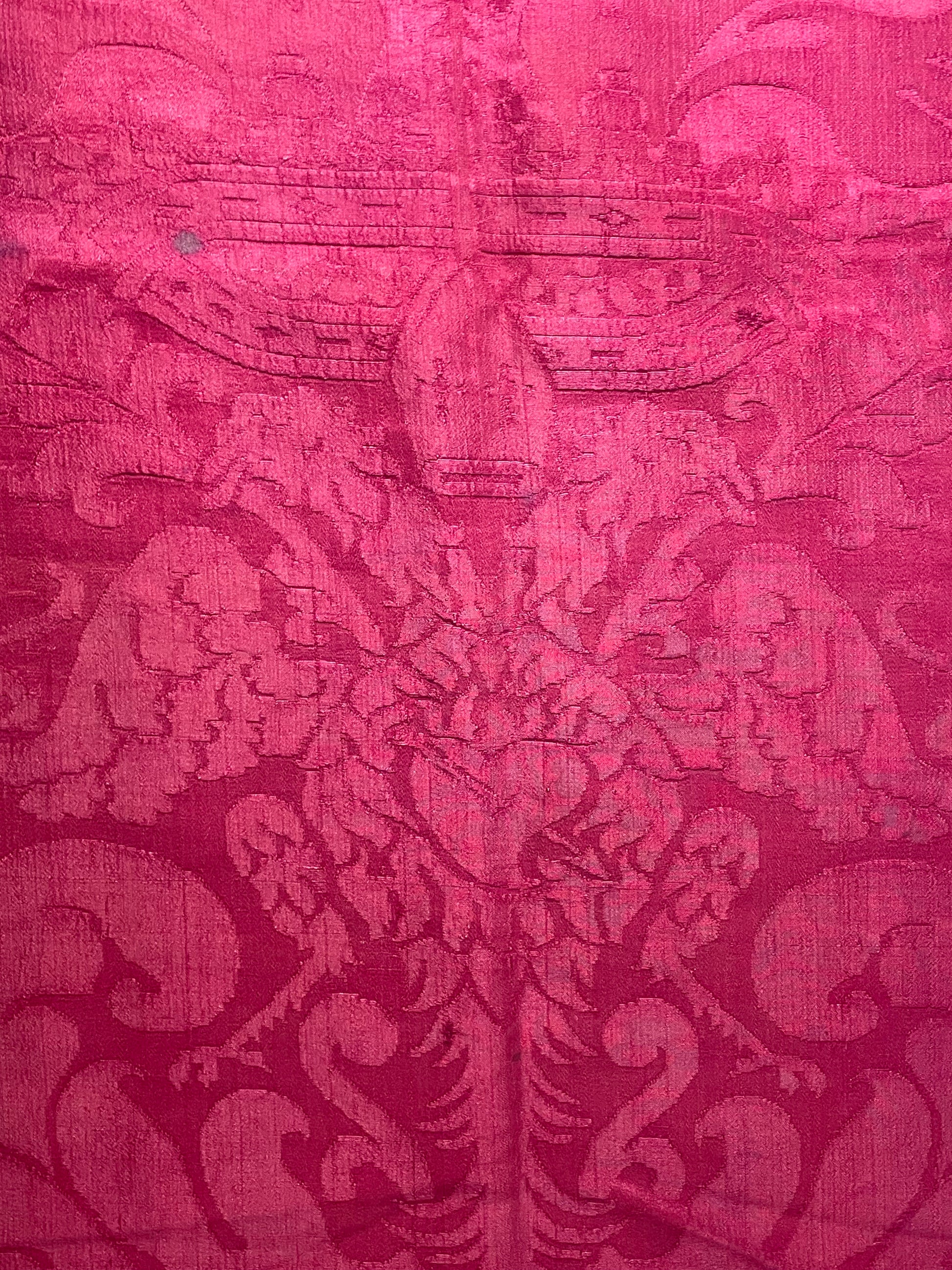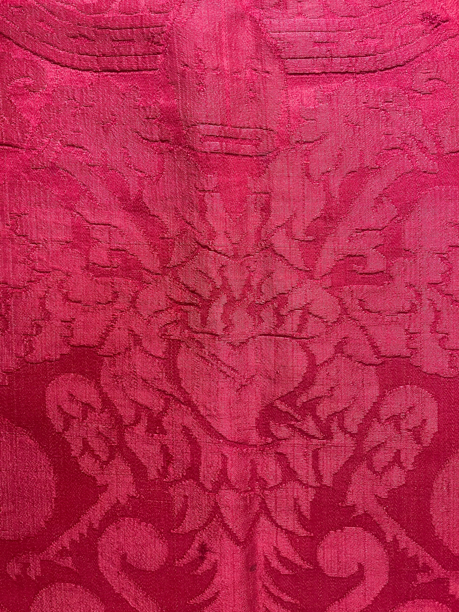 La tessitura è interamente in seta, priva di filati metallici, con un raffinato gioco di effetti tra fondo e disegno ottenuti attraverso variazioni di armatura. Il colore rosso intenso si presenta non sbiadito, con una saturazione ancora pienamente leggibile, segno di una buona qualità della tintura e di condizioni conservative favorevoli nel tempo.