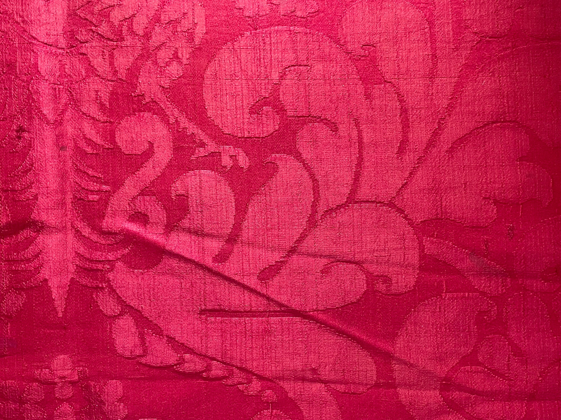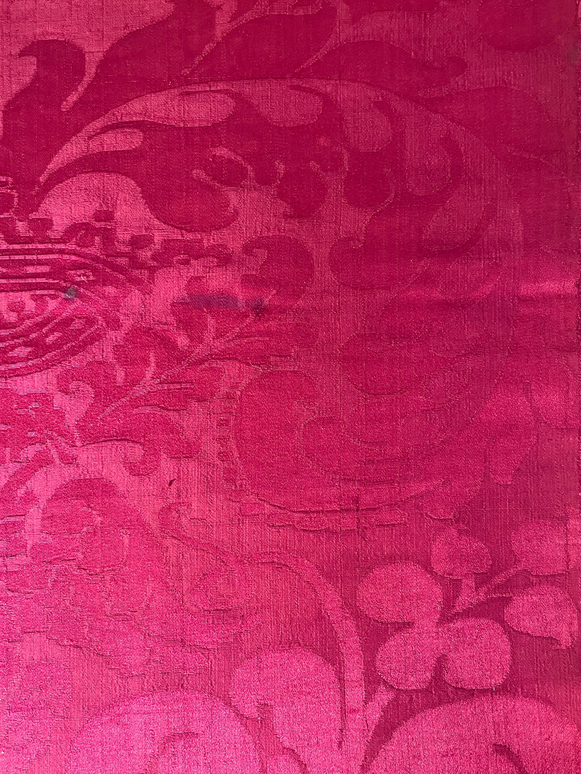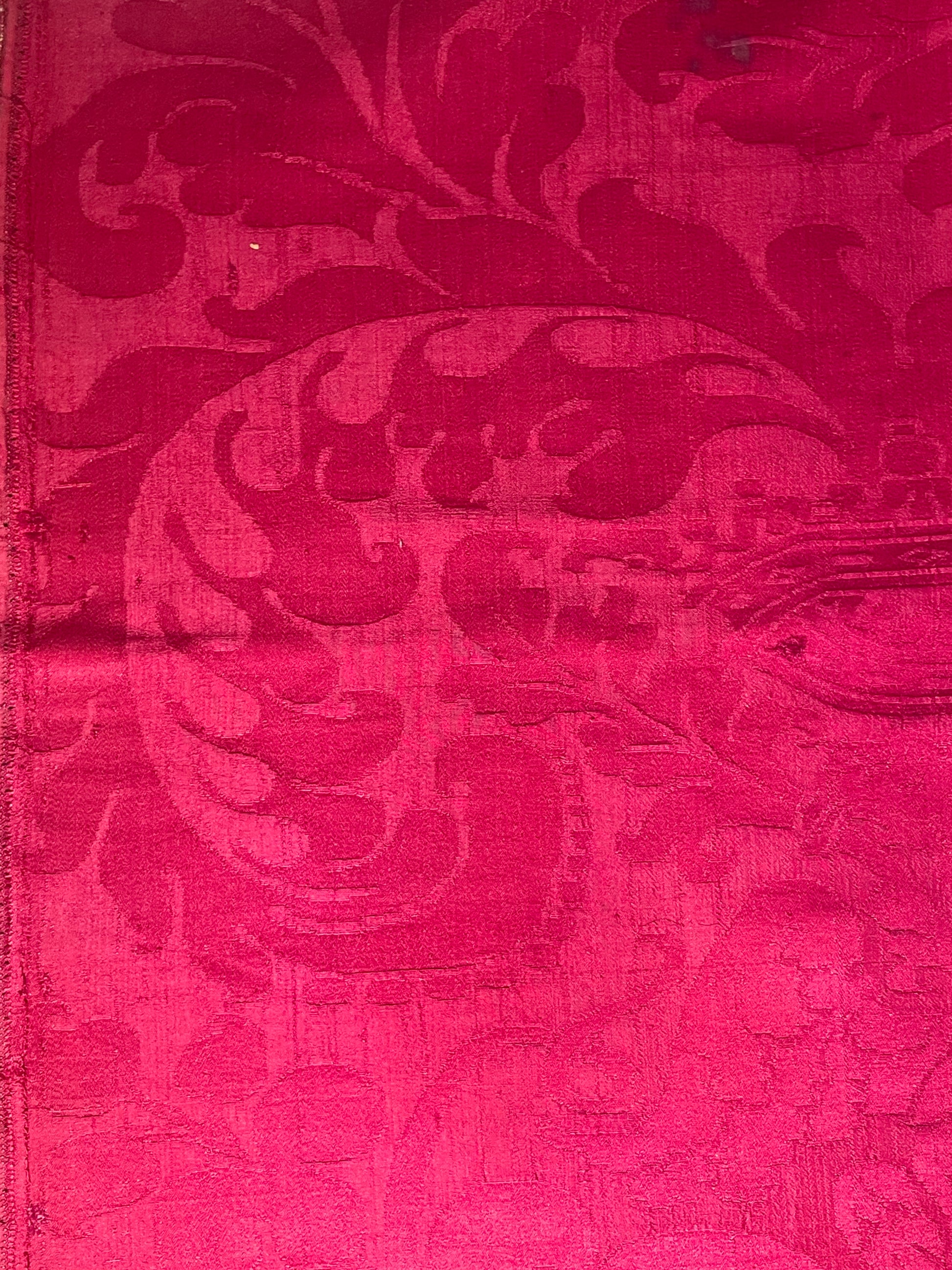 La tessitura è interamente in seta, priva di filati metallici, con un raffinato gioco di effetti tra fondo e disegno ottenuti attraverso variazioni di armatura. Il colore rosso intenso si presenta non sbiadito, con una saturazione ancora pienamente leggibile, segno di una buona qualità della tintura e di condizioni conservative favorevoli nel tempo.