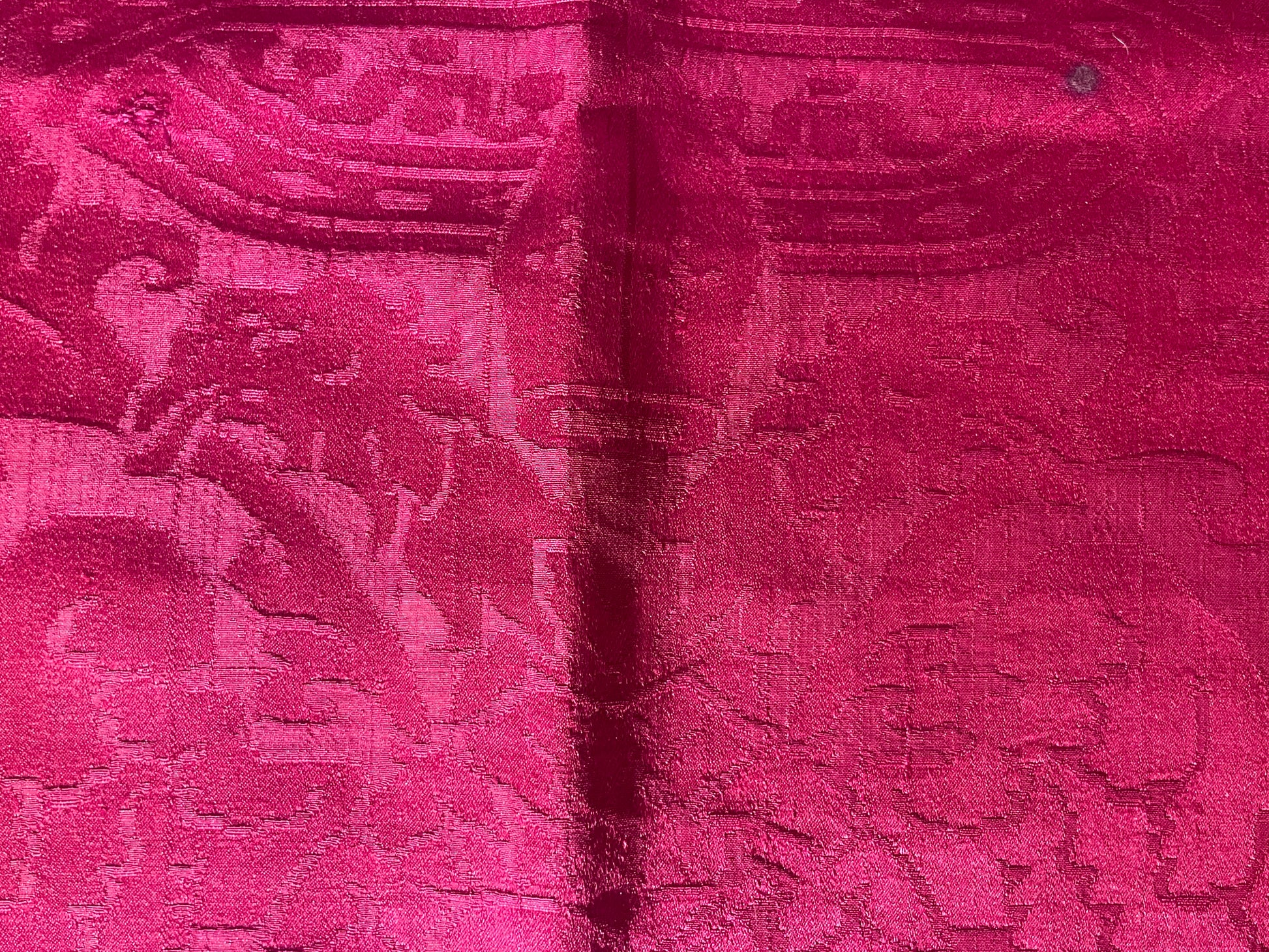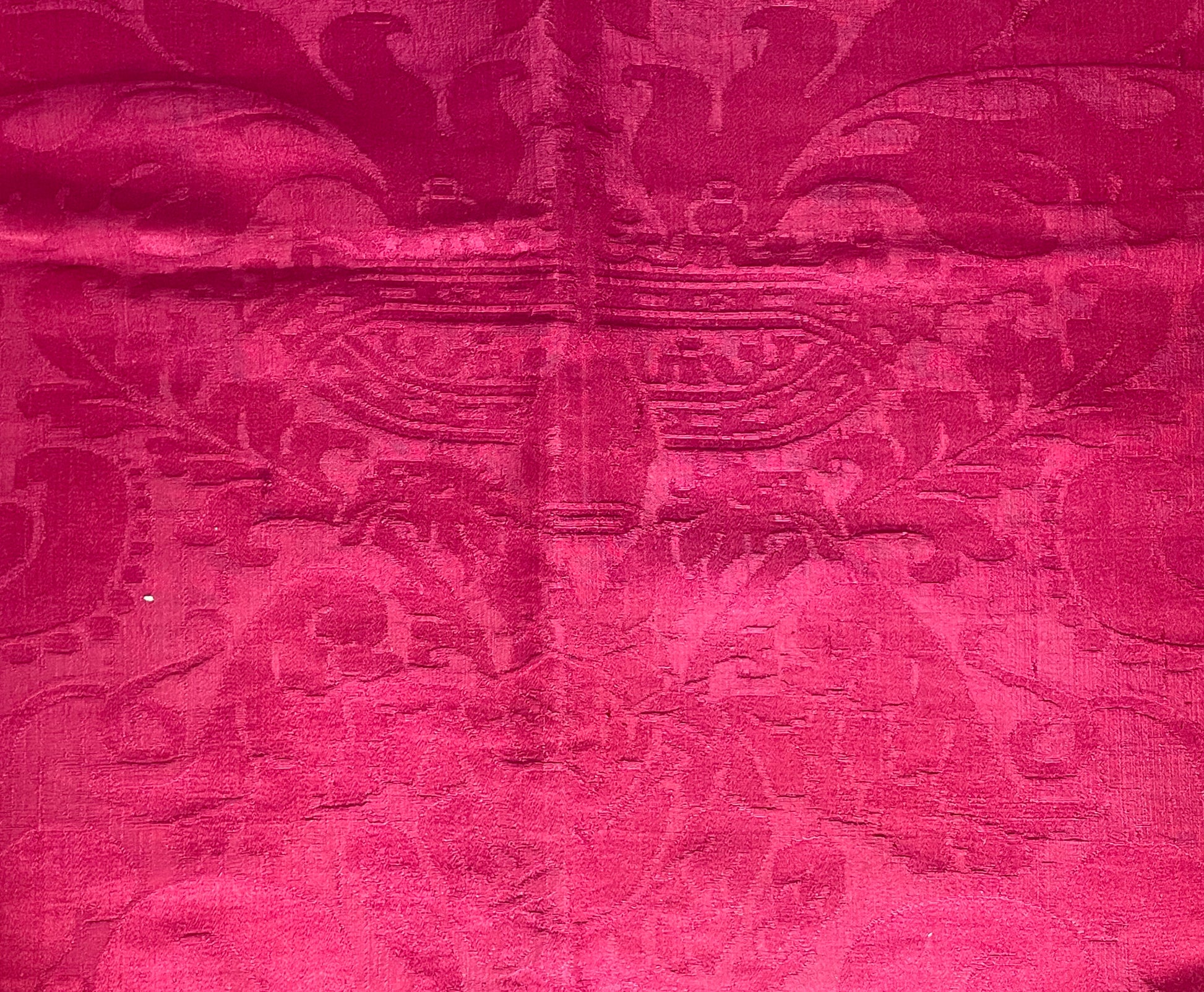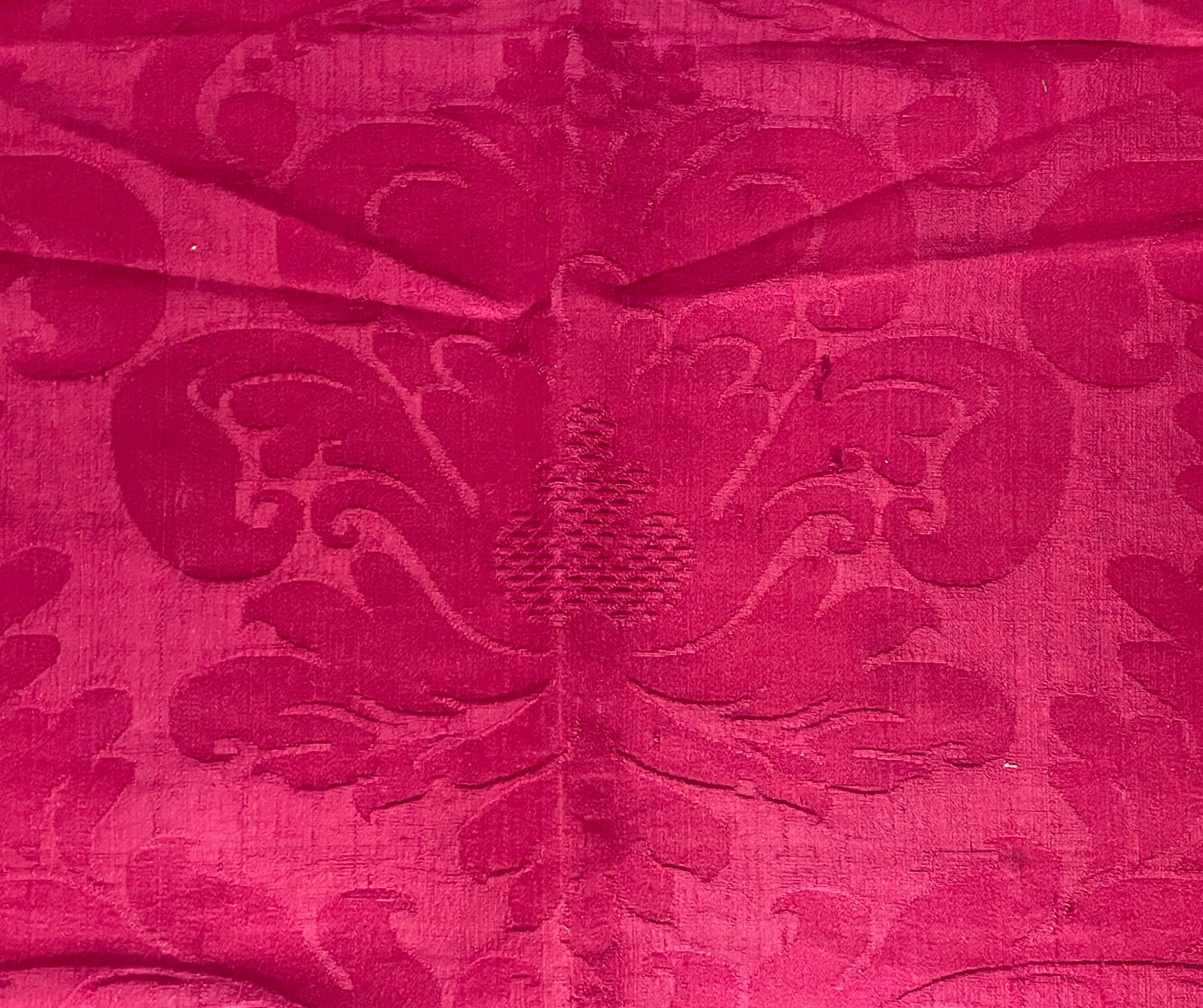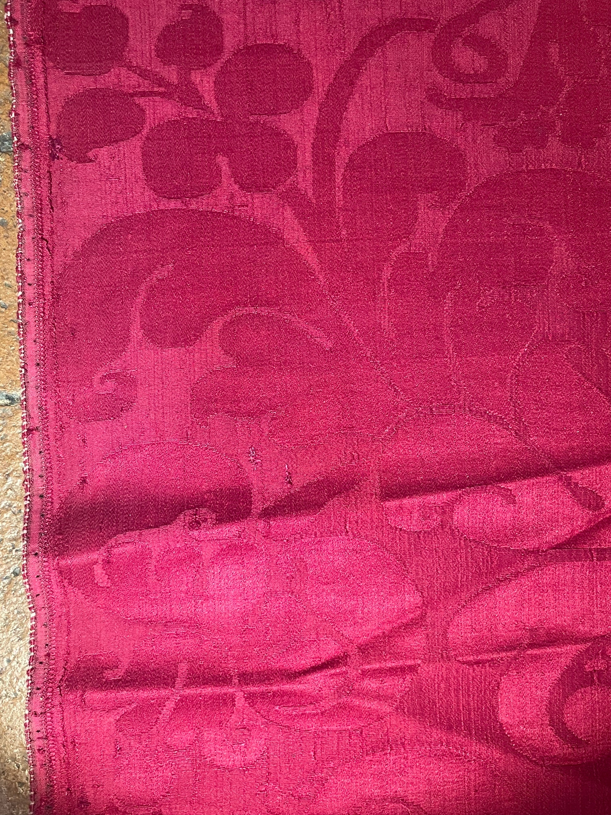 La tessitura è interamente in seta, priva di filati metallici, con un raffinato gioco di effetti tra fondo e disegno ottenuti attraverso variazioni di armatura. Il colore rosso intenso si presenta non sbiadito, con una saturazione ancora pienamente leggibile, segno di una buona qualità della tintura e di condizioni conservative favorevoli nel tempo.