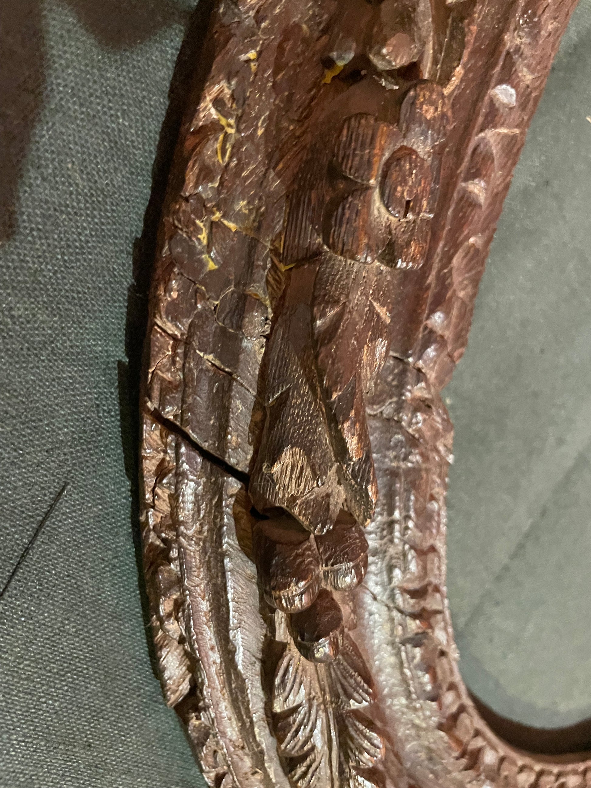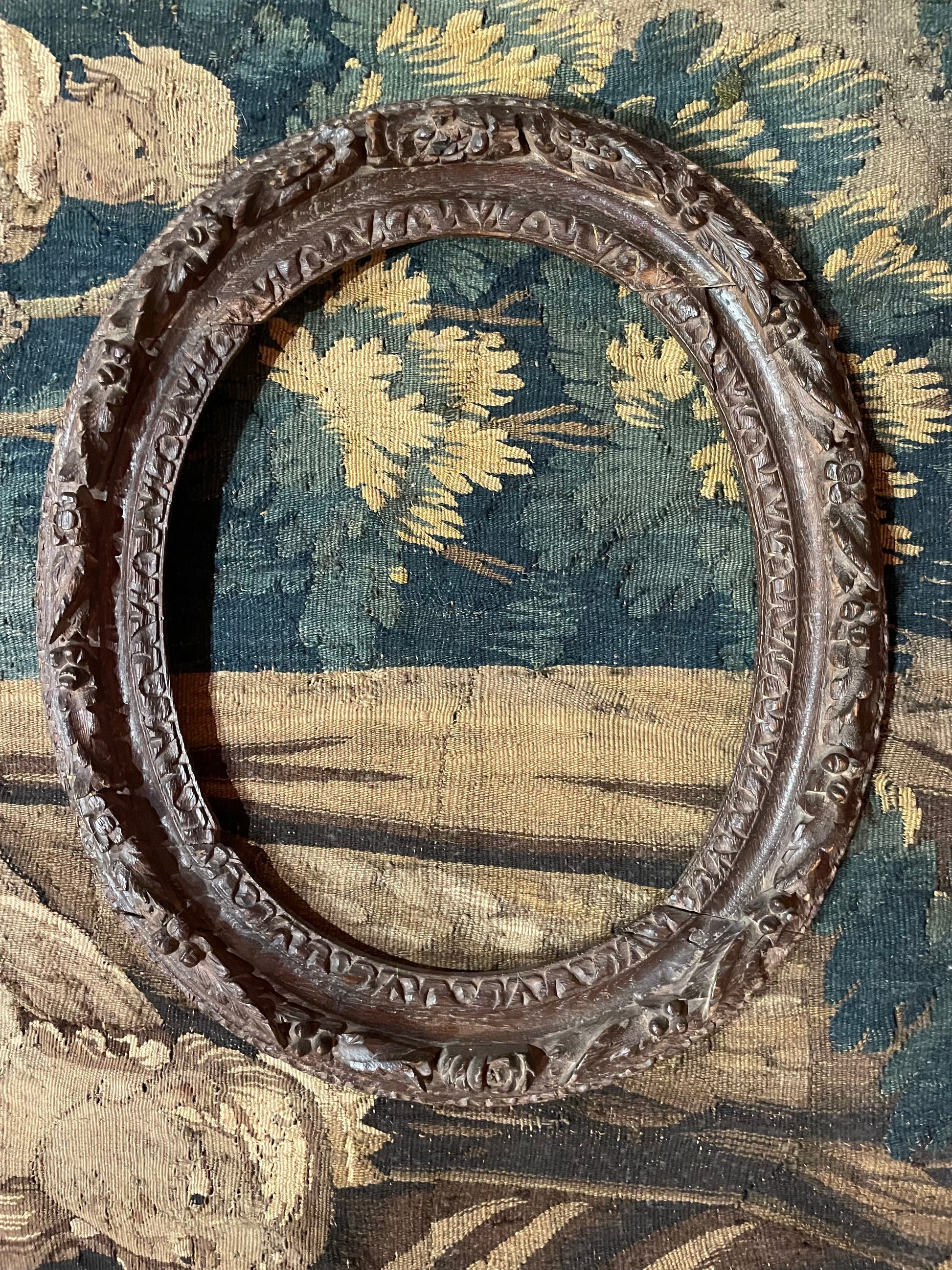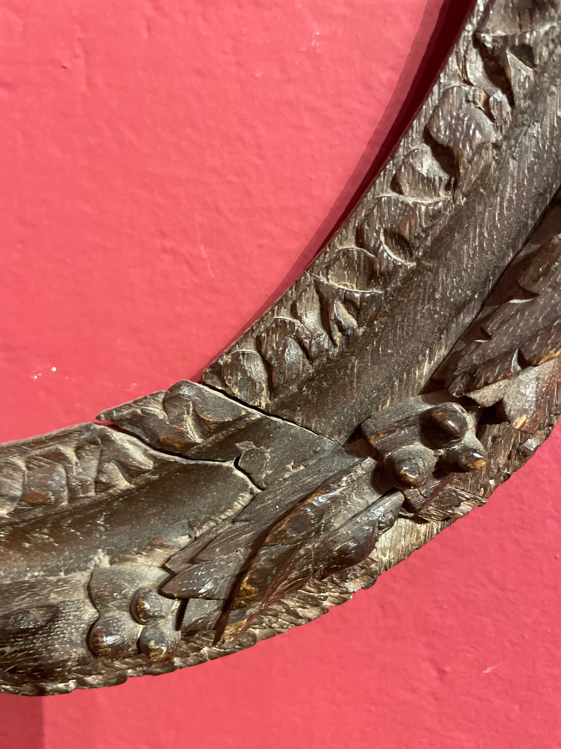 Cornice in rovere intagliato con motivi floreali, caratterizzata da un intaglio raffinato e di alta qualità, databile alla metà del XVIII secolo, periodo Luigi XV. Assemblata con pioli di legno secondo le tecniche costruttive tradizionali. Da restaurare: gli elementi intagliati presentano movimenti nei punti di assemblaggio e necessitano di fissaggio e consolidamento strutturale mediante incollaggio mirato.