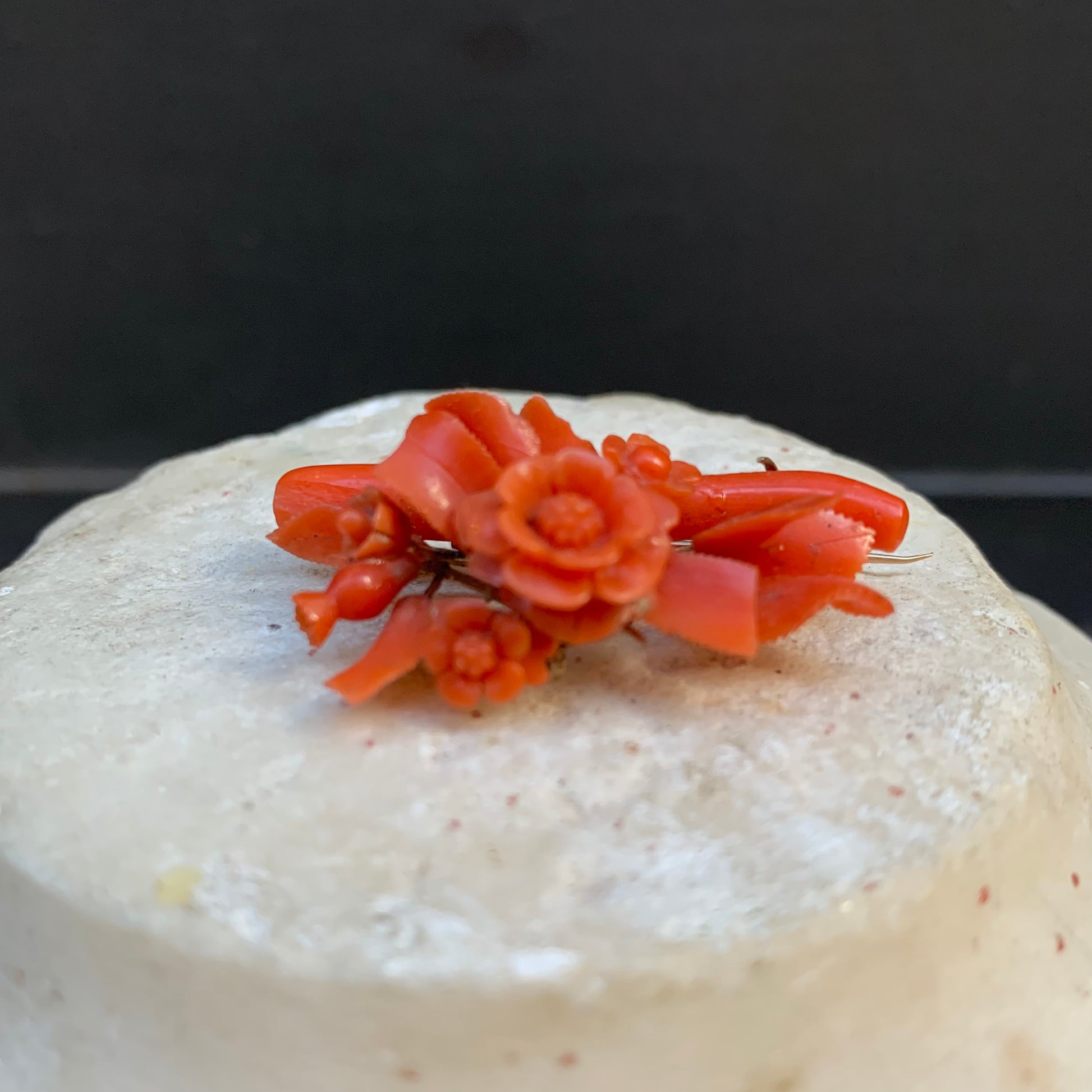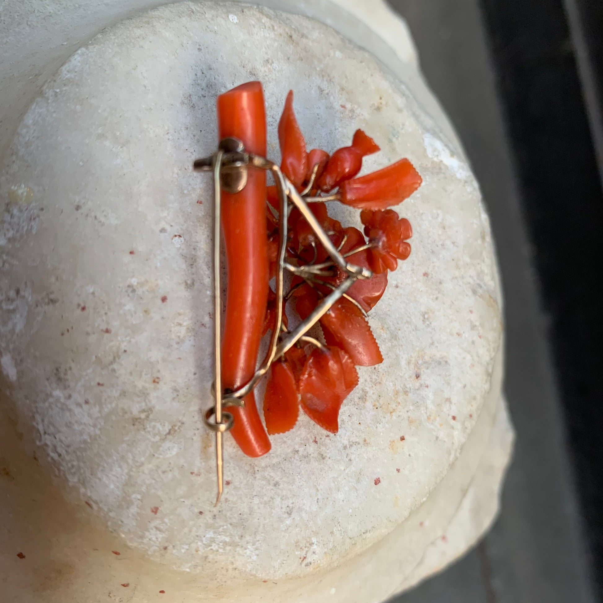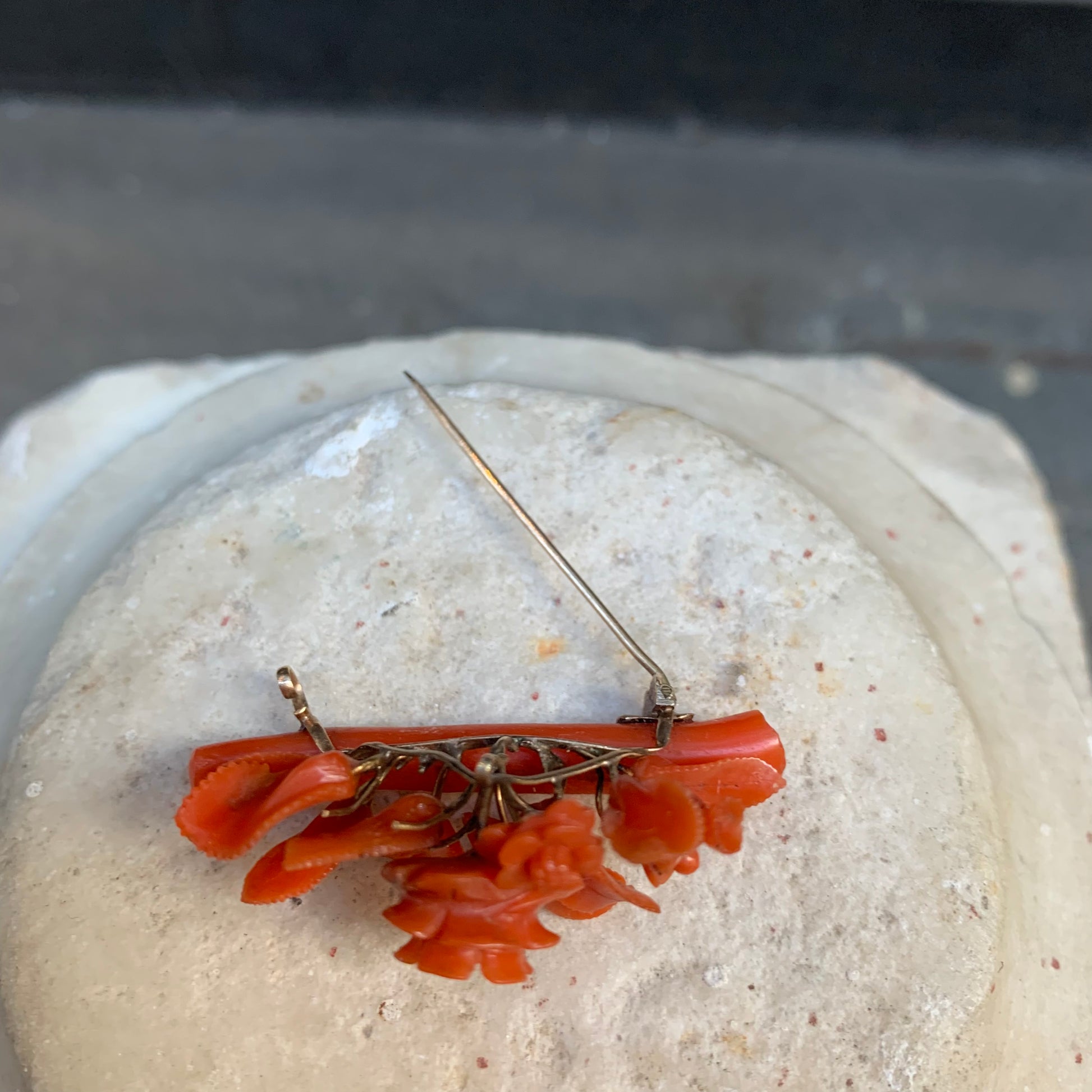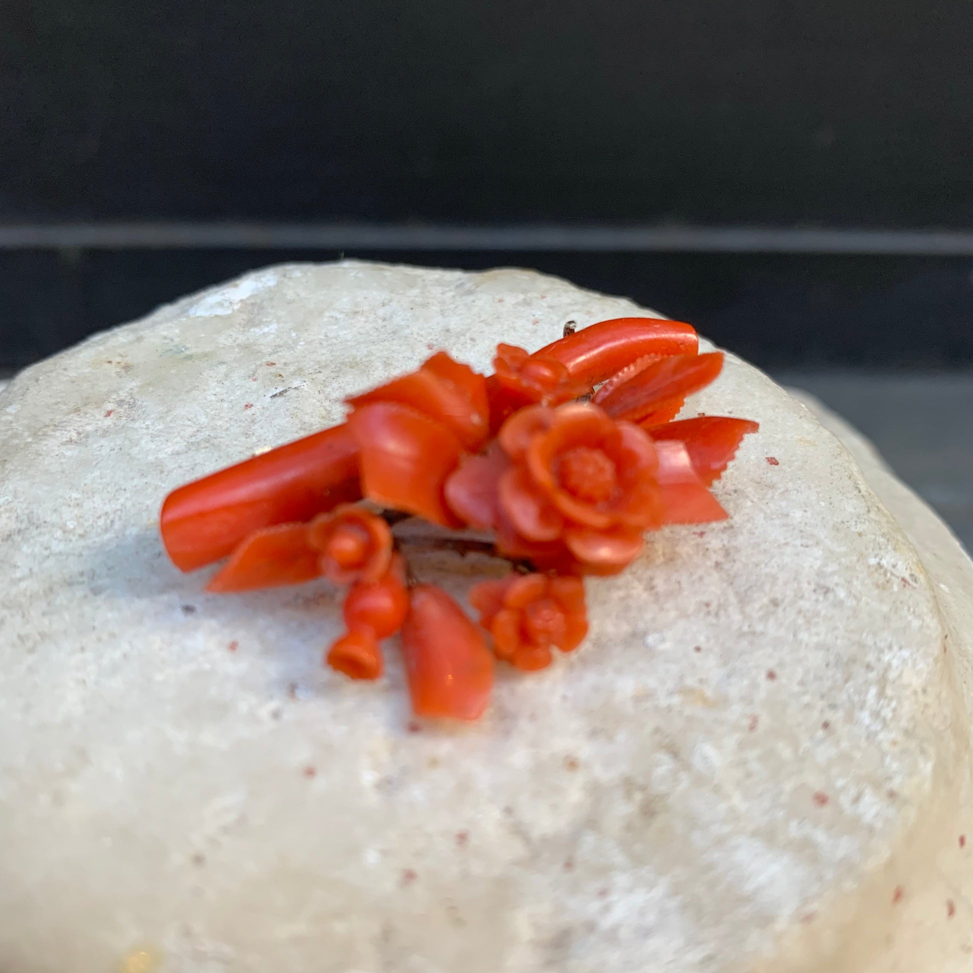The "flowers and fruits" style responds to the naturalistic romantic trend of mid-19th century fashion, continuing with small variations until the Art Nouveau era. Sciacca coral was often used, available at the time at reasonable prices and in large quantities. The technique with small flowers, leaves and flowers also made it possible to exploit the smallest pieces of coral. These small coral bouquets are composed of small elements, hand-made in series, they are fixed to very thin gold pins, which were welded together. This technique is slightly later than the technique where pieces of coral were fixed with sealing wax to a saucer with a central pin.