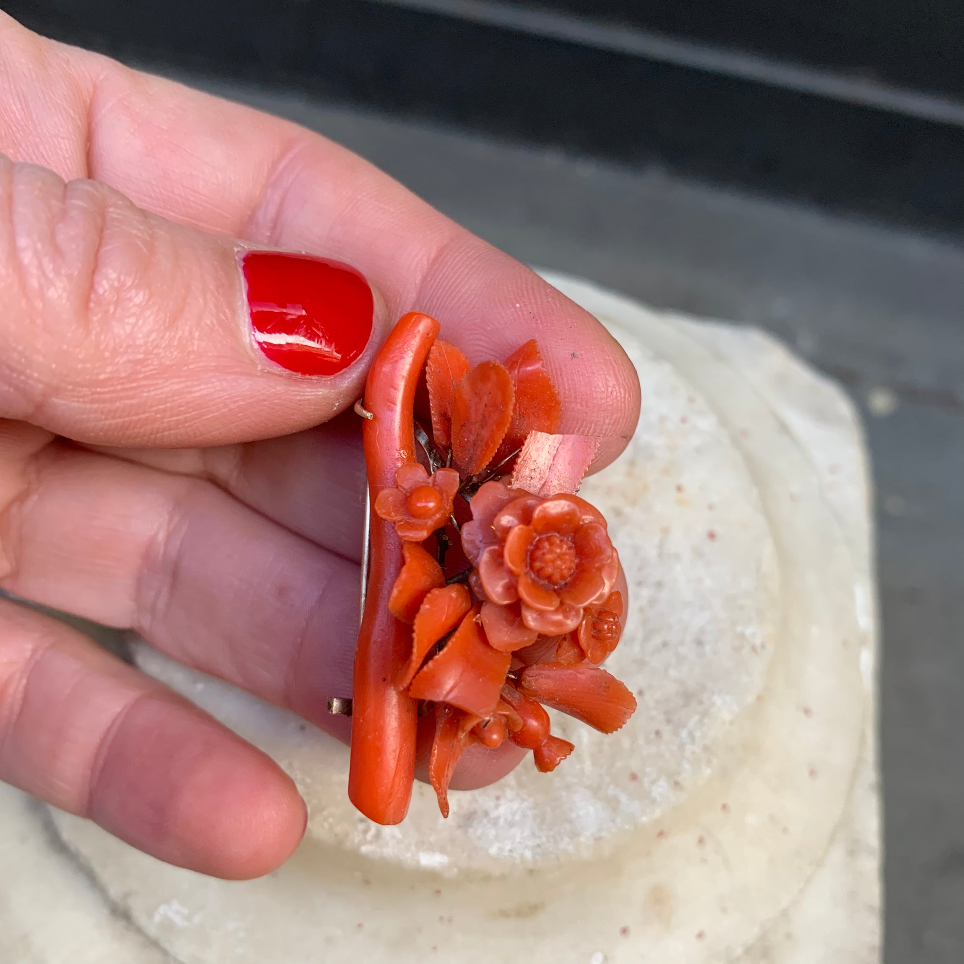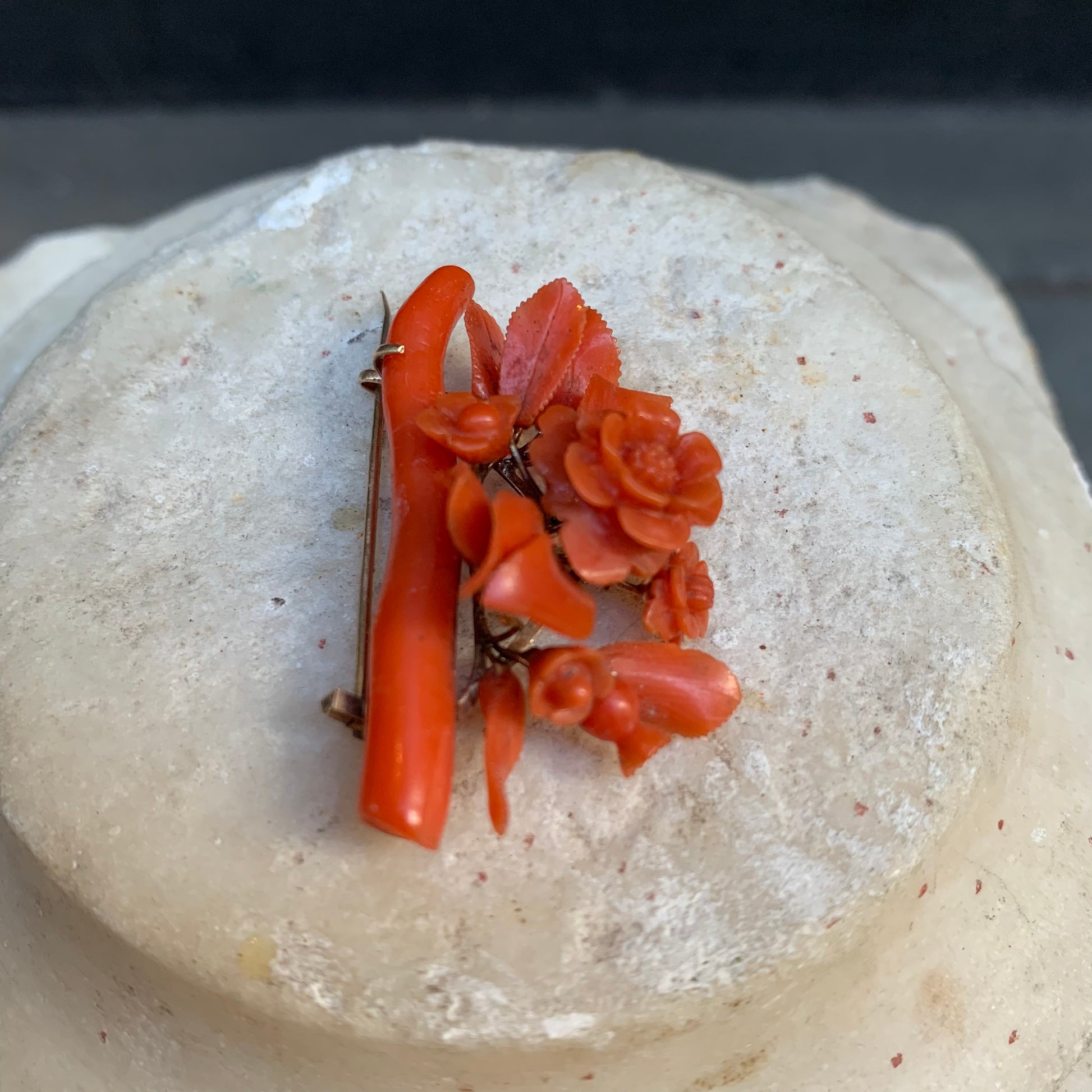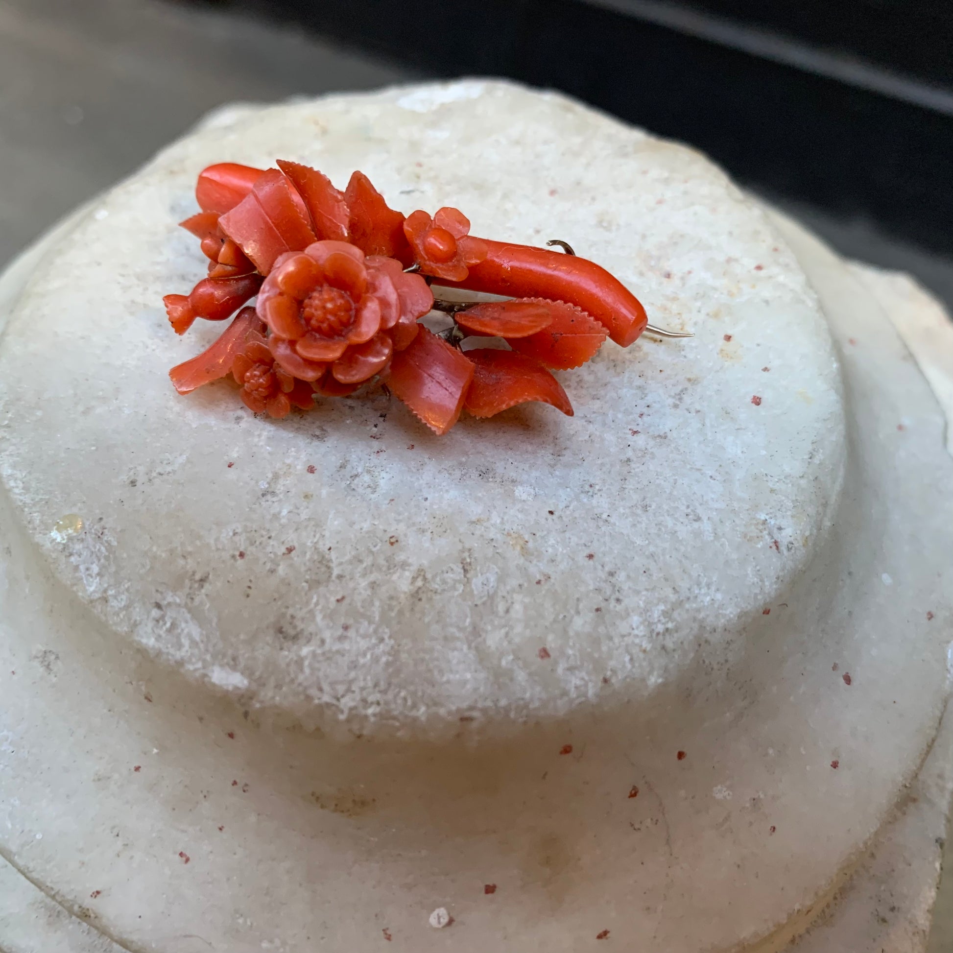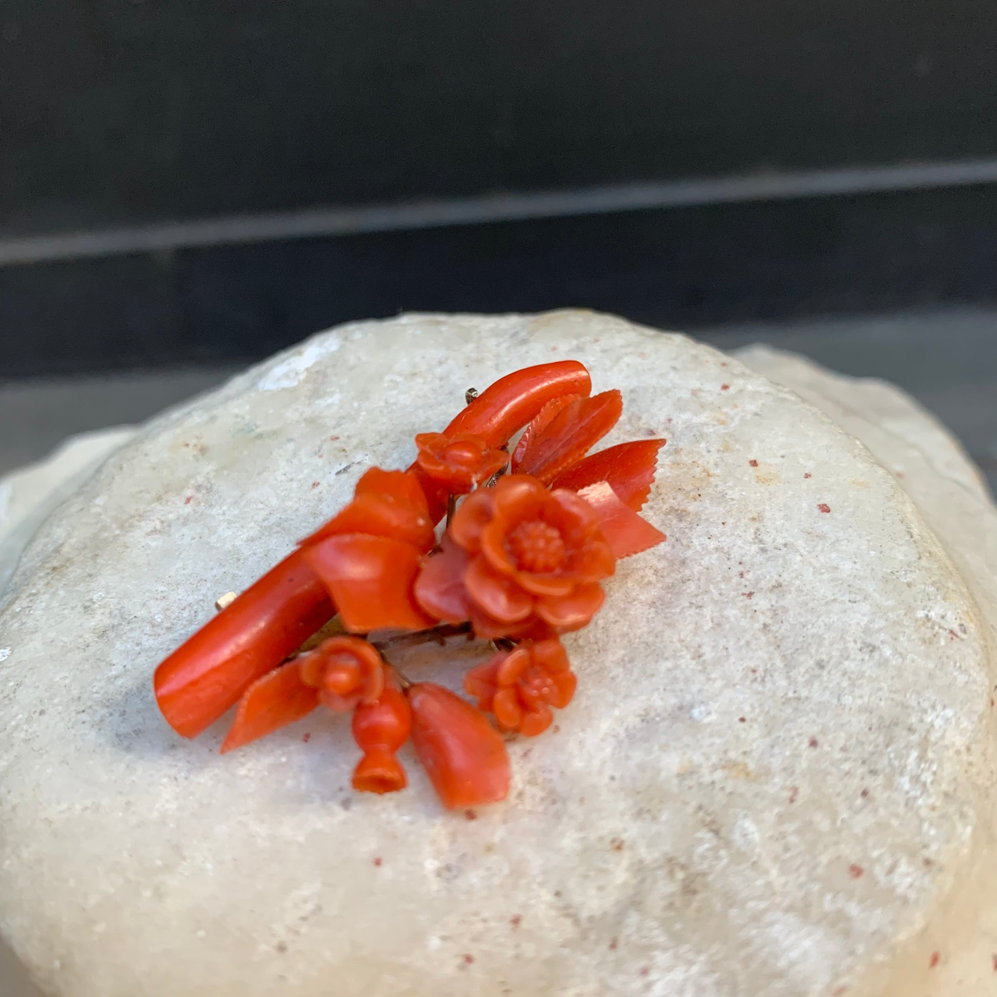 The "flowers and fruits" style responds to the naturalistic romantic trend of mid-19th century fashion, continuing with small variations until the Art Nouveau era. Sciacca coral was often used, available at the time at reasonable prices and in large quantities. The technique with small flowers, leaves and flowers also made it possible to exploit the smallest pieces of coral. These small coral bouquets are composed of small elements, hand-made in series, they are fixed to very thin gold pins, which were welded together. This technique is slightly later than the technique where pieces of coral were fixed with sealing wax to a saucer with a central pin.