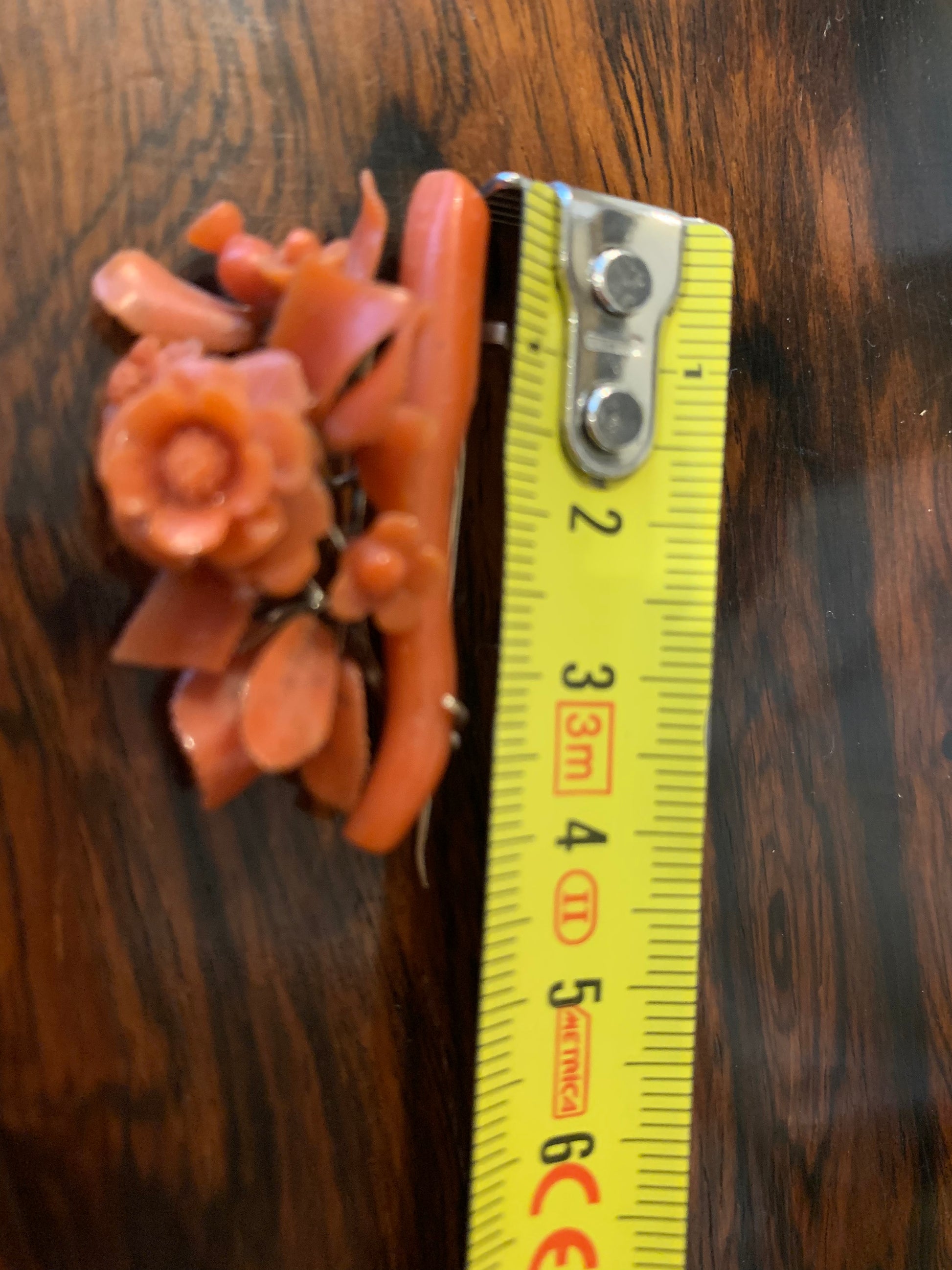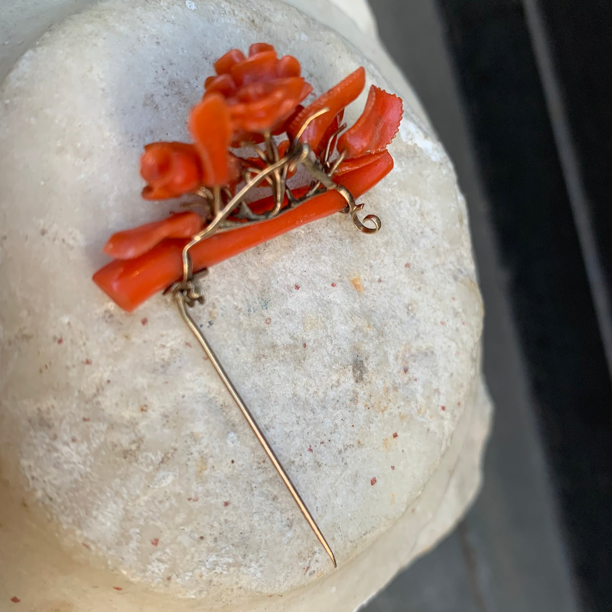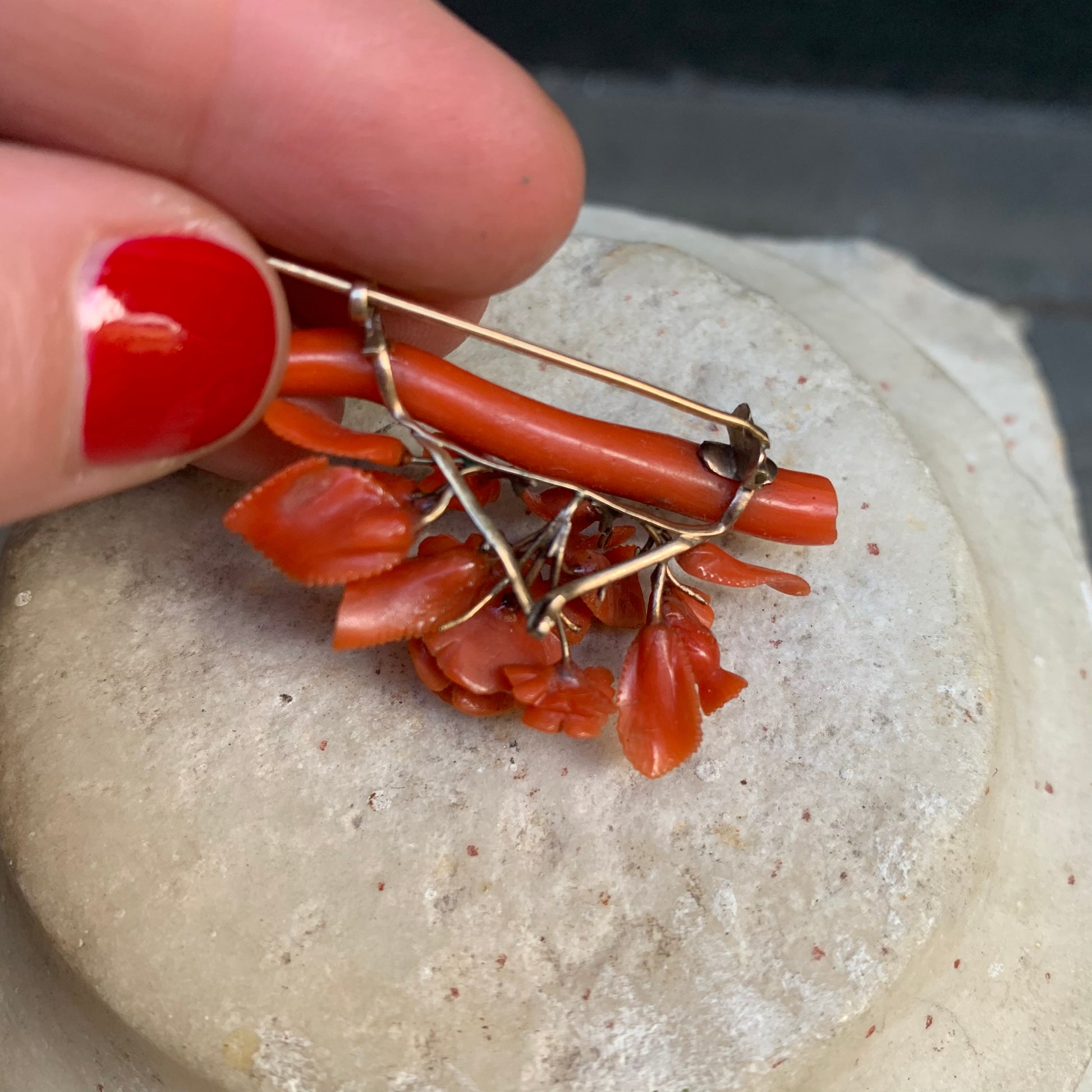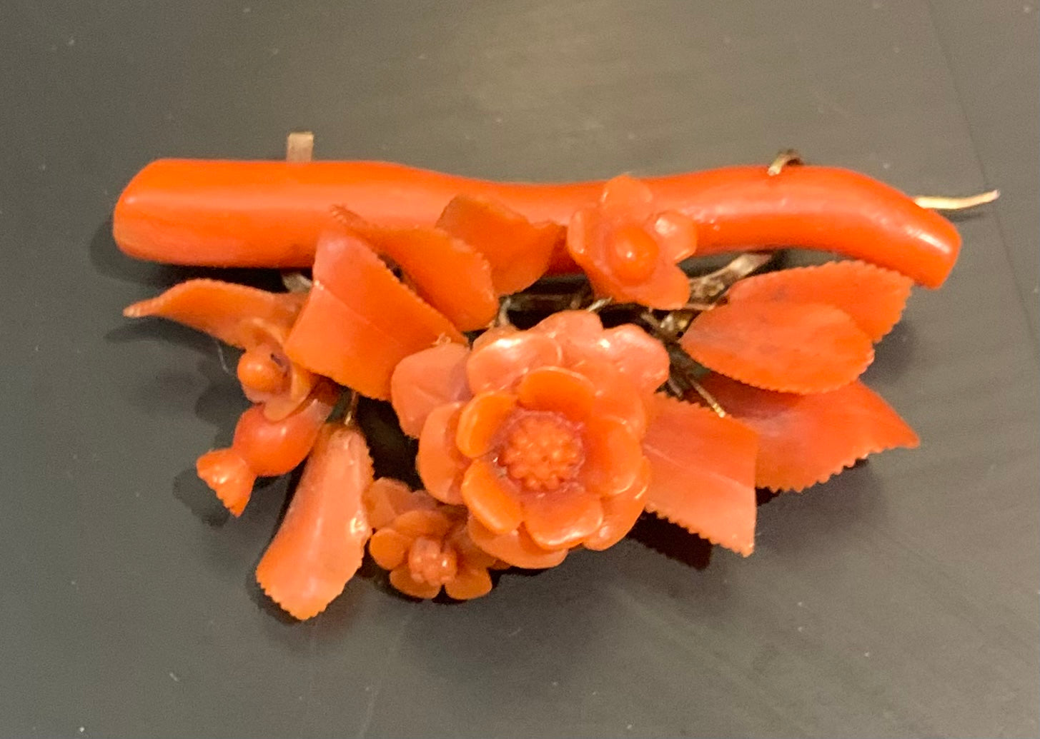 The "flowers and fruits" style responds to the naturalistic romantic trend of mid-19th century fashion, continuing with small variations until the Art Nouveau era. Sciacca coral was often used, available at the time at reasonable prices and in large quantities. The technique with small flowers, leaves and flowers also made it possible to exploit the smallest pieces of coral. These small coral bouquets are composed of small elements, hand-made in series, they are fixed to very thin gold pins, which were welded together. This technique is slightly later than the technique where pieces of coral were fixed with sealing wax to a saucer with a central pin.
