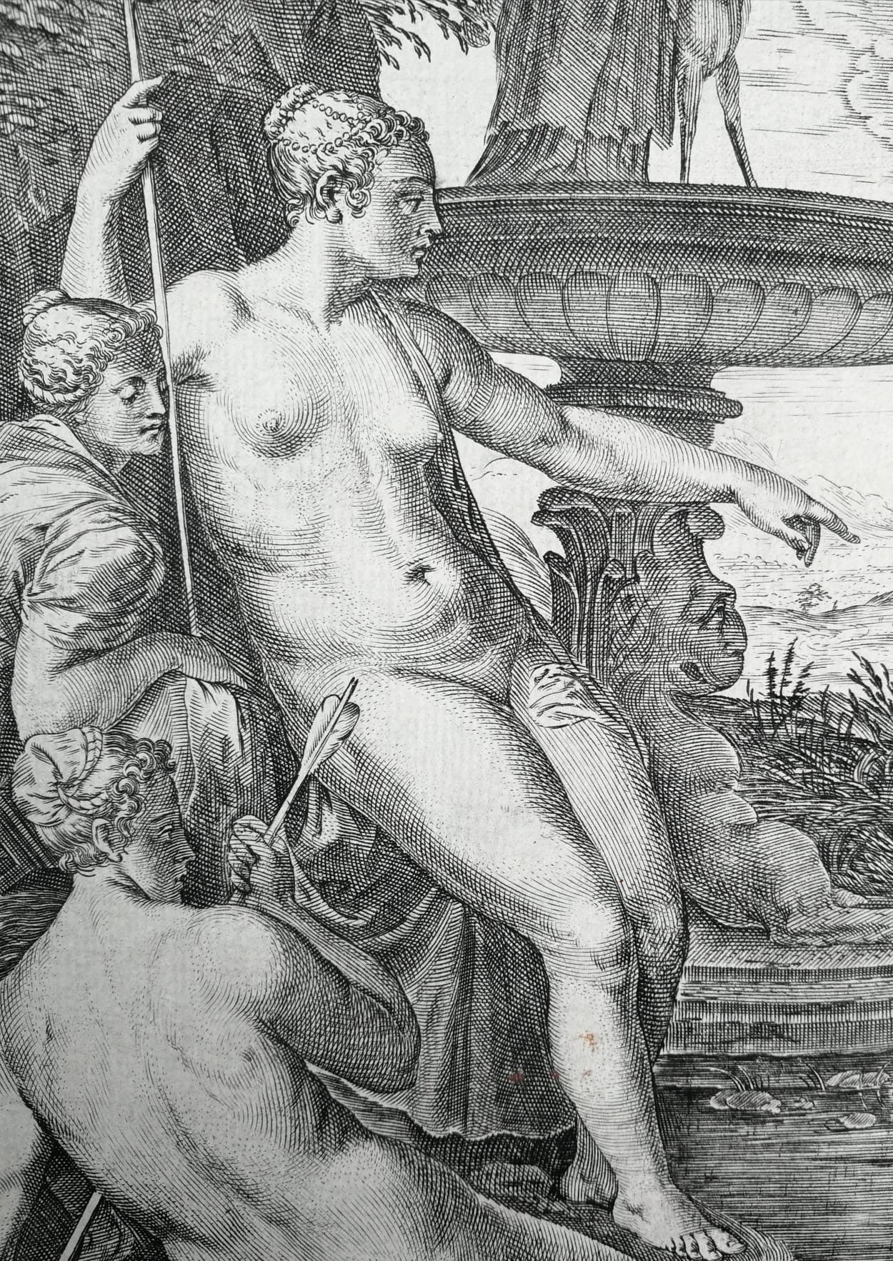 Already praised in the 17th century: Ridolfi (1648) described it as “il bagno di Calisto con molte ninfe”, and Boschini (1660) celebrated the scene in verse in his Carta del navegar pittoresco, noting Titian’s admiration for Cort’s translation into print.