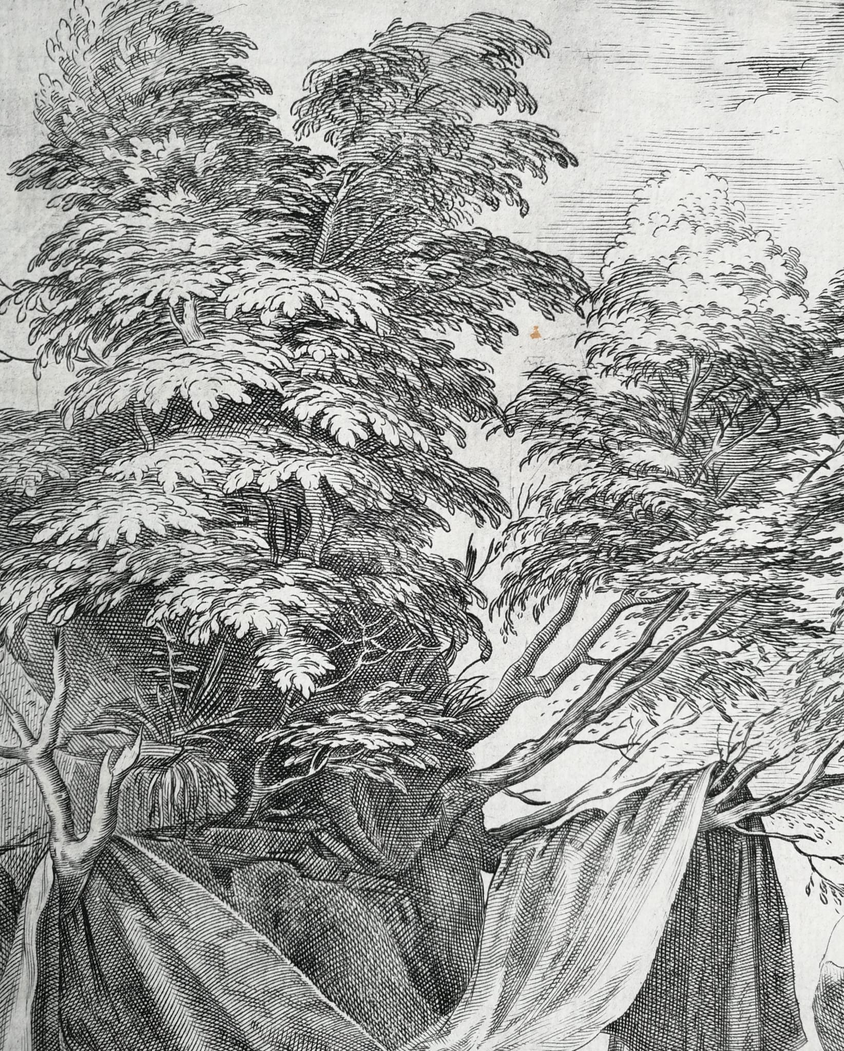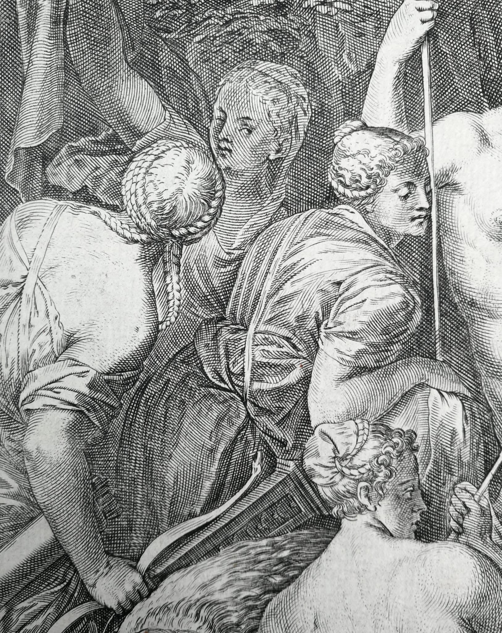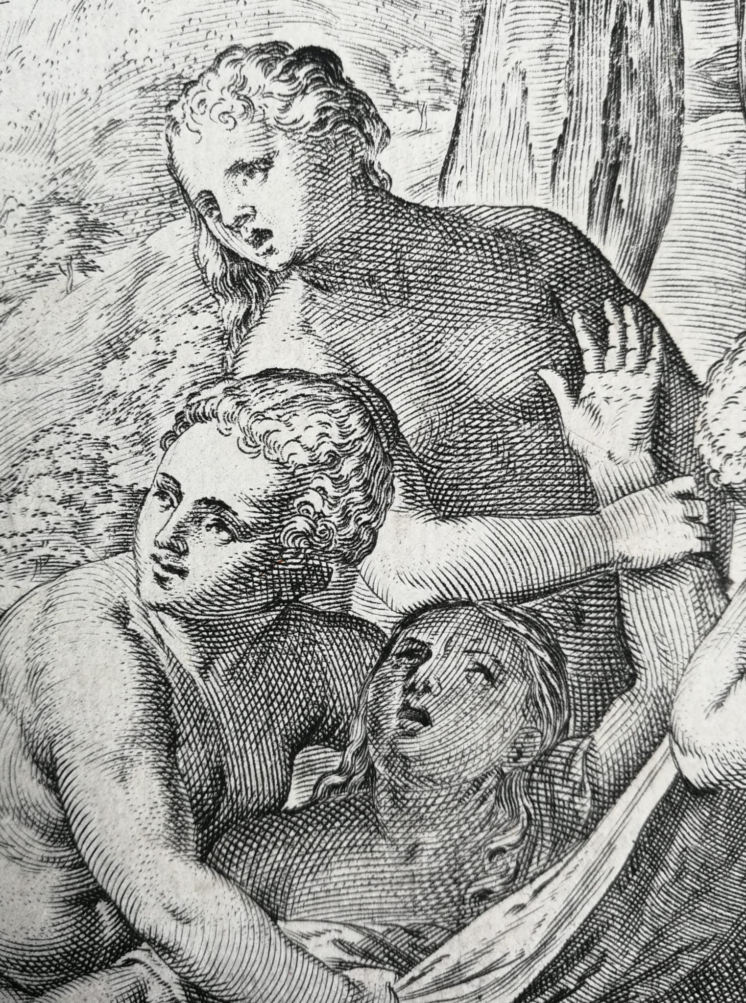 Engraved in Venice in 1566, when Cornelis Cort was living in Titian’s household. Their collaboration was direct and reciprocal: Titian provided the inventions and drawings, while Cort translated them into engraving with painterly effects capable of echoing the master’s use of light and color.