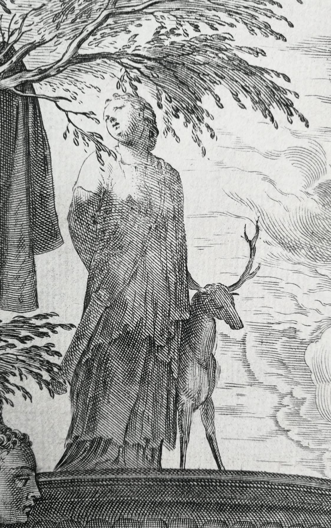 The scene, from Ovid’s Metamorphoses, depicts Diana and her nymphs unveiling Callisto’s pregnancy. At the center stands the fountain with the goddess’s statue and the stag, emblem of the hunt.