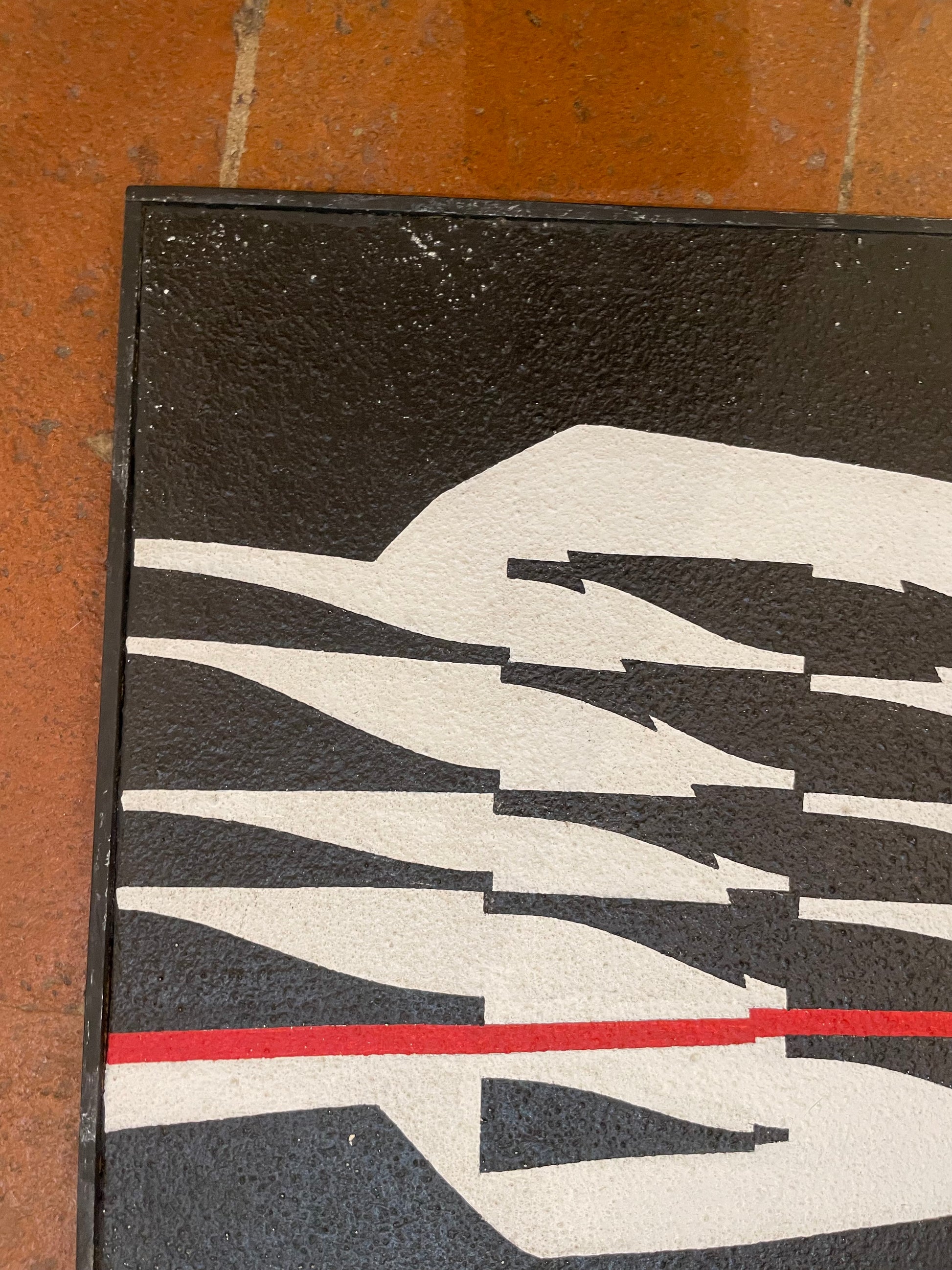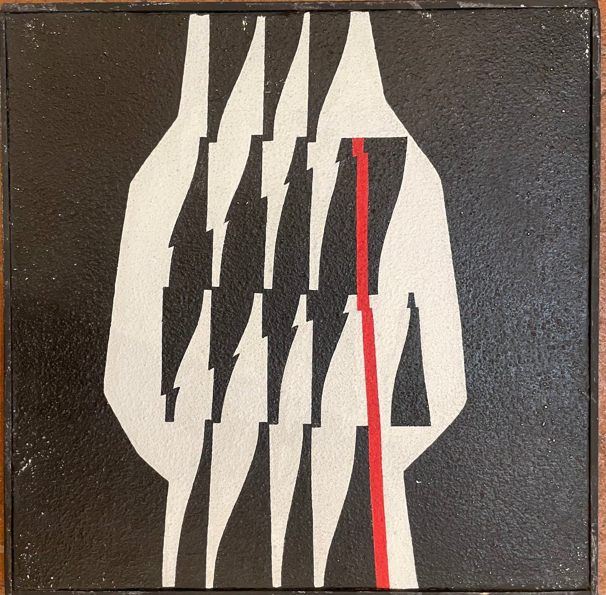 Realizzata in acrilico su tavola (35 × 35 cm), la composizione si sviluppa attraverso precisi campi bianchi e neri intersecati da assi lineari rossi. L'equilibrio di questi elementi produce una sottile instabilità visiva, una tensione ottica che cambia man mano che lo sguardo dell'osservatore si sposta sulla superficie: il fenomeno che Sirello ha definito "percezione anisotropica".