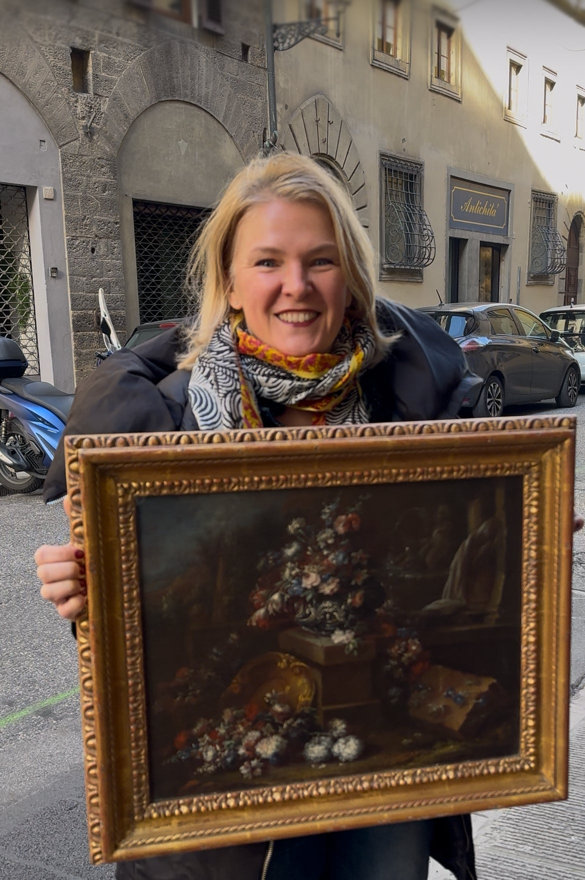 Lo sfondo presenta un giardino all'italiana con cipressi, terrazze e balaustre in pietra. Questo vocabolario riecheggia da vicino le opere conservate al Kunsthistorisches Museum di Vienna (inv. GG 1658, 1662, 1664), tutte attribuite a Lopez. Sebbene di dimensioni maggiori, questi dipinti condividono la stessa disposizione orizzontale, cieli luminosi simili e gli stessi elementi architettonici abbinati a ampie cascate floreali. Questi parallelismi forniscono un supporto sostanziale all'attribuzione.