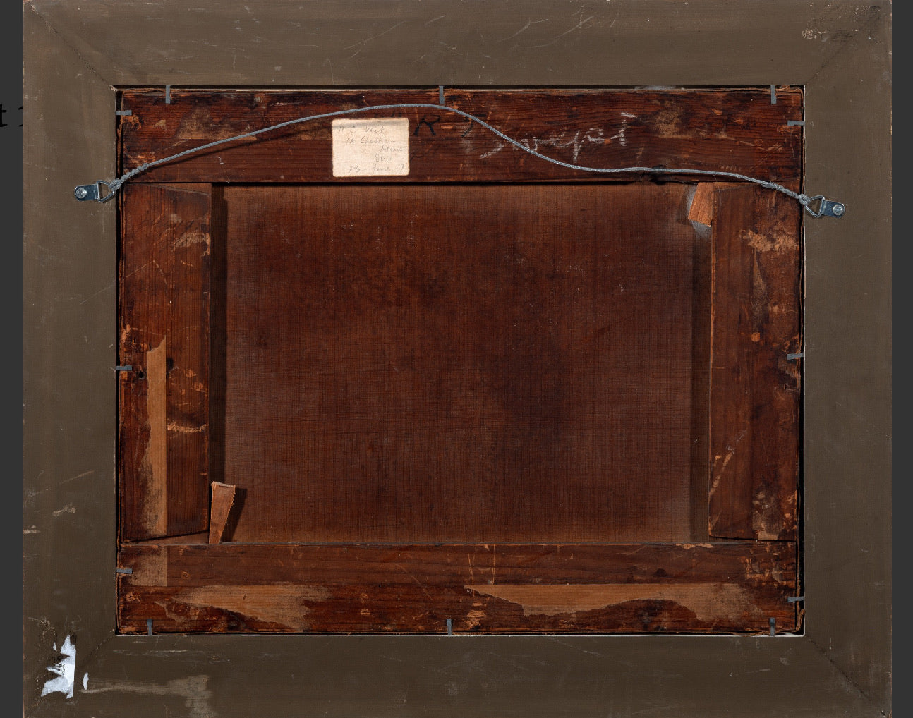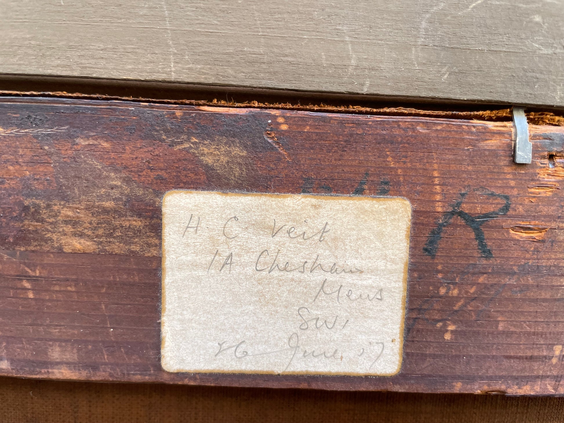 Un'etichetta manoscritta sul retro, datata 16 giugno 1957 e recante l'indirizzo di Londra 1A Chesham Mews, SW1, identifica l'ex proprietà di Henri C. "Harry" Veit (1925–2012): cittadino americano, ingegnere formatosi a Princeton, veterano della Marina statunitense e nipote del pittore orientalista francese Maurice Bompard. Negli anni '50 Veit visse e lavorò a Londra, svolgendo incarichi internazionali per la US Steel Corporation; l'etichetta conferma che il dipinto apparteneva alla sua collezione privata in quegli anni. La coppia riapparve in seguito a New York, sempre proveniente dalla stessa collezione di famiglia.