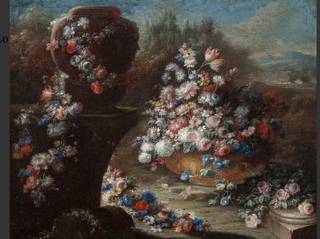 Gaspare Lopez, attribuzione Natura morta con grande vaso e cascata di fiori in un giardino, Napoli, c. 1720
