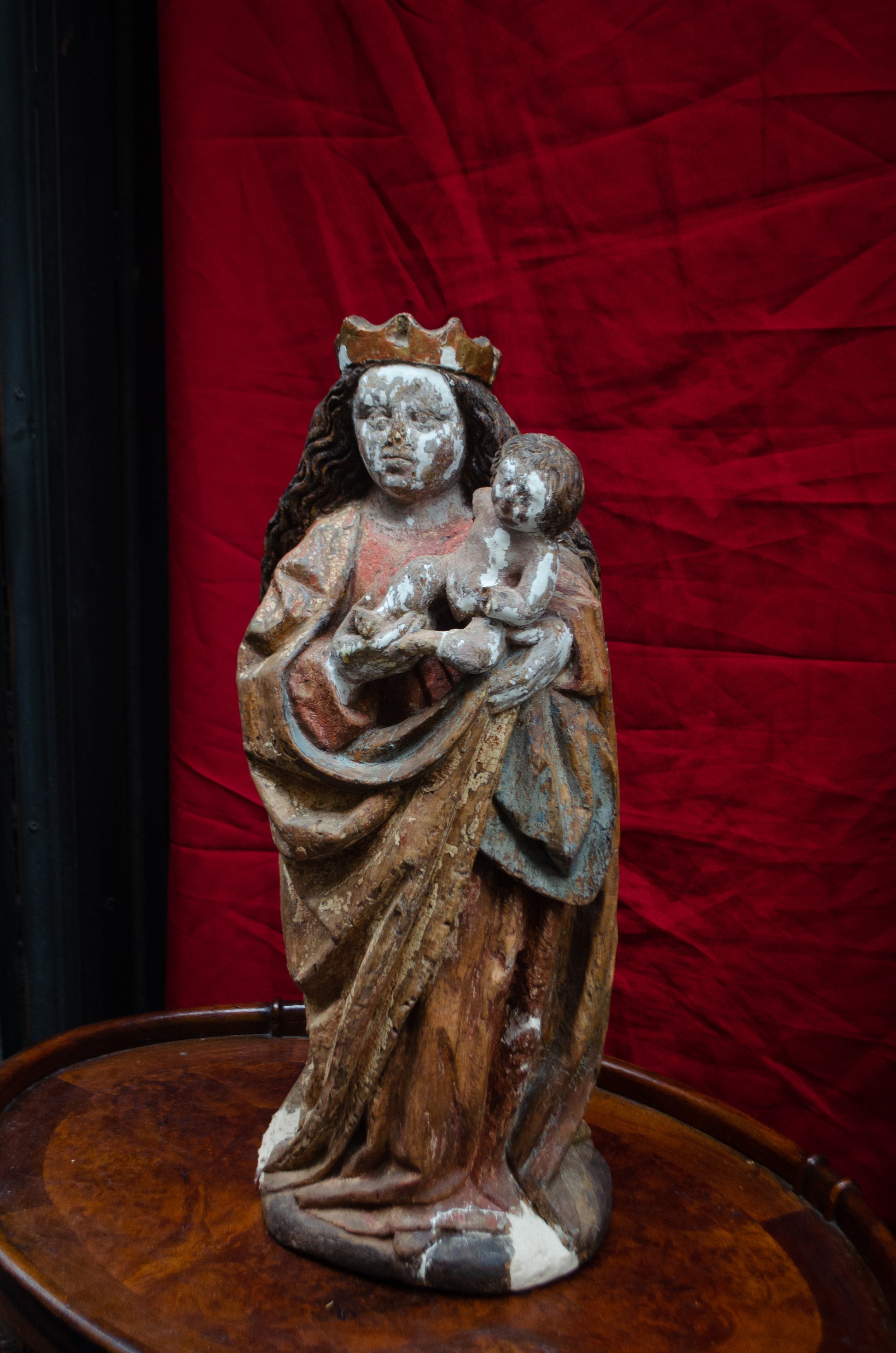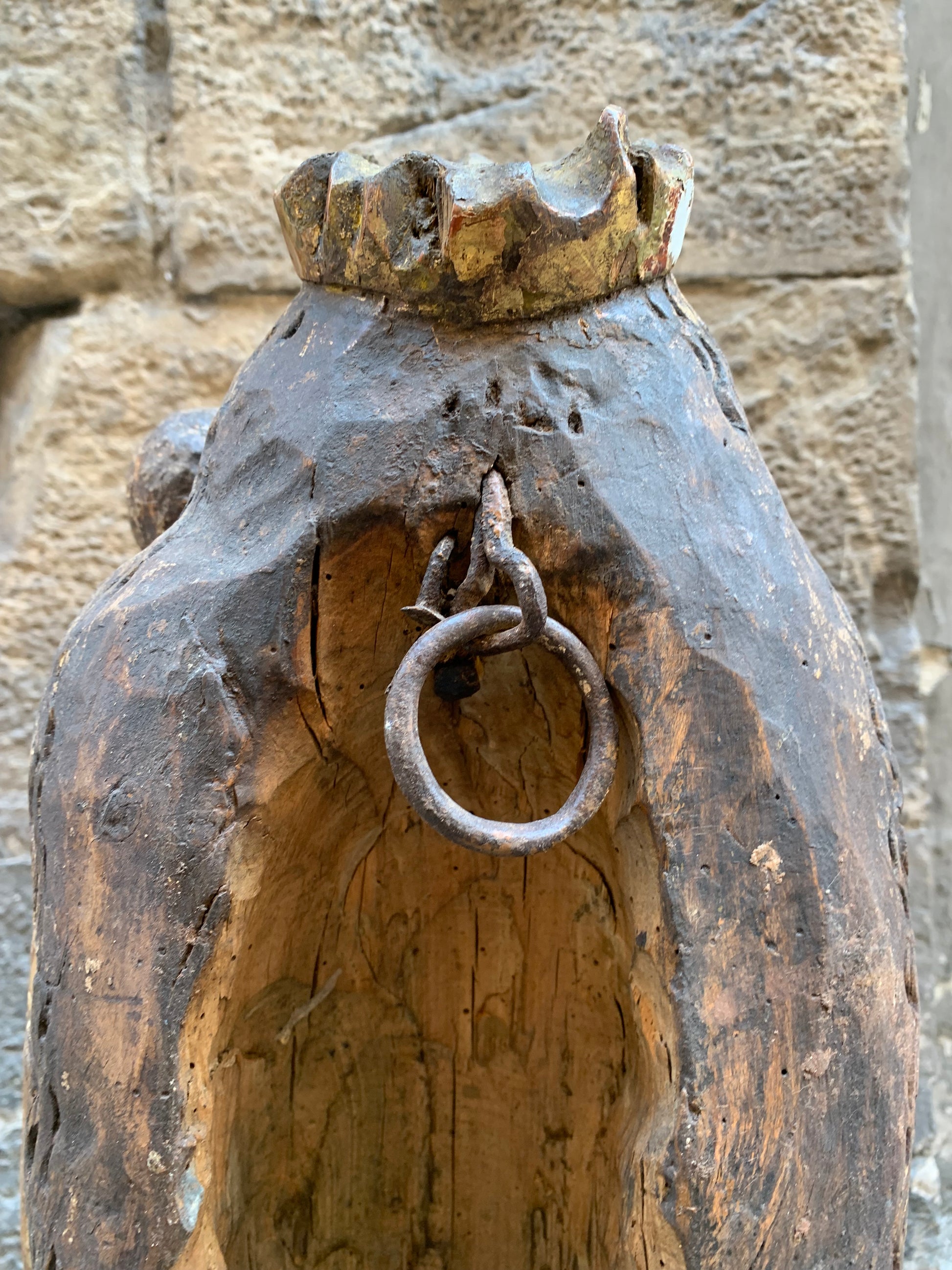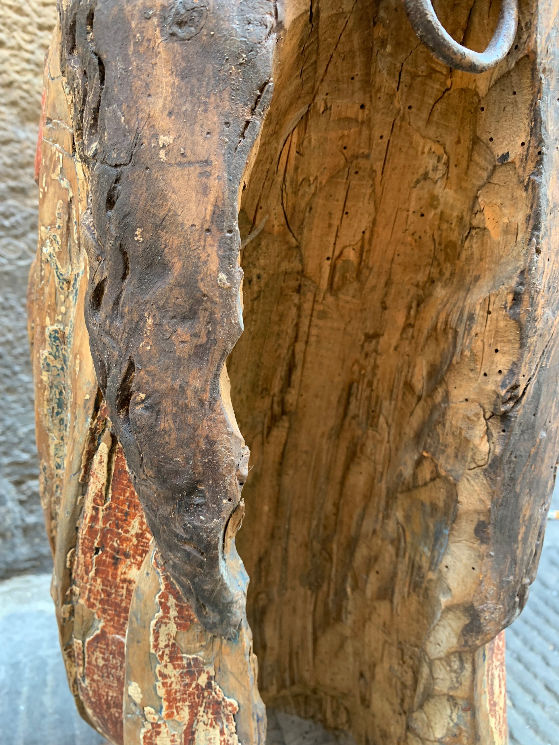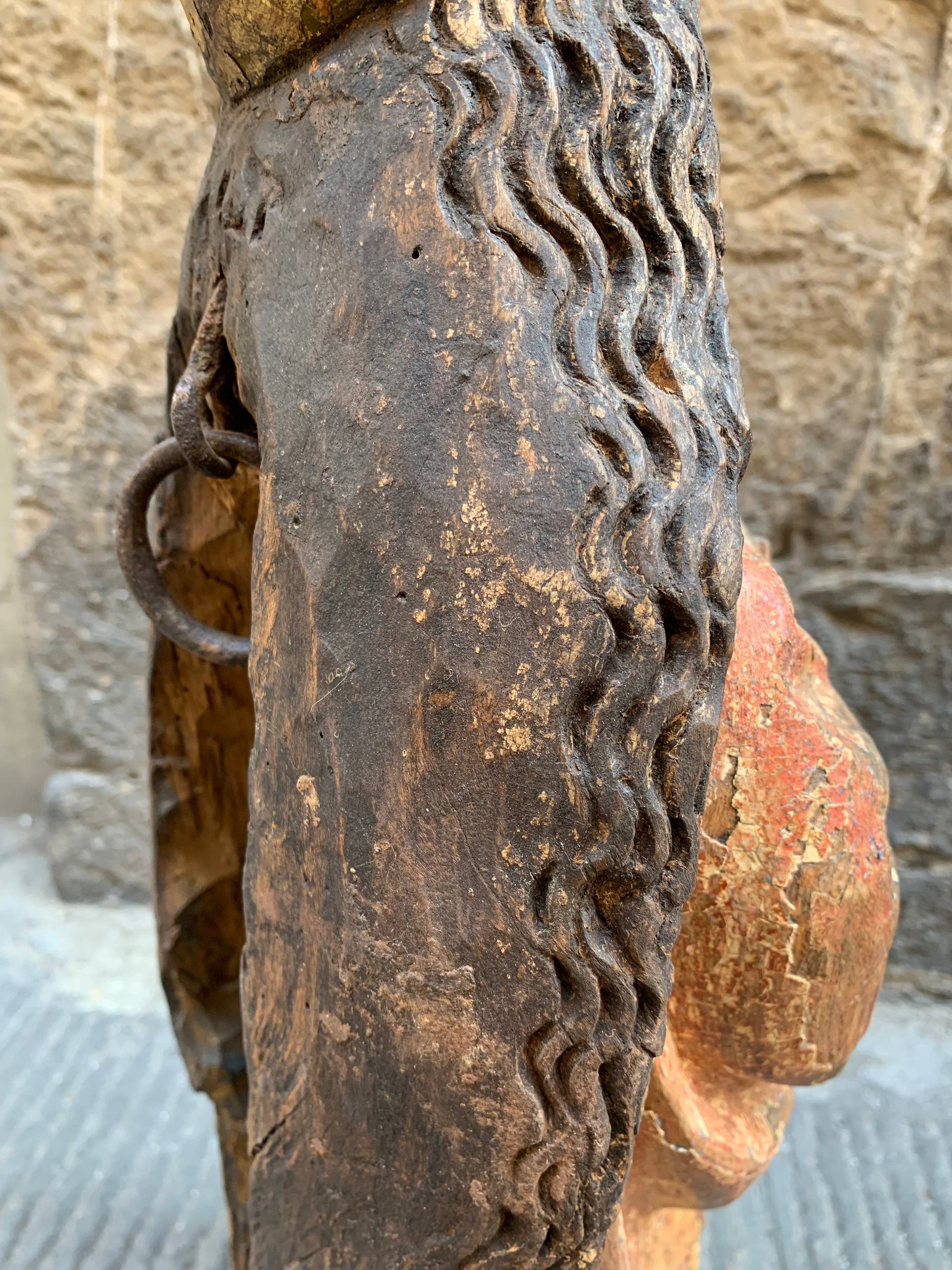The sculpture, originally painted, retains only some traces of polychromy, but these still make these reminiscences suggestive today. There are small wooden defects and wear, inevitable in a sculpture that is several hundred years old.
