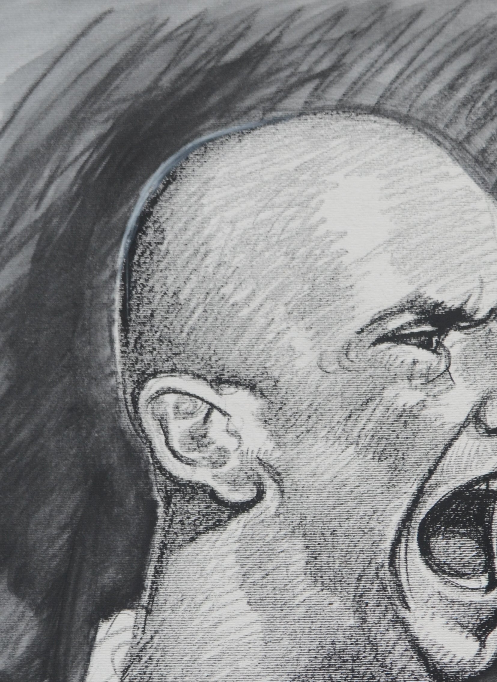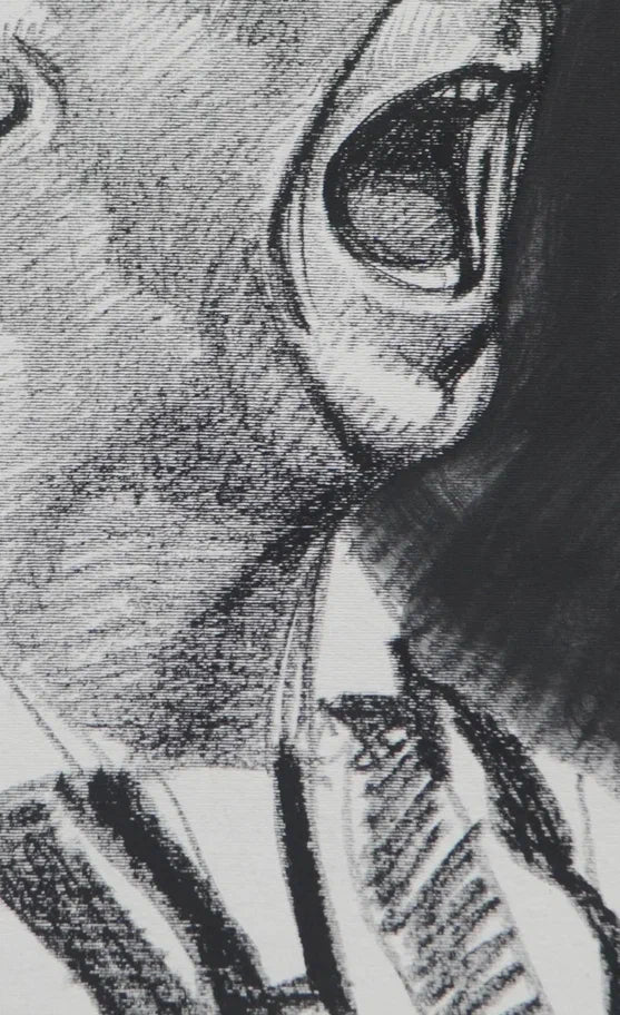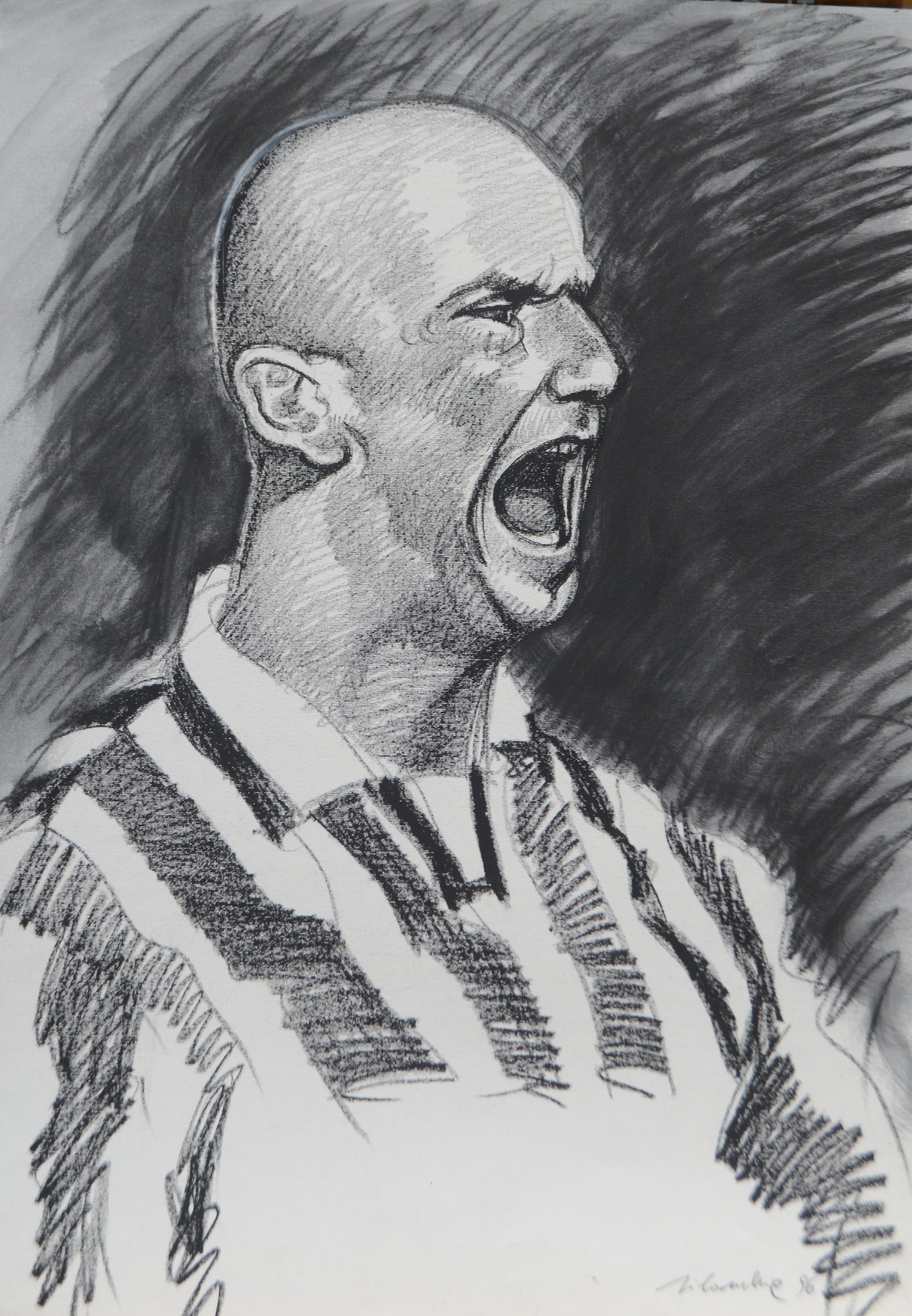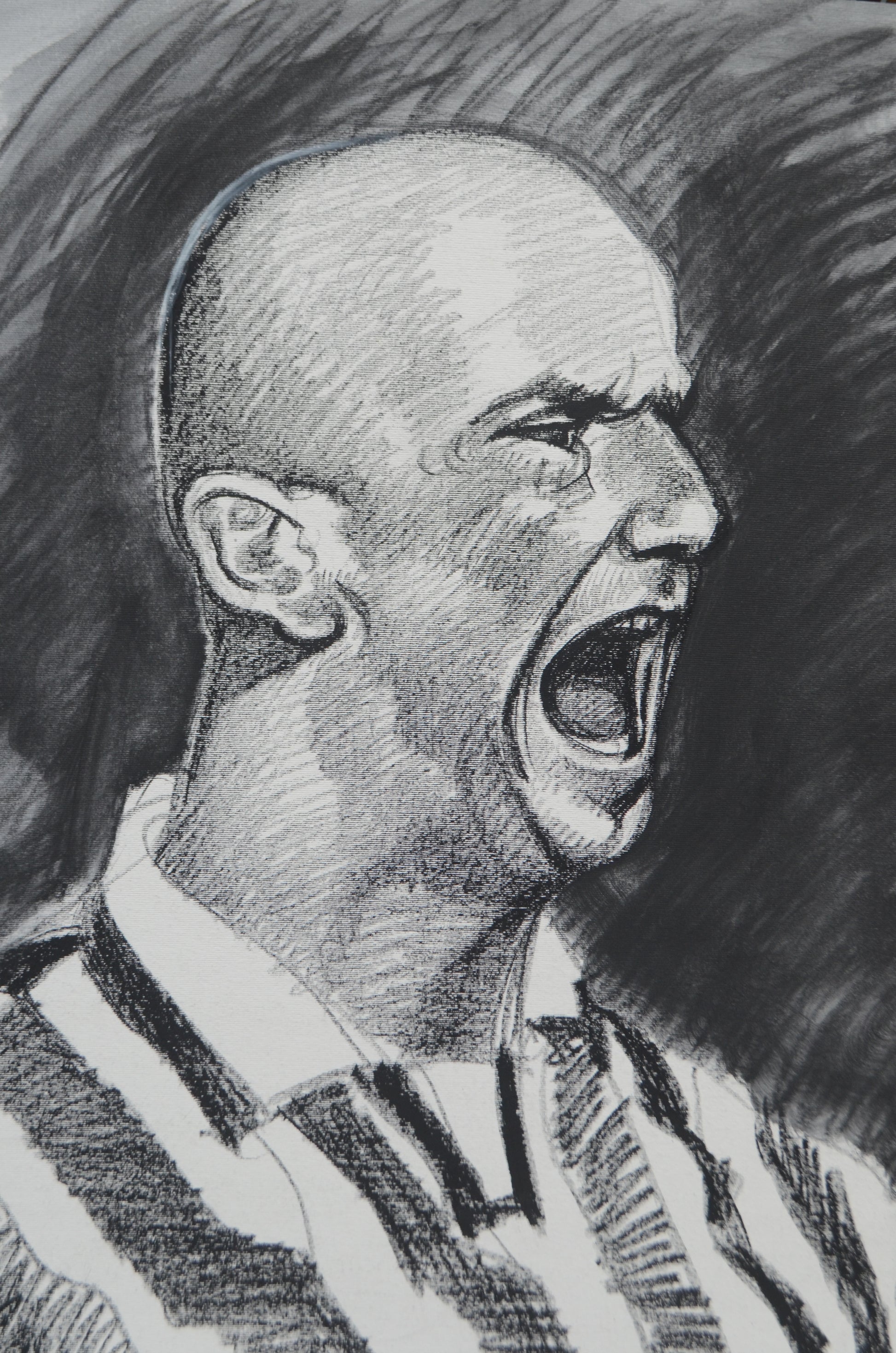 Description: This drawing captures Gianluca Vialli, an iconic figure in Juventus’s history, portrayed in a moment of intense emotion, epitomized by his passionate “grido del goal.” His bald head and expressive face reflect his commitment to the game, symbolizing the energy he brought to the pitch as a leader and captain.