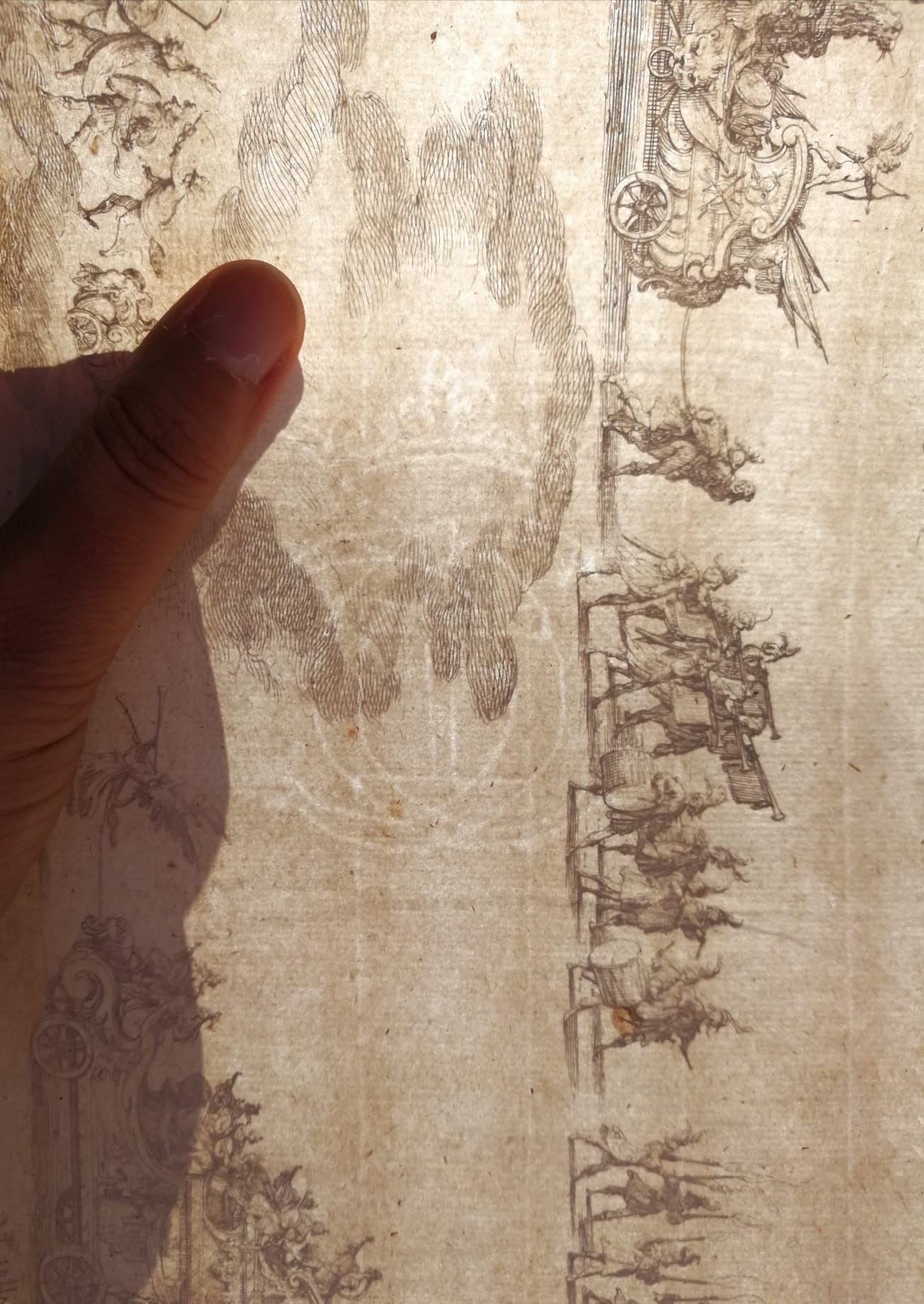 The sheet measures about 24 × 16 cm, printed on antique laid paper. Clearly visible in the sheet is a seventeenth-century watermark with two interlaced C’s surmounted by a crown, a mark that corresponds to the original seventeenth-century tirage. The impression is reinforced with a traditional paper backing; margins are trimmed and the sheet shows light spots of age, but the print retains strong presence and authenticity.