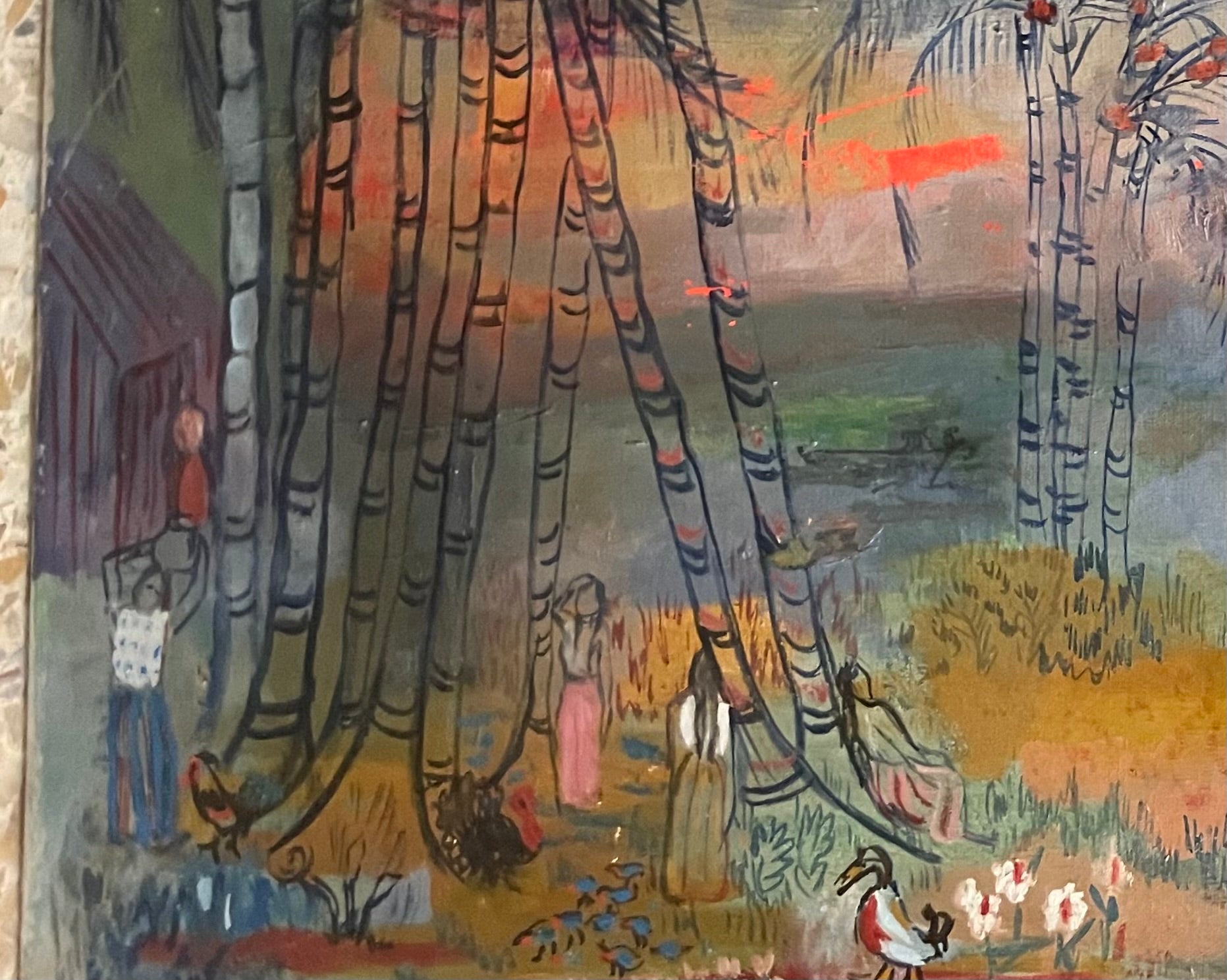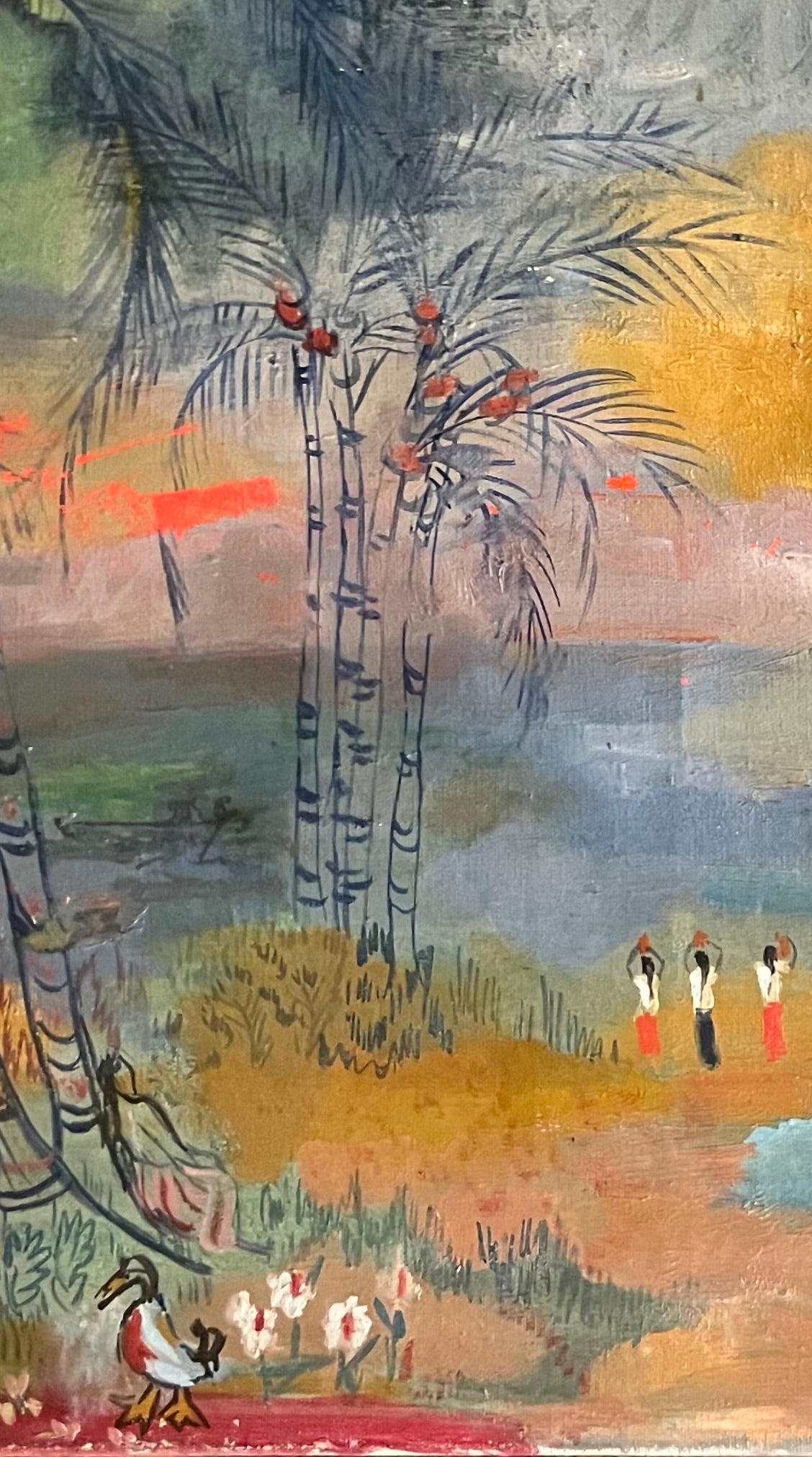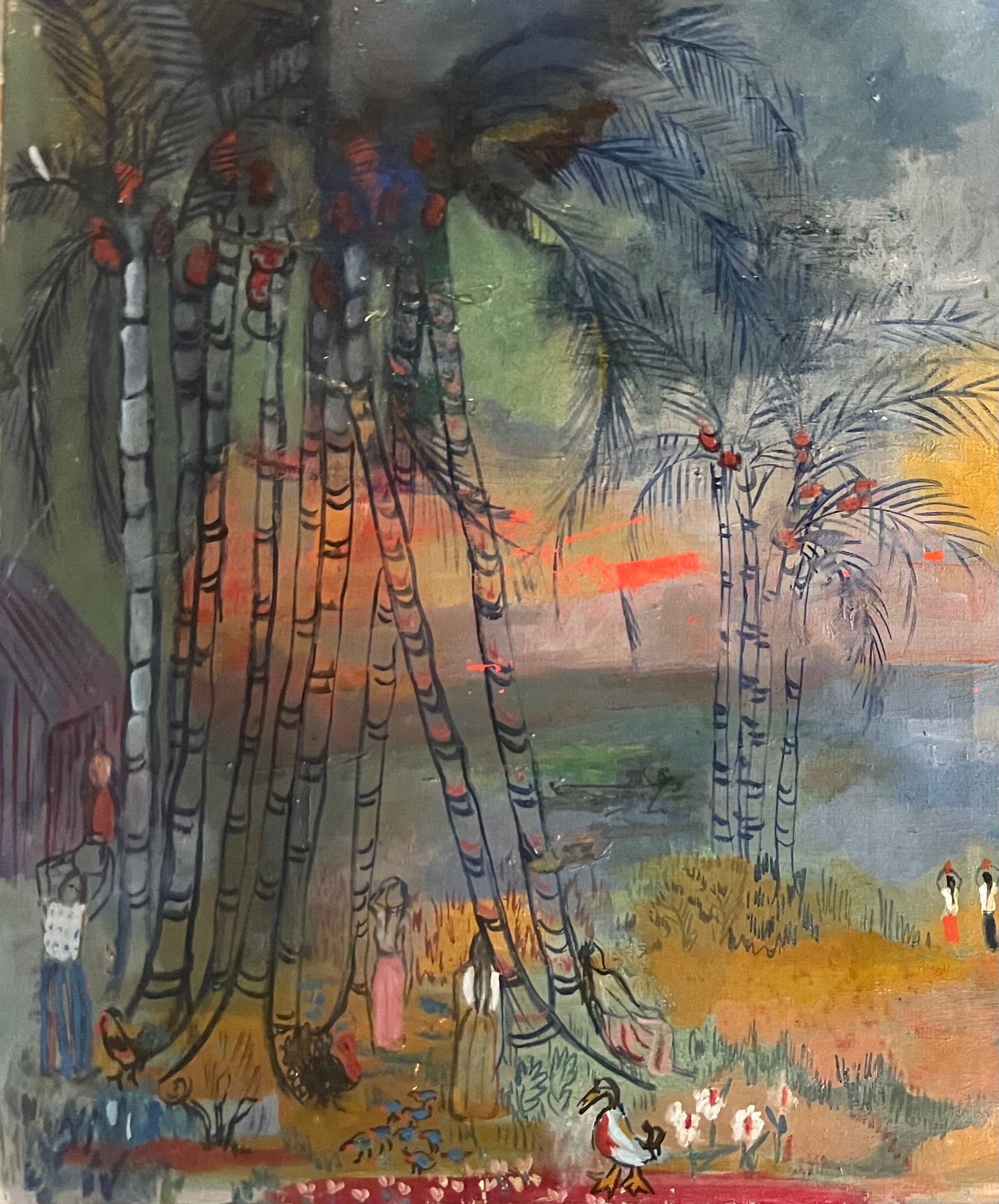 This painting depicts a tropical village, with a simple house on the left, slender palm trees, female figures, animals, and exotic birds rendered with a deliberately dreamlike touch. The surreal light and colors reminiscent of Fauvism transform the everyday scene into an oneiric vision. Decorative rhythms and vivid contrasts recall affinities with Raoul Dufy, though Andrade maintained her own distinct style, a fusion of Caribbean identity and Parisian modernism.