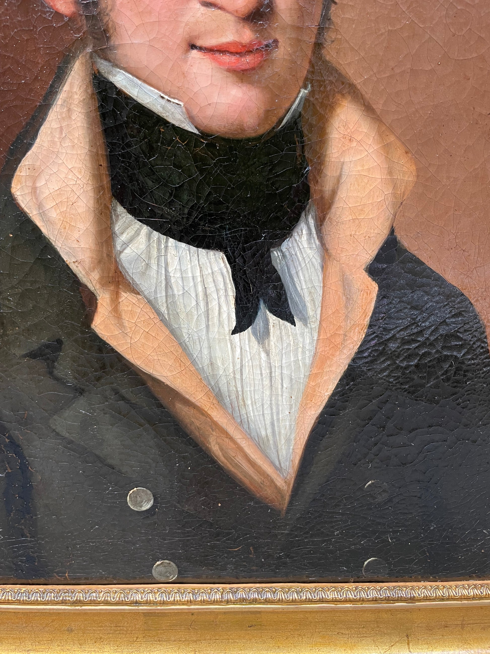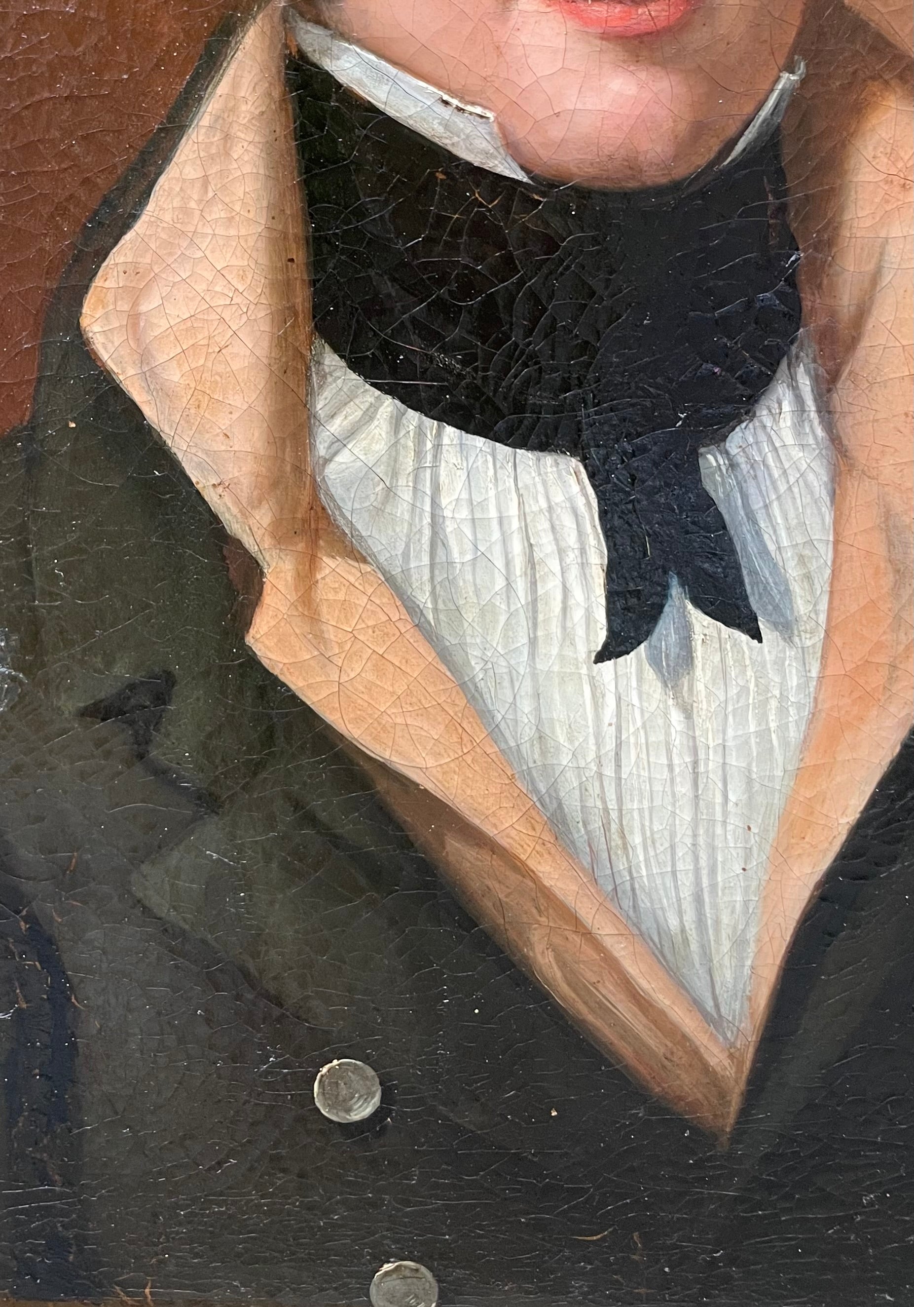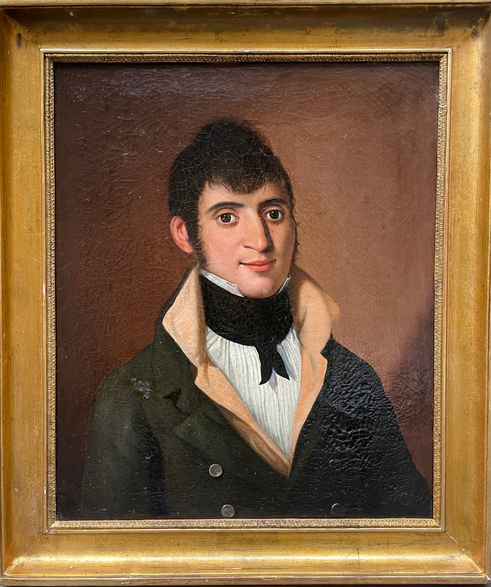 Early 19th-century portrait of a dark-haired young man, painted on its original canvas with the original stretcher. The attire reflects male fashion between the Napoleonic era and the early Restoration: a dark double-breasted coat with wide light-colored lapels, a white starched shirt with pleated front and high stiff collar, completed by a simply tied black cravat. The hairstyle, with short hair combed forward and a slightly raised lock, follows the elegant and sober taste of the period.