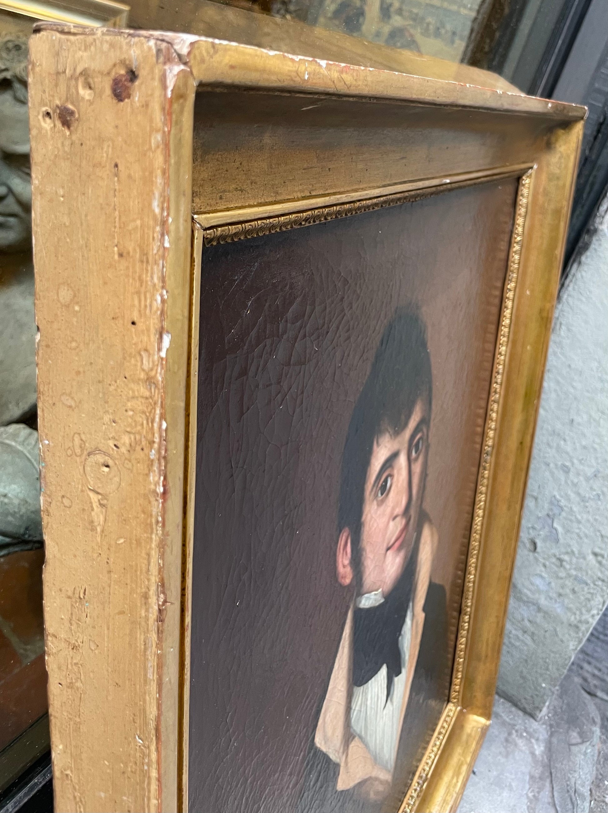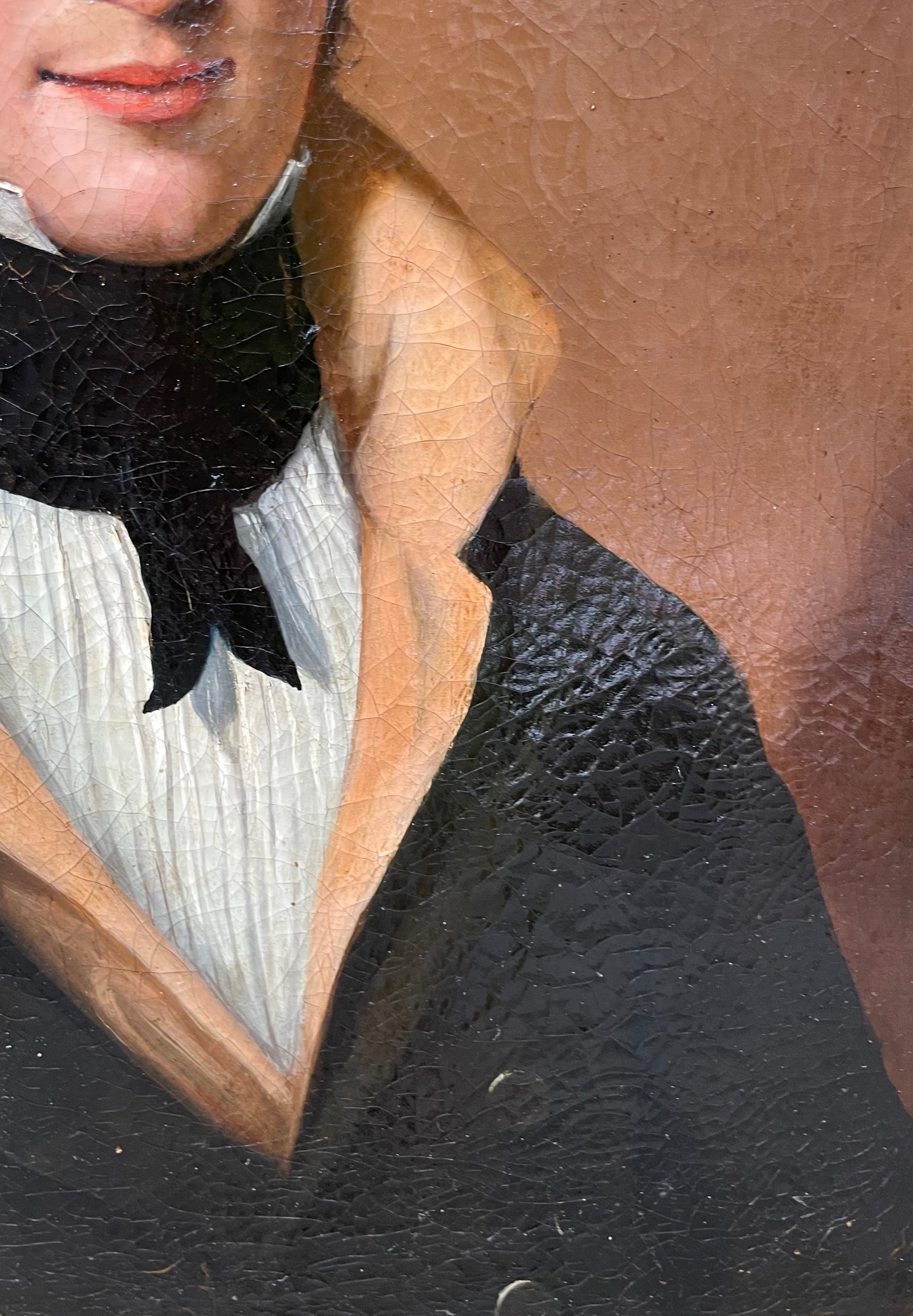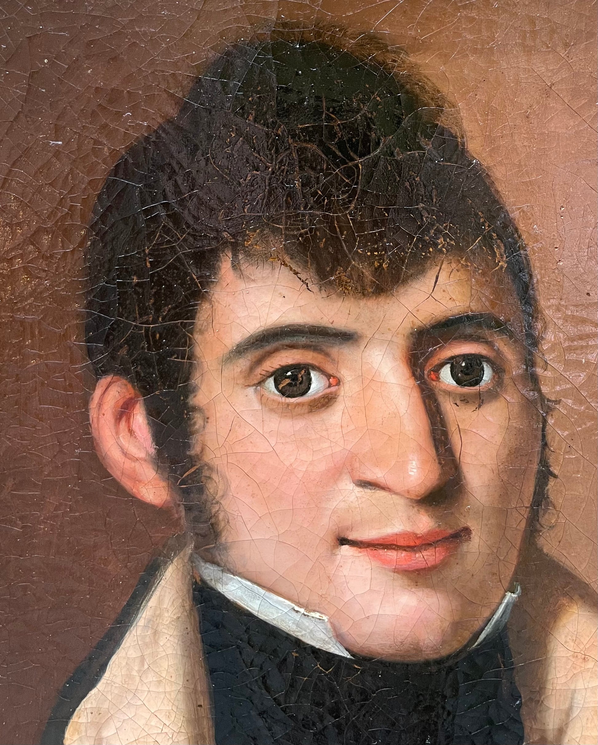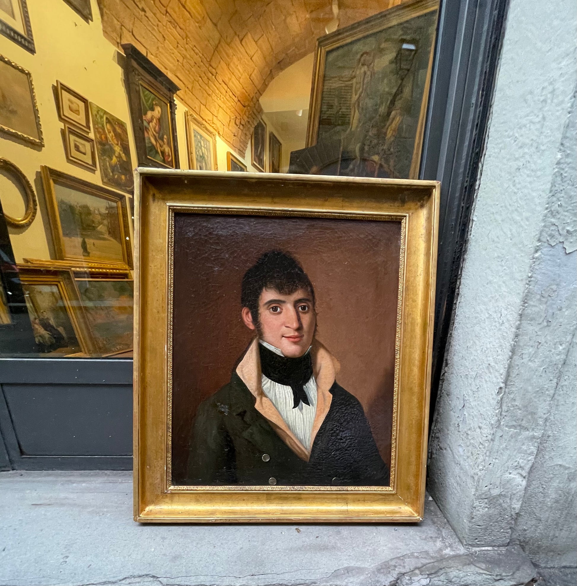 Early 19th-century portrait of a dark-haired young man, painted on its original canvas with the original stretcher. The attire reflects male fashion between the Napoleonic era and the early Restoration: a dark double-breasted coat with wide light-colored lapels, a white starched shirt with pleated front and high stiff collar, completed by a simply tied black cravat. The hairstyle, with short hair combed forward and a slightly raised lock, follows the elegant and sober taste of the period.