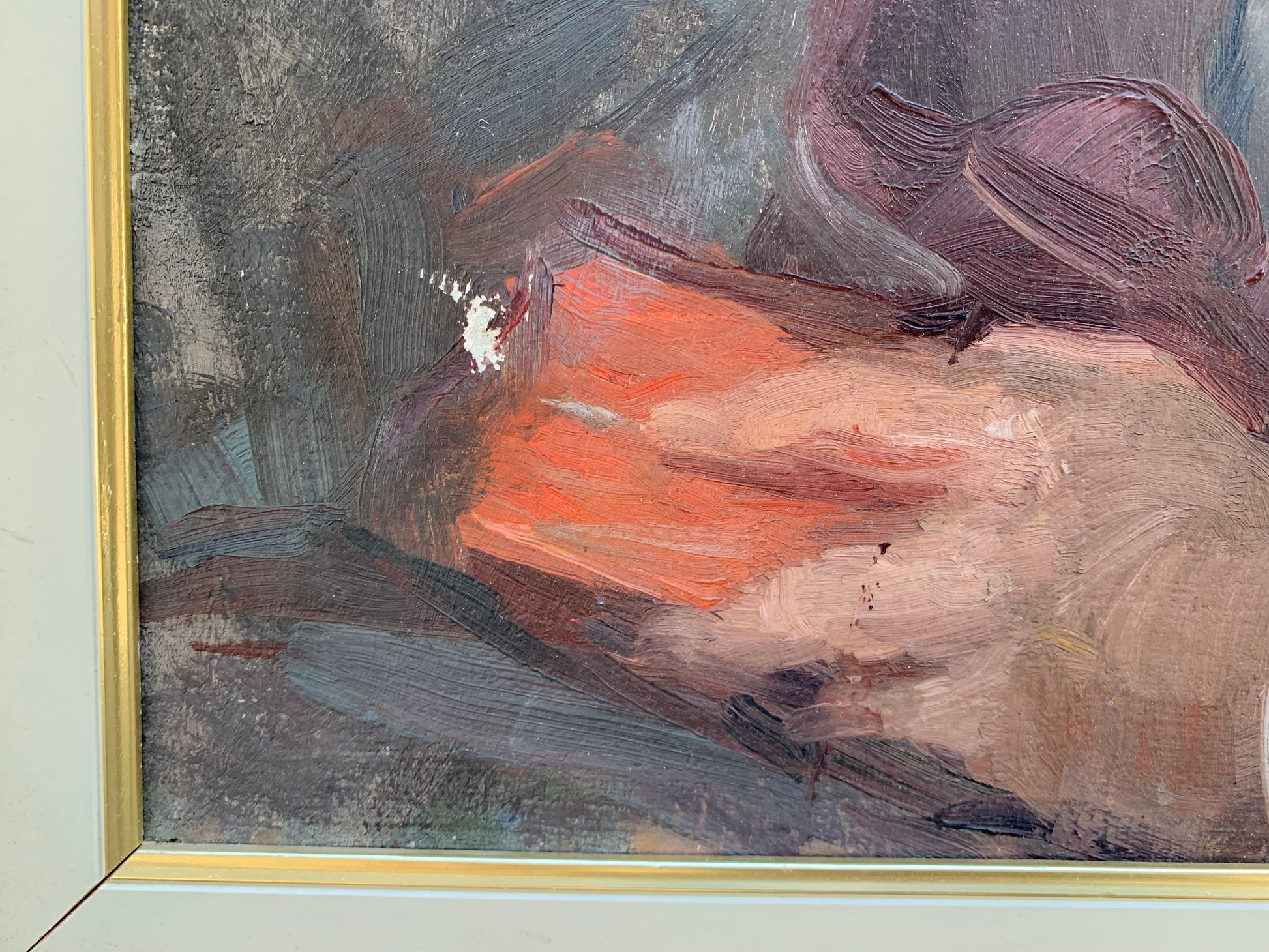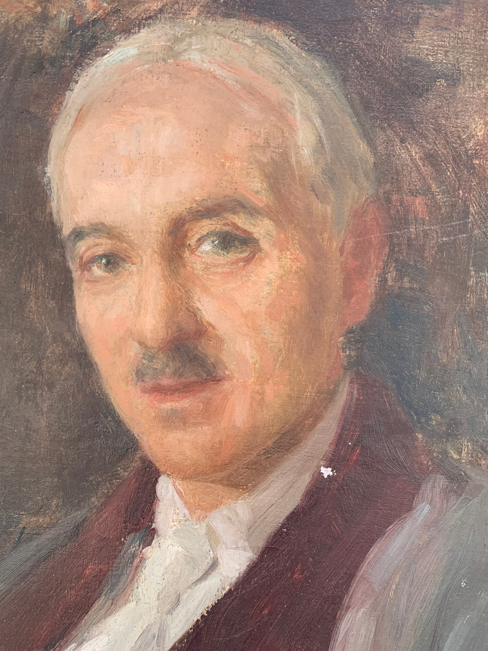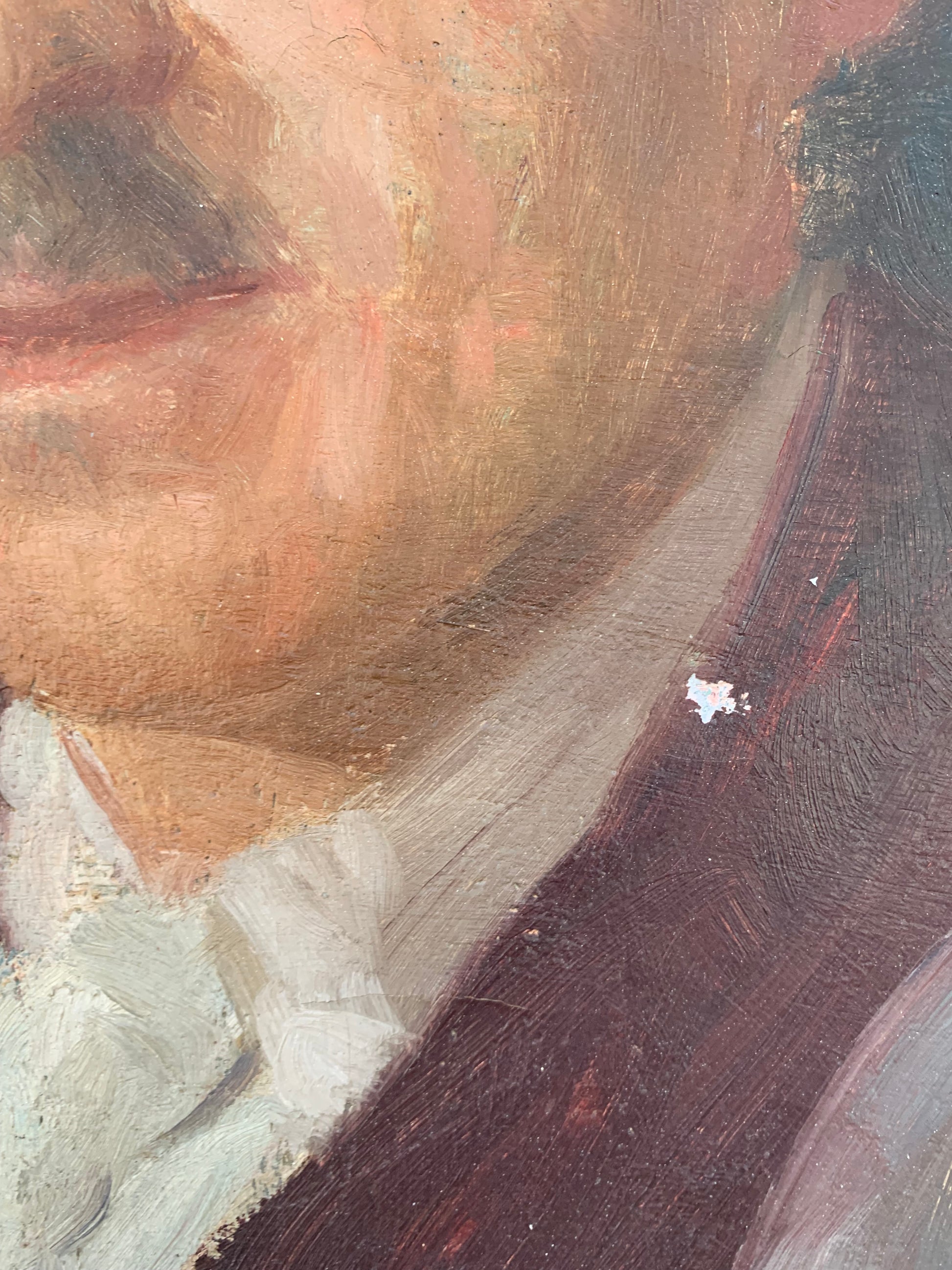 This male portrait, painted in oil on canvas, is signed G. Befanio in the upper left corner and dated 1936. Likely one of the artist’s final works, it depicts a distinguished gentleman with a fine mustache, dressed in an elegant gray suit with bordeaux trimming, a white shirt, and a white pocket square. The composition, created with soft brushstrokes and a subtle use of light, reflects Befanio’s artistic evolution, blending late French Impressionist influences with his roots in Neapolitan verism.