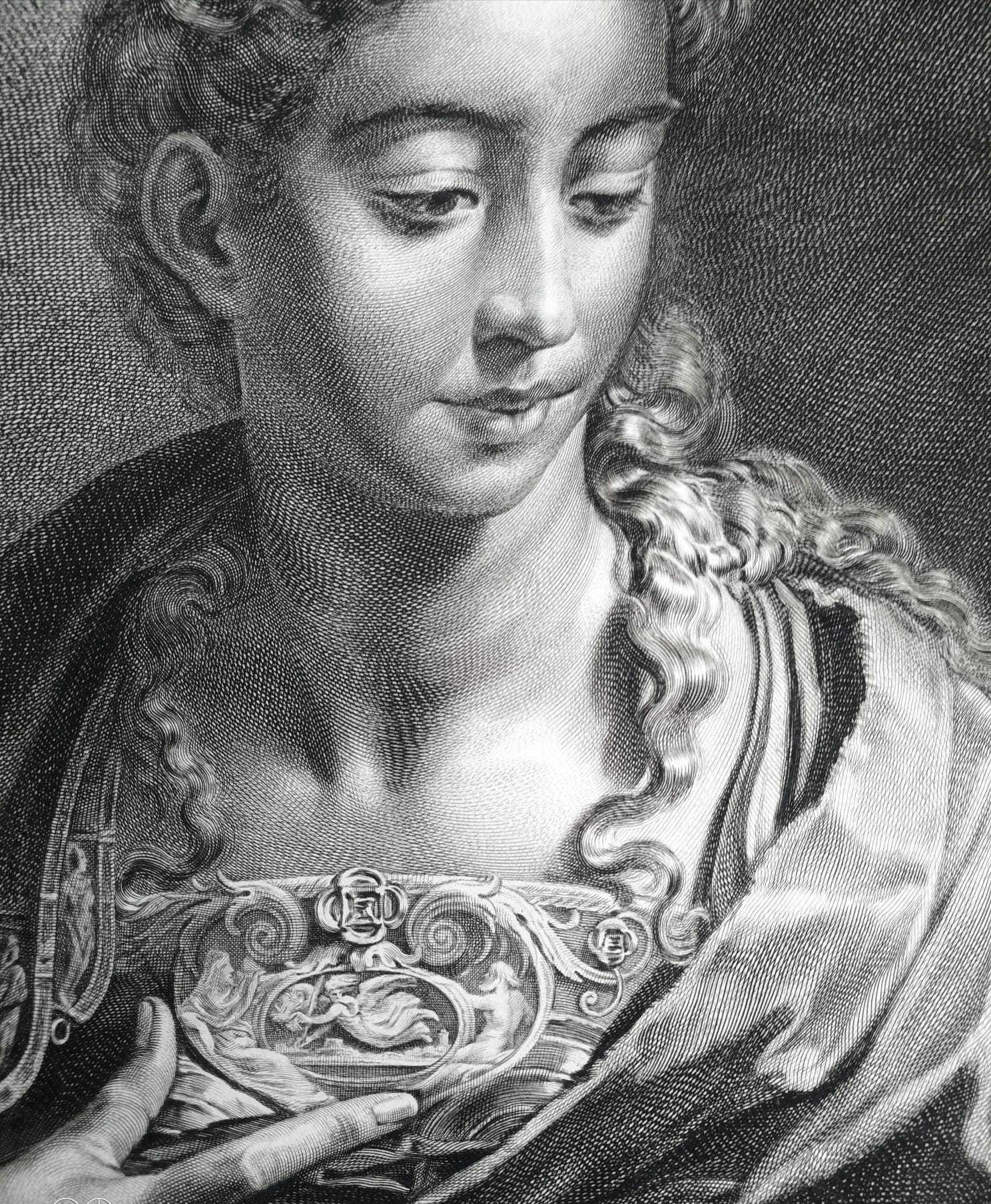 The engraving depicts Minerva/Athena in half-length, looking downwards, beneath an architectural arch. The model is the Minerva painted by Parmigianino around 1530–1533, today preserved in the Royal Collection at Hampton Court. The identification of the goddess is given by the cameo on her breastplate, adorned with a flying Victory holding an olive branch above the ideal view of Athens. The figure embodies the Mannerist ideal of slender and elegant beauty.