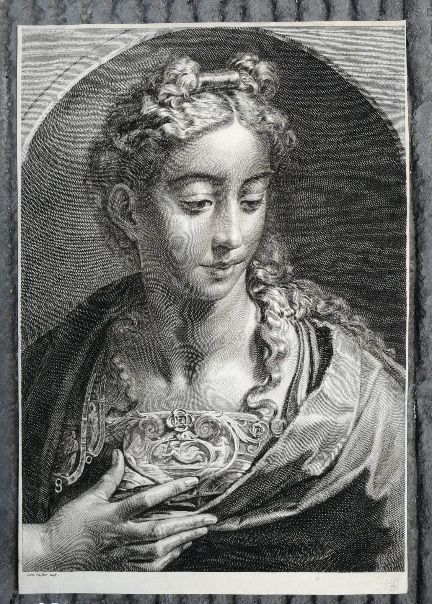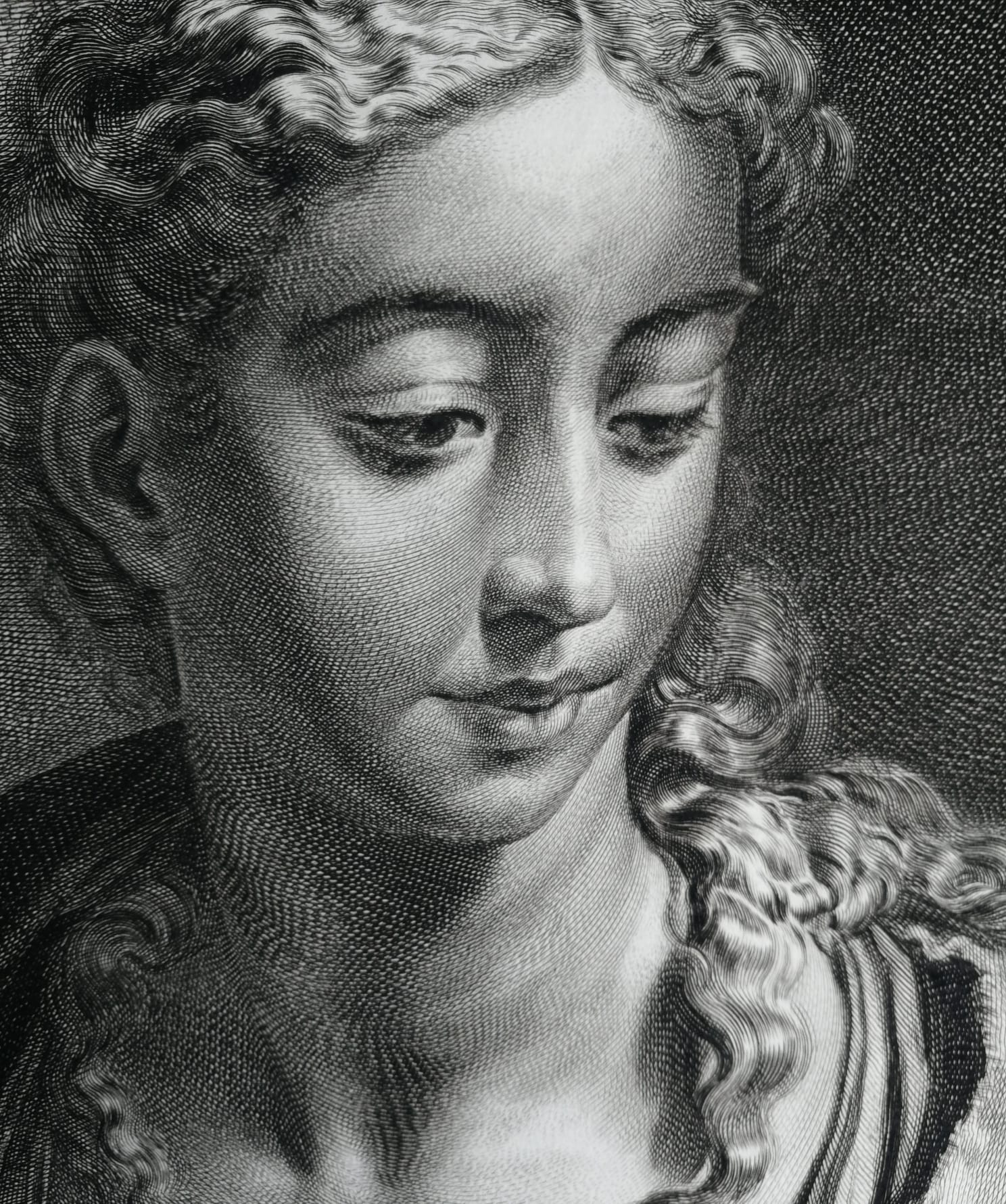 Engraving by Cornelis Visscher, plate ca. 1658 for the Cabinet Reynst: Dutch merchants in Venice commissioned engravings to represent their collection of Italian masterpieces, including Parmigianino’s Minerva; example in an early state (II or IV).