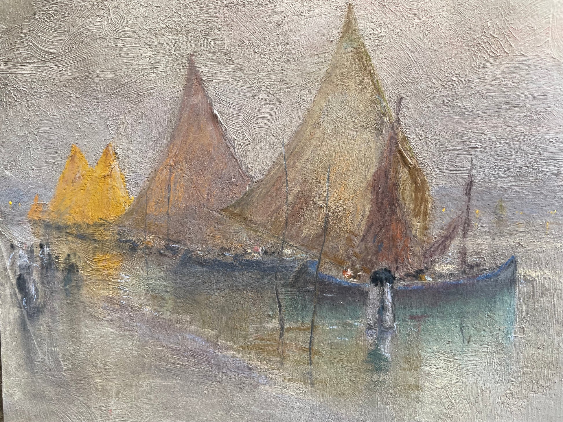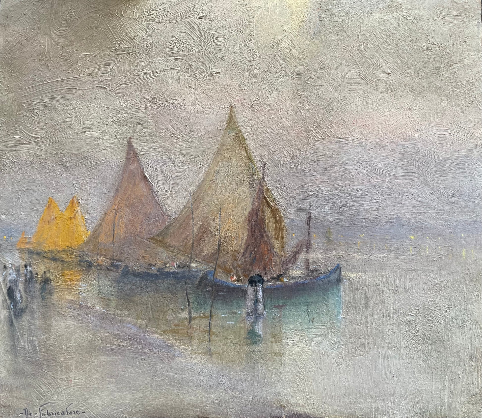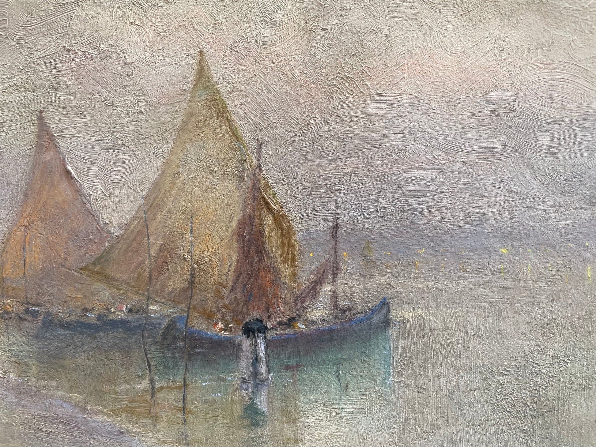 Venice at daybreak, when the light hesitates and the water still holds its breath. The boats are those of the lagoon, bragozzi and trabaccoli with their large triangular sails, slowly emerging from the mist. In the distance, tiny points of light suggest the lamps along the waterfront: perhaps still gas lamps—introduced in Venice as early as 1843—or already electric, progressively adopted between the late 19th and early 20th centuries.