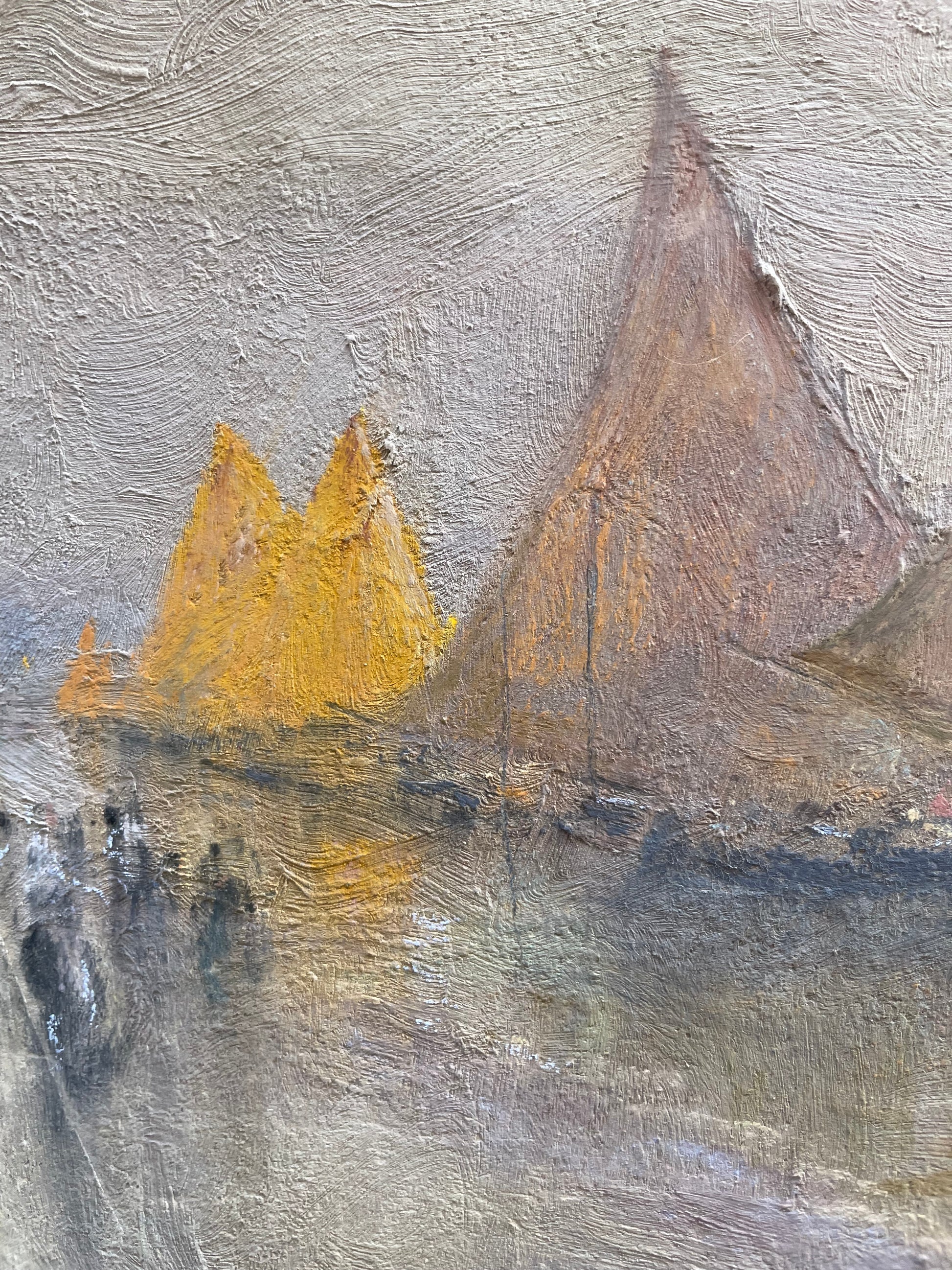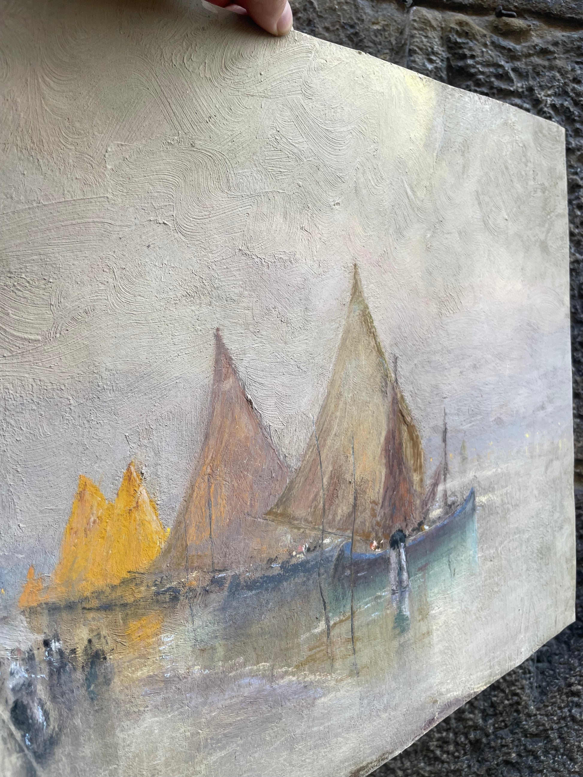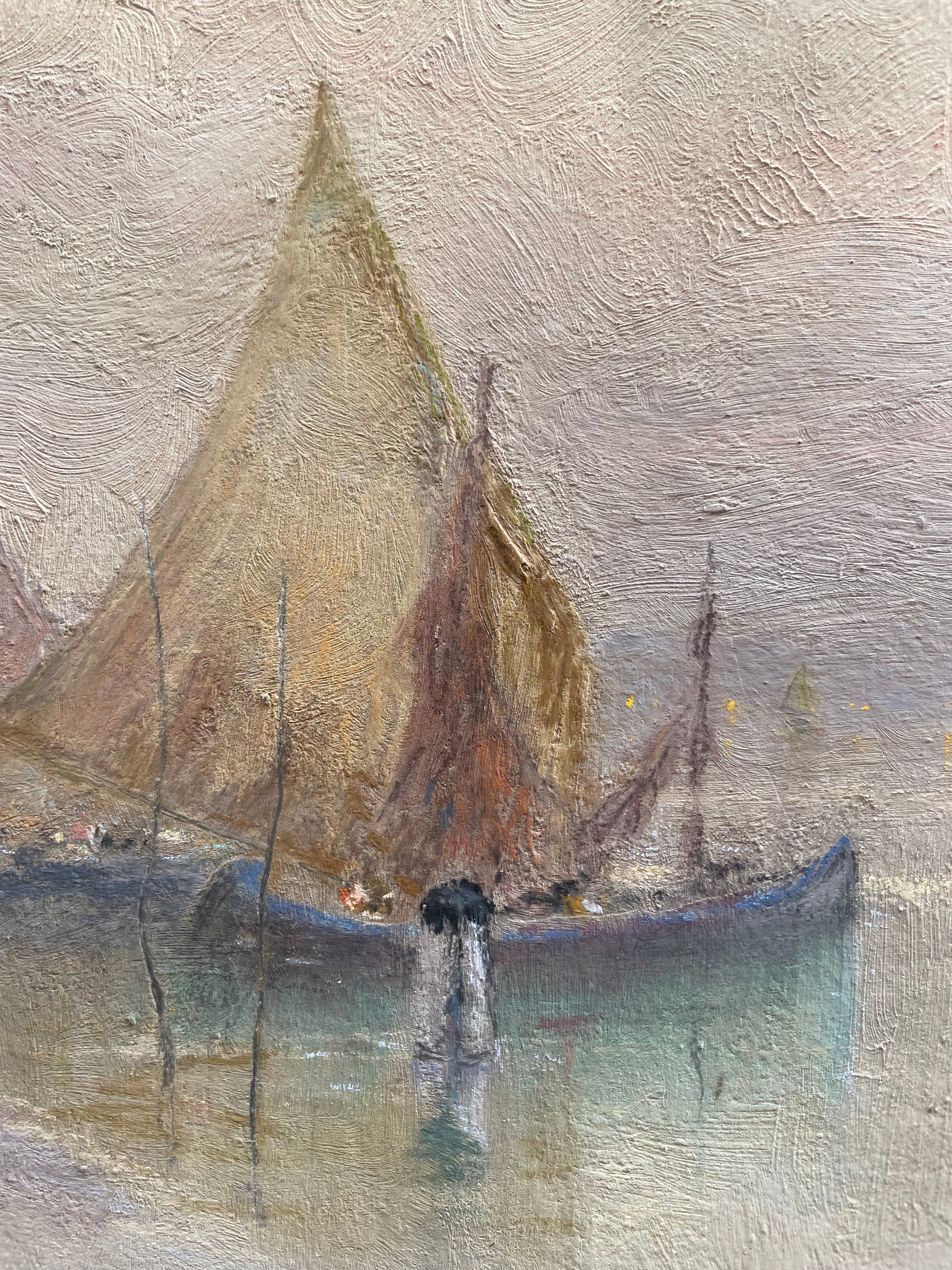 Venice at daybreak, when the light hesitates and the water still holds its breath. The boats are those of the lagoon, bragozzi and trabaccoli with their large triangular sails, slowly emerging from the mist. In the distance, tiny points of light suggest the lamps along the waterfront: perhaps still gas lamps—introduced in Venice as early as 1843—or already electric, progressively adopted between the late 19th and early 20th centuries.