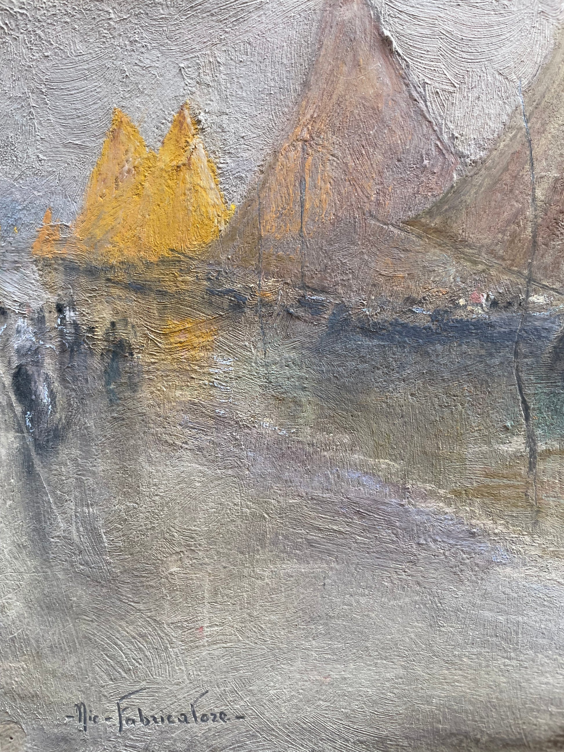 Nicola Fabbricatore was a regular presence at the Venice Biennale during the 1920s and 1930s (XIII in 1922, XIV in 1924, XV in 1926, again in 1930 and later). It is plausible that this pastel was executed during one of his Venetian stays connected with these exhibitions, when painters sought to capture the city’s elusive dawn light.