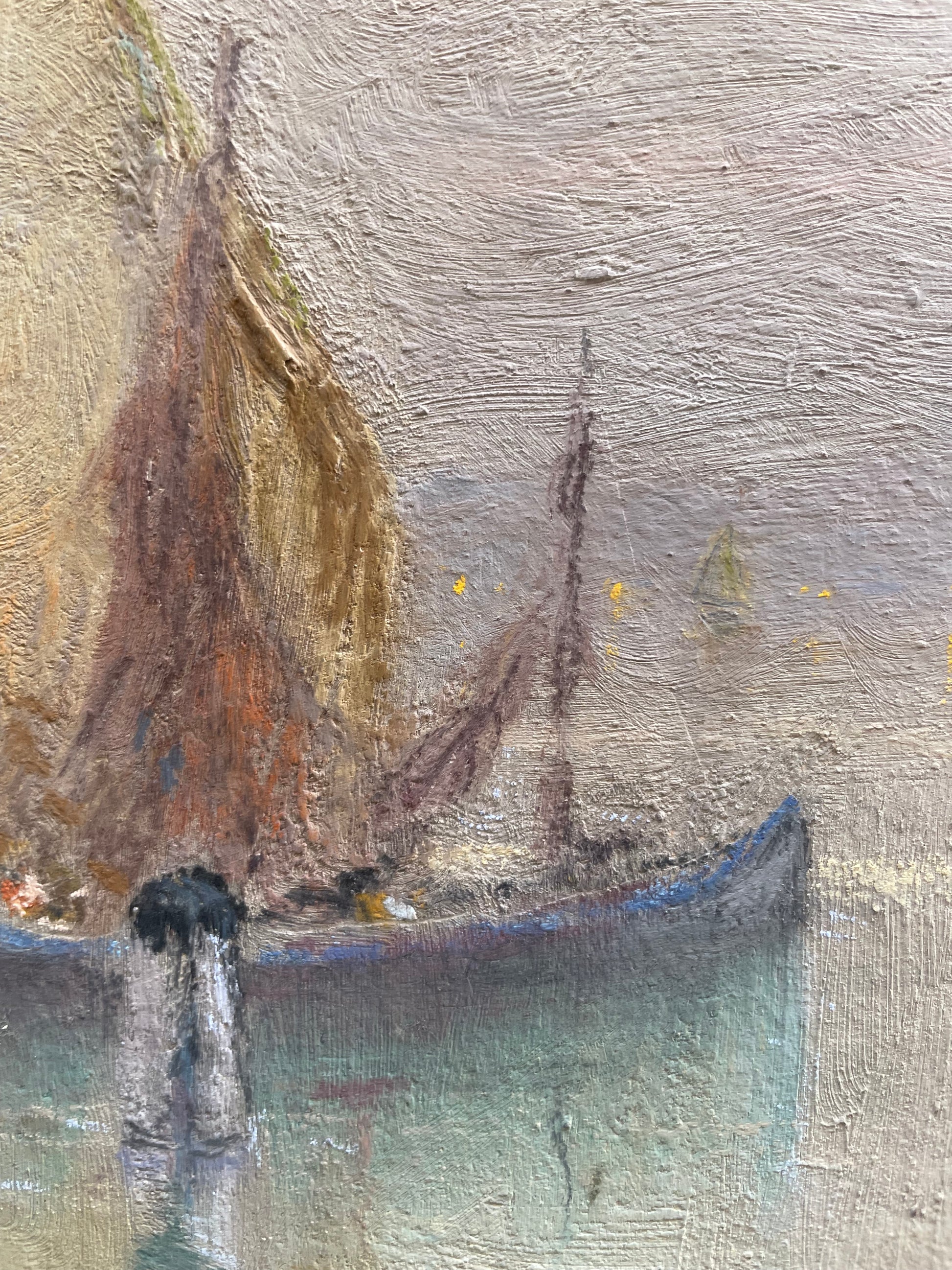 Fabbricatore is not concerned with topography but with atmosphere. The pastel medium allows him to modulate light and dissolve contours, turning the morning haze into the true protagonist of the scene. Here lies his affinity with Impressionism: if Monet had chosen the fog of London as the stage of modernity, Fabbricatore offers an Italian, Venetian counterpart—where mist becomes lagoon haze, liquid reflections, and suspended light.
