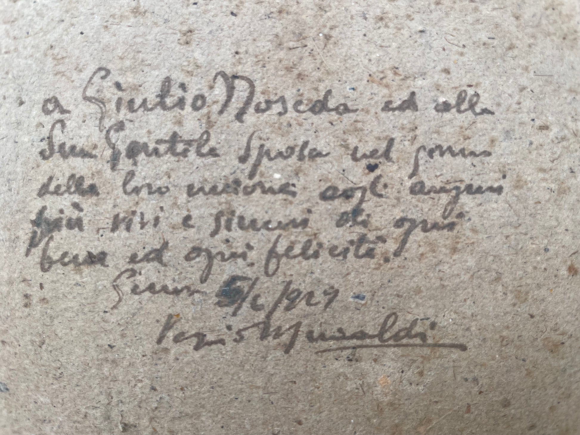 On the reverse, a dedication reads: “To Giulio Noseda and his gentle bride, on the day of their union, with the sincerest wishes for happiness and prosperity. 5/6/1929. Iris Musaldi.” A wedding gift, complete with its period frame, perfectly in keeping with the date.