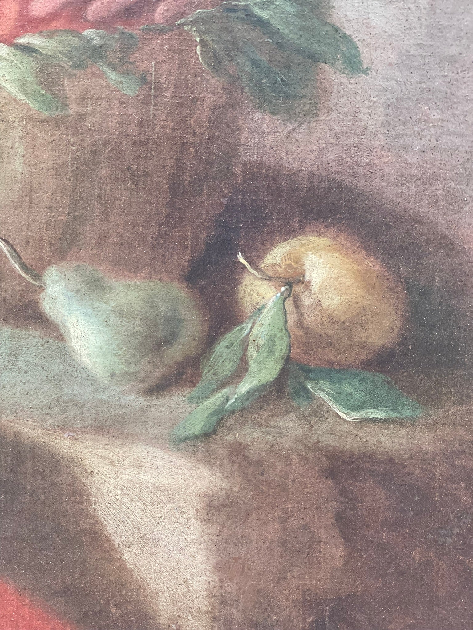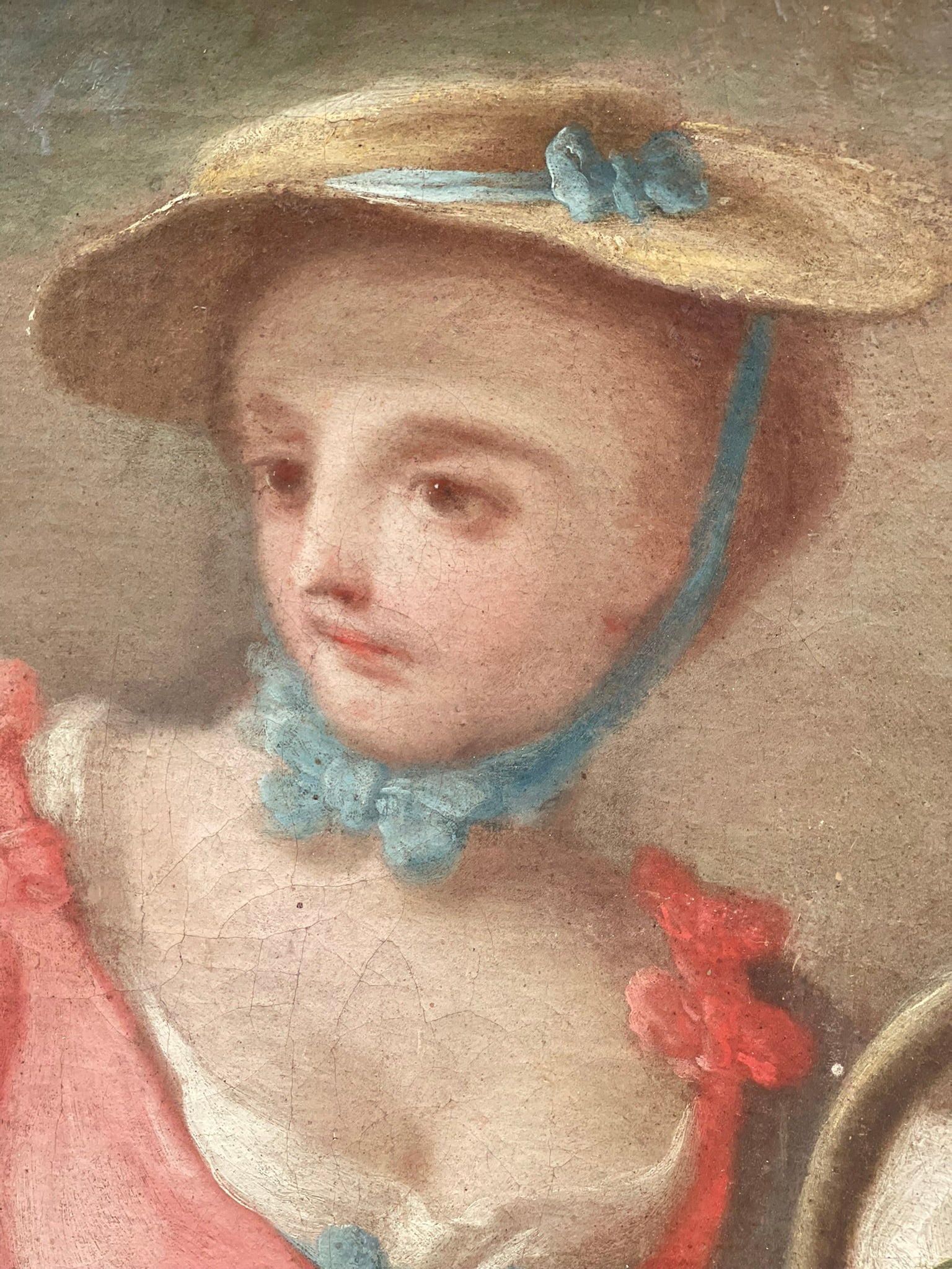This refined painting belongs to the Neapolitan Rococo period, when court painting turned toward lighter, more worldly themes. The bucolic scene depicts three young figures in a theatrical attitude: at the center a woman receives a basket of fruit, while on the right a youth dressed in white with a red turban introduces an exotic and playful note, inspired by the contemporary taste for turqueries and theatrical masquerades.