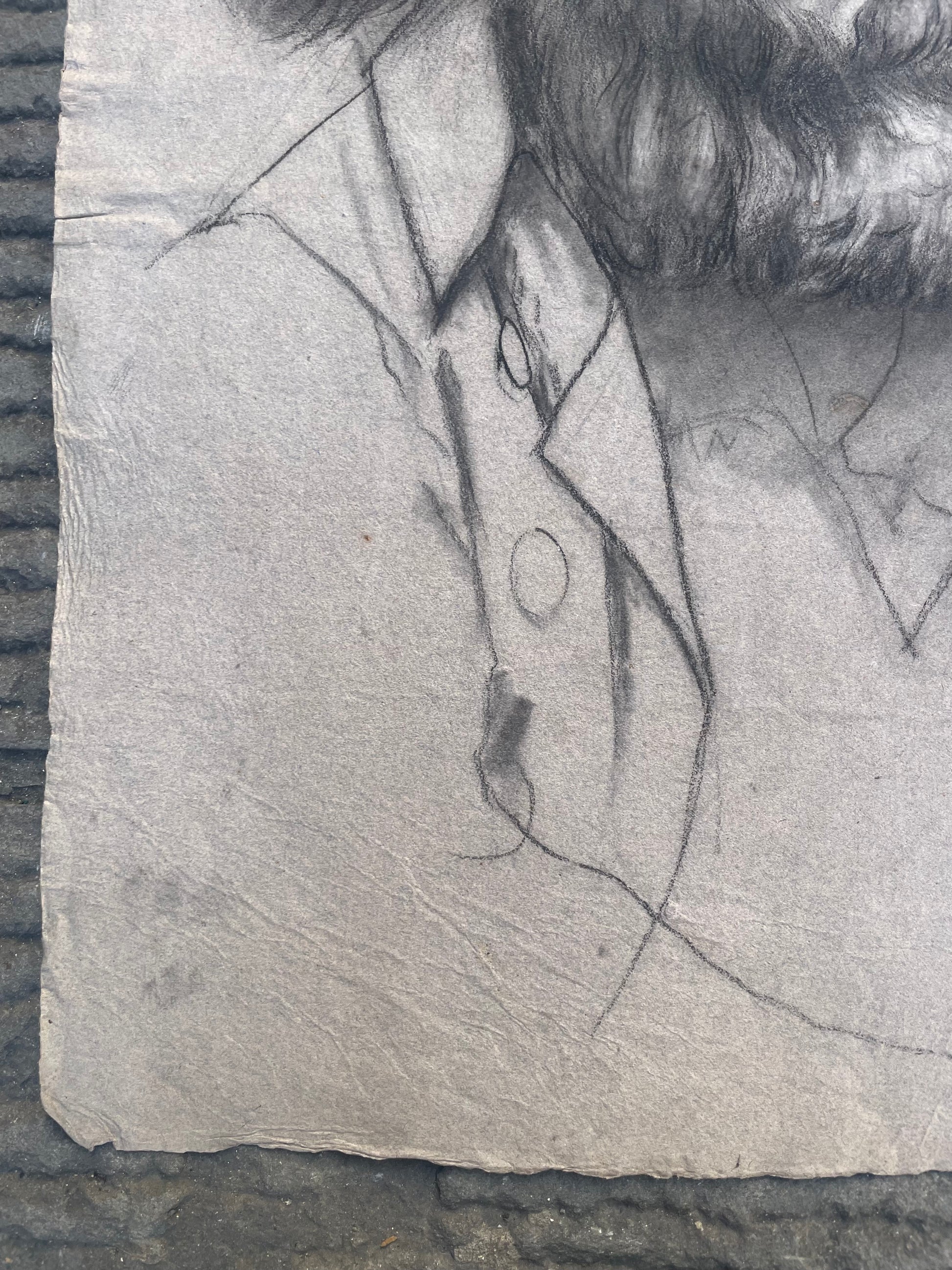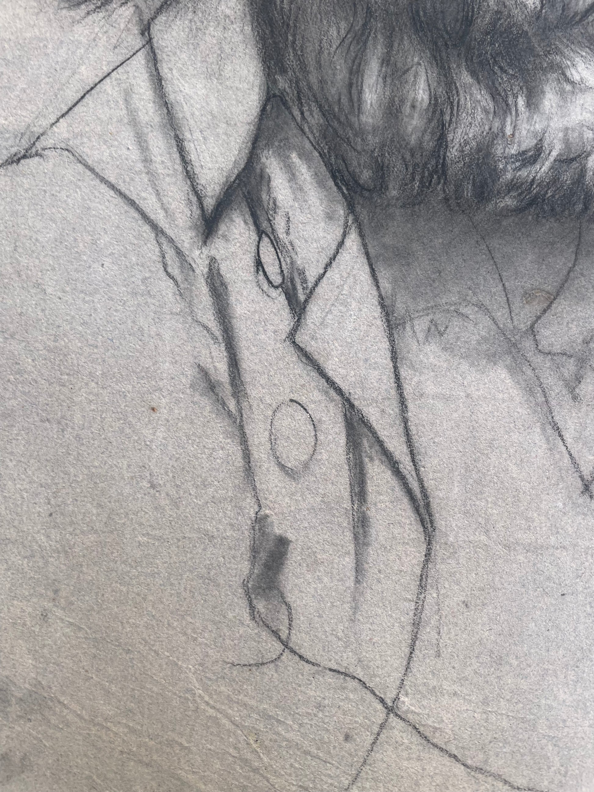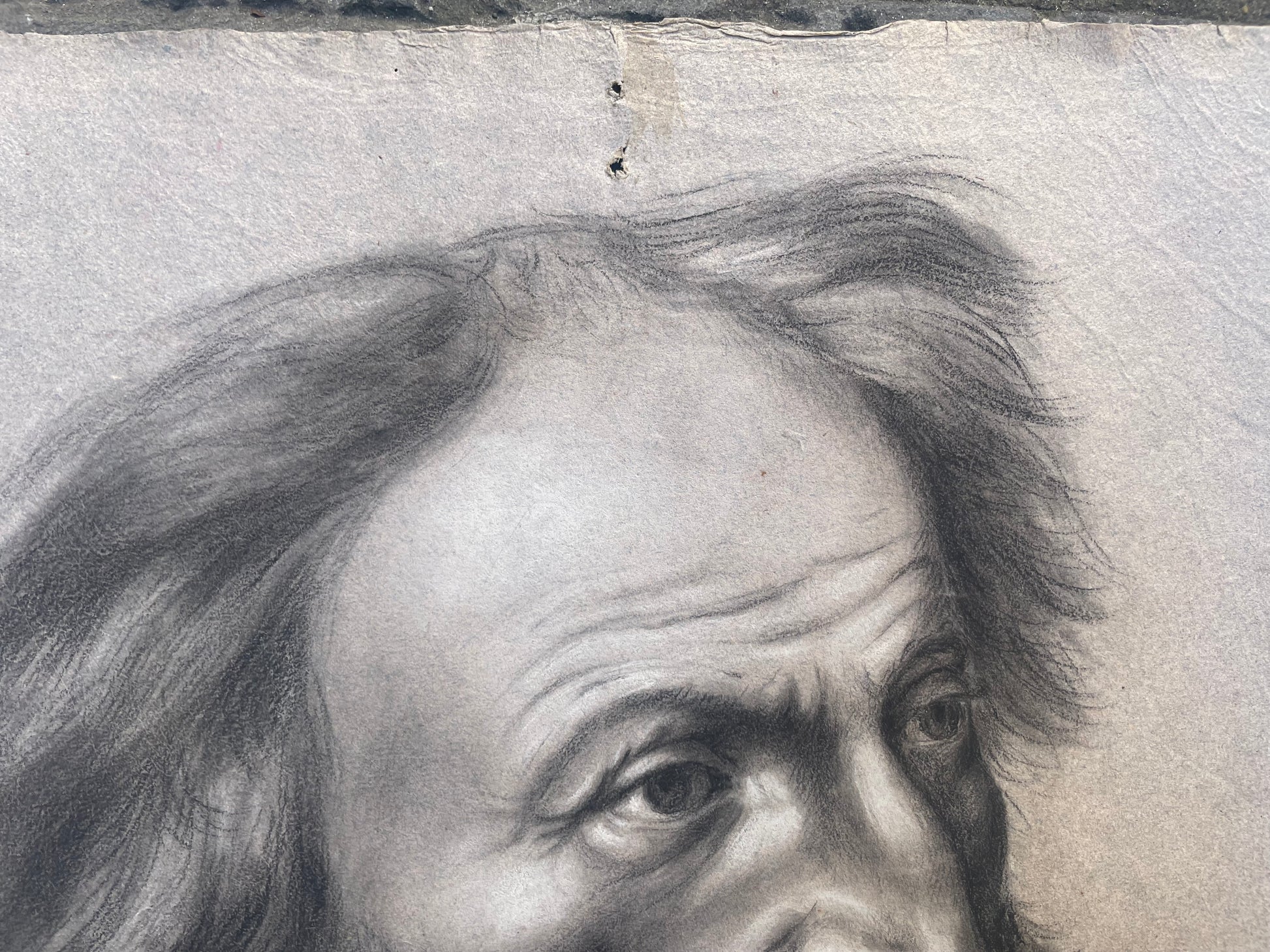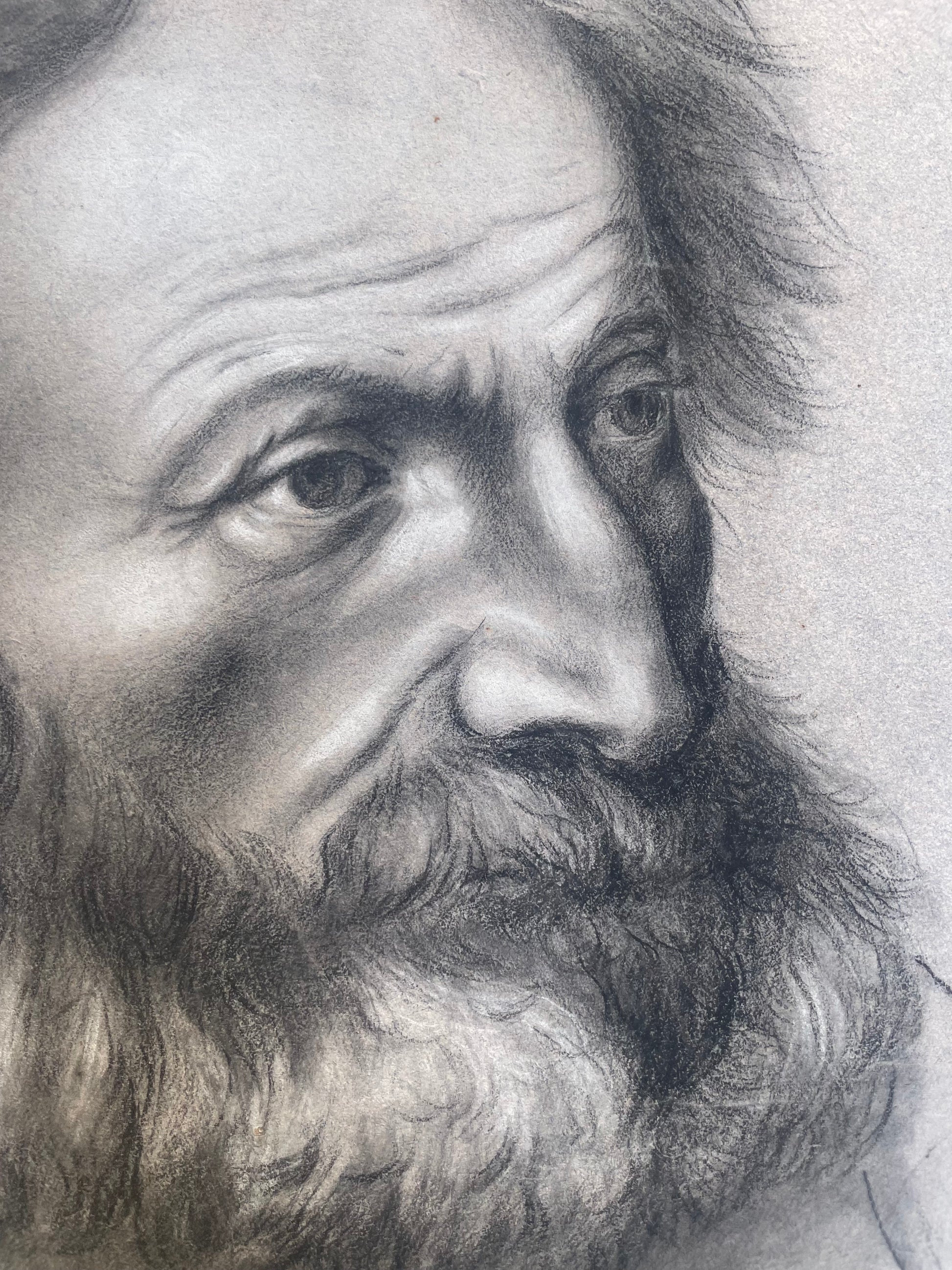 Disegno realistico raffigurante un uomo di mezza età, eseguito dal vero. Il volto è reso con grande immediatezza, mentre i capelli, leggermente mossi come dal vento, conferiscono al ritratto un carattere espressivo e dinamico. Nell’intensità dello sguardo si avverte ancora un’eco di ideali romantici, ma il linguaggio è già più diretto e concreto, tipico della metà del XIX secolo.