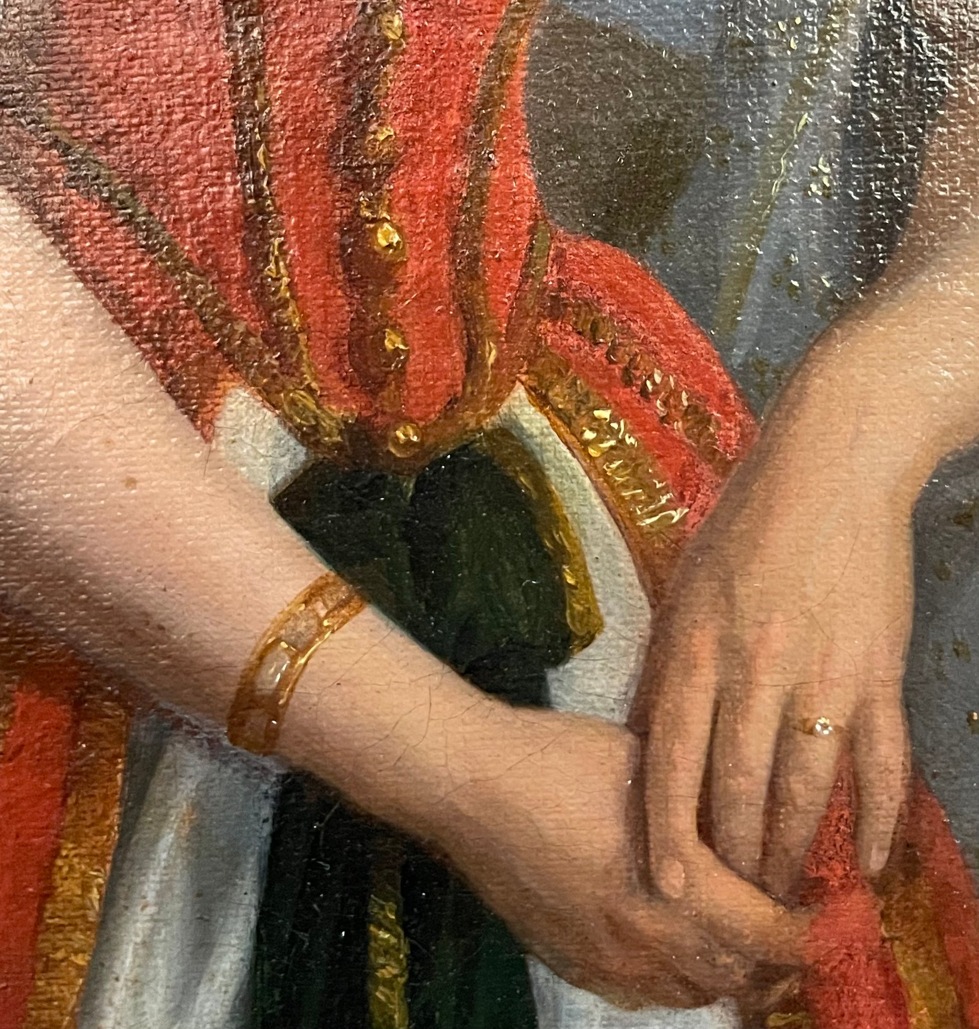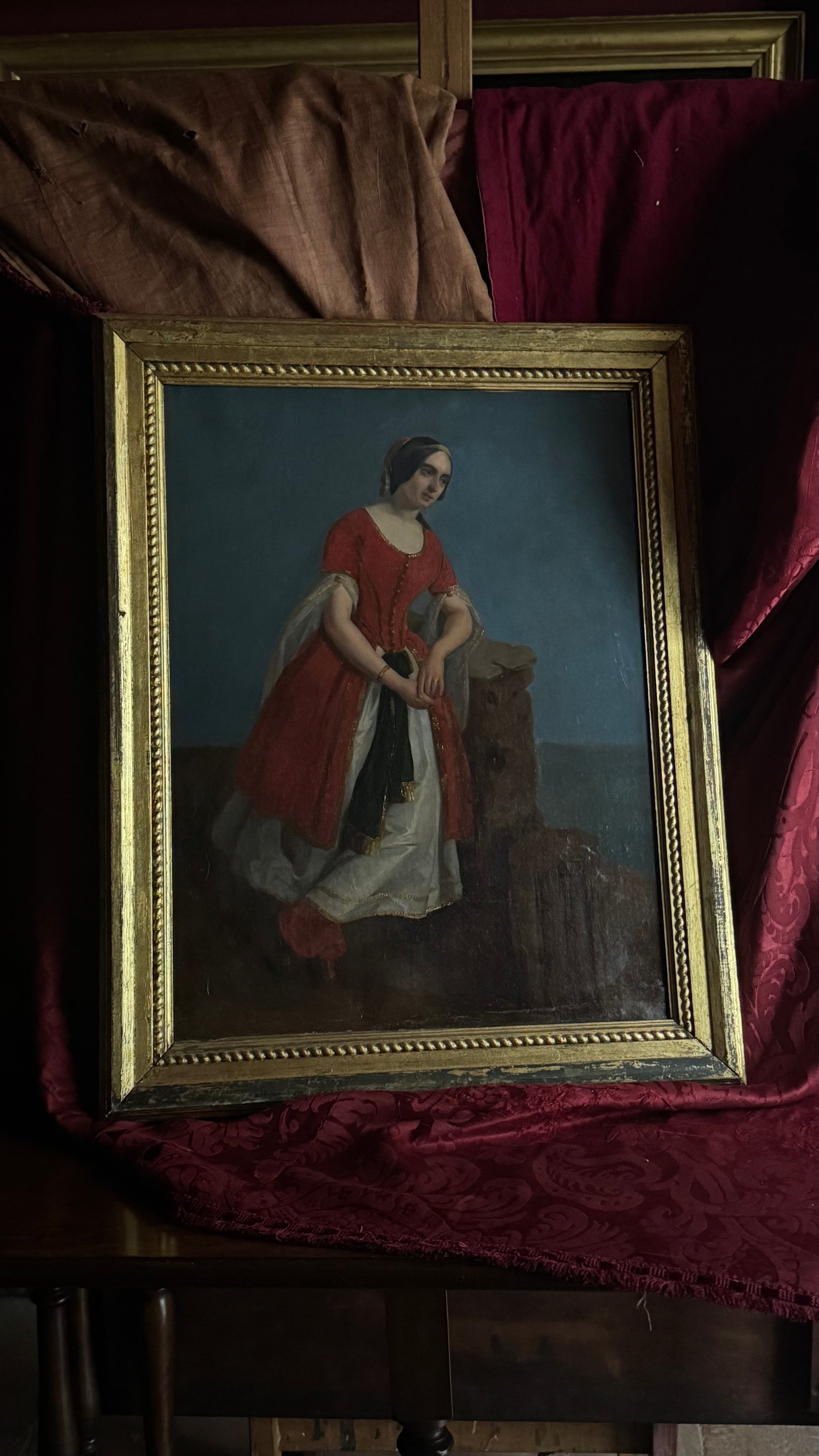 The presence of a wedding ring on the woman’s hand, however, suggests that this may not be a purely allegorical figure but rather a real portrait. It could, in a plausible hypothesis, represent Giuseppina Turrisi Colonna (Palermo, 1822–1848), a prominent Italian poet and intellectual. A young woman of letters and the stage, she shared with her husband, Giuseppe De Spuches — a Hellenist and admirer of Byron — a deep passion for Greek culture and romantic literature. The costume could thus allude to a theatrical performance or literary impersonation of a Byronic heroine within a philhellenic and artistic context.