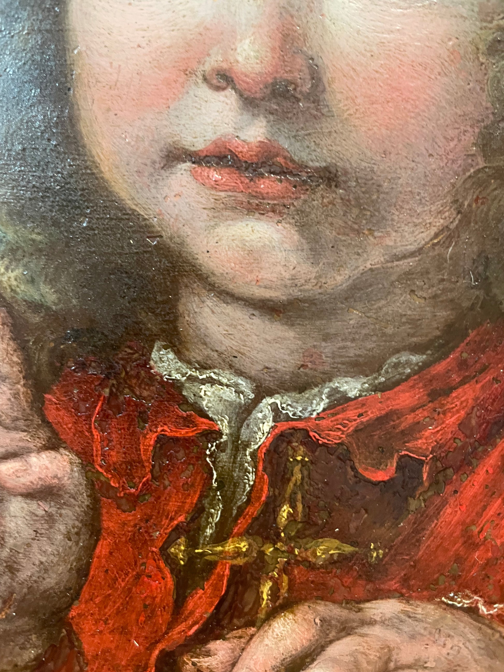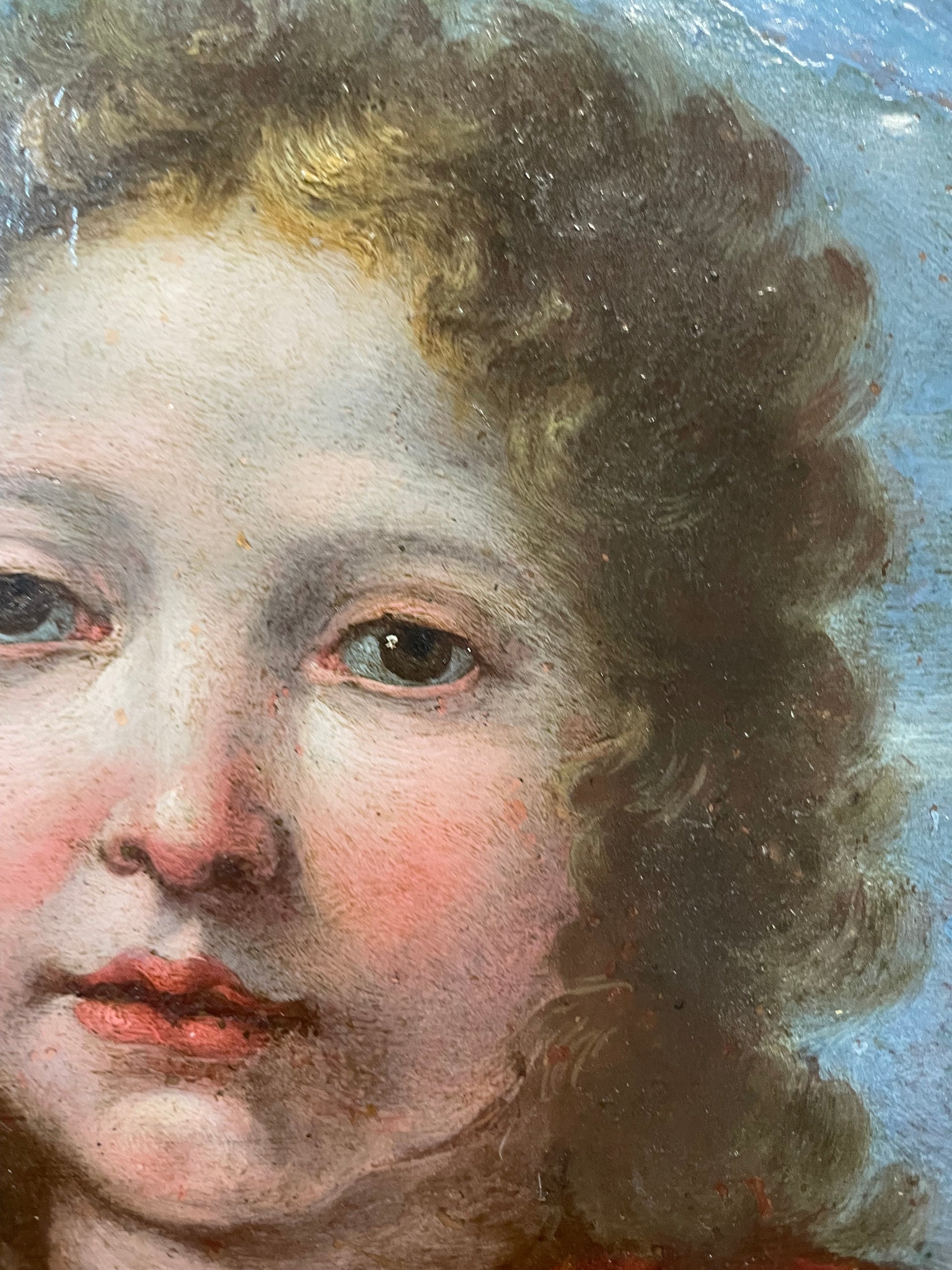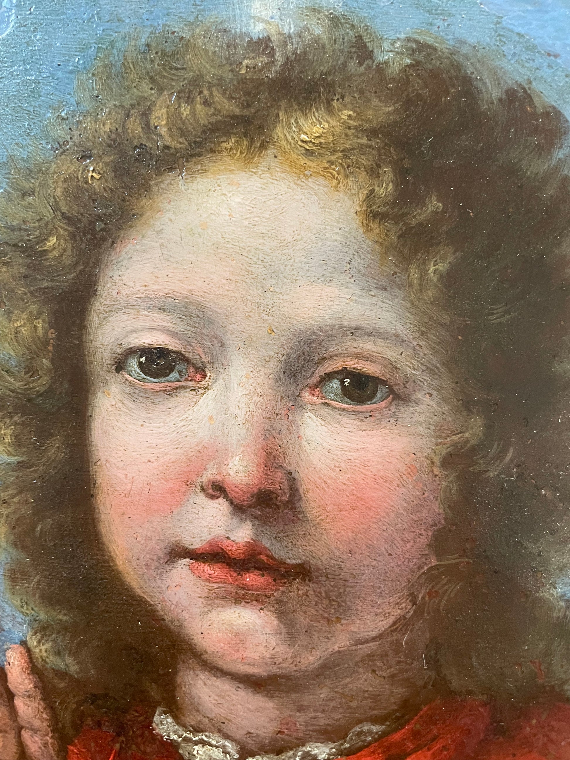 Il dipinto raffigura Cristo fanciullo a mezzo busto, con la mano destra alzata nel gesto benedicente e la sinistra appoggiata al globo terrestre, secondo un’iconografia ampiamente diffusa nella Firenze del secondo Seicento. I piccoli dipinti su rame rimandano a una produzione destinata alla devozione privata, tipica dell’ambiente colto e domestico della Firenze governata dai Medici e strettamente legata all’attività delle botteghe cittadine.