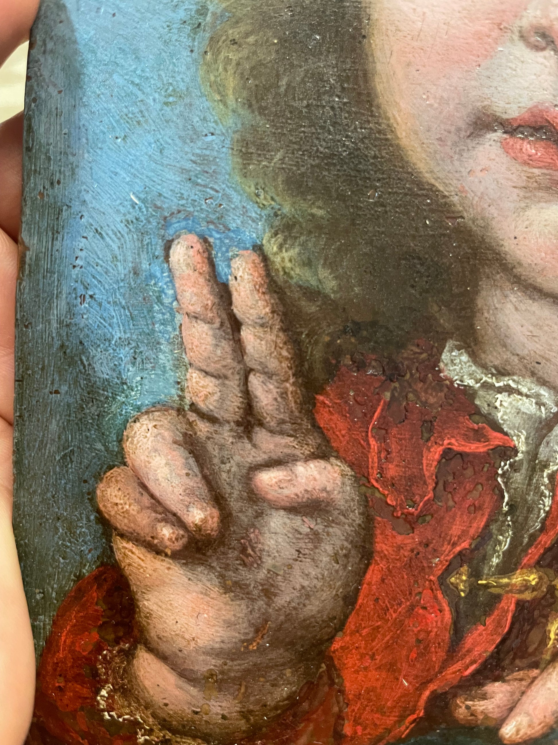 Stato di conservazione: buono stato di conservazione generale; qualche ritocco pittorico sulla veste rossa; supporto in rame in condizioni compatibili con la sua natura e con l’età dell’opera.