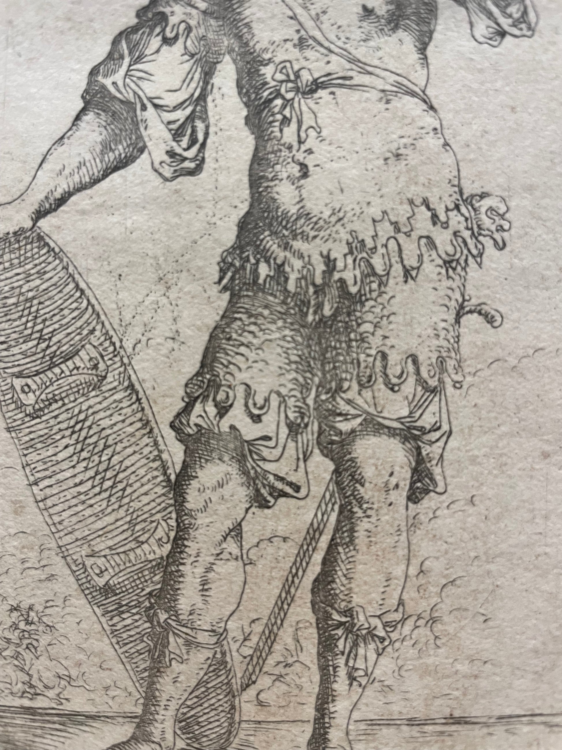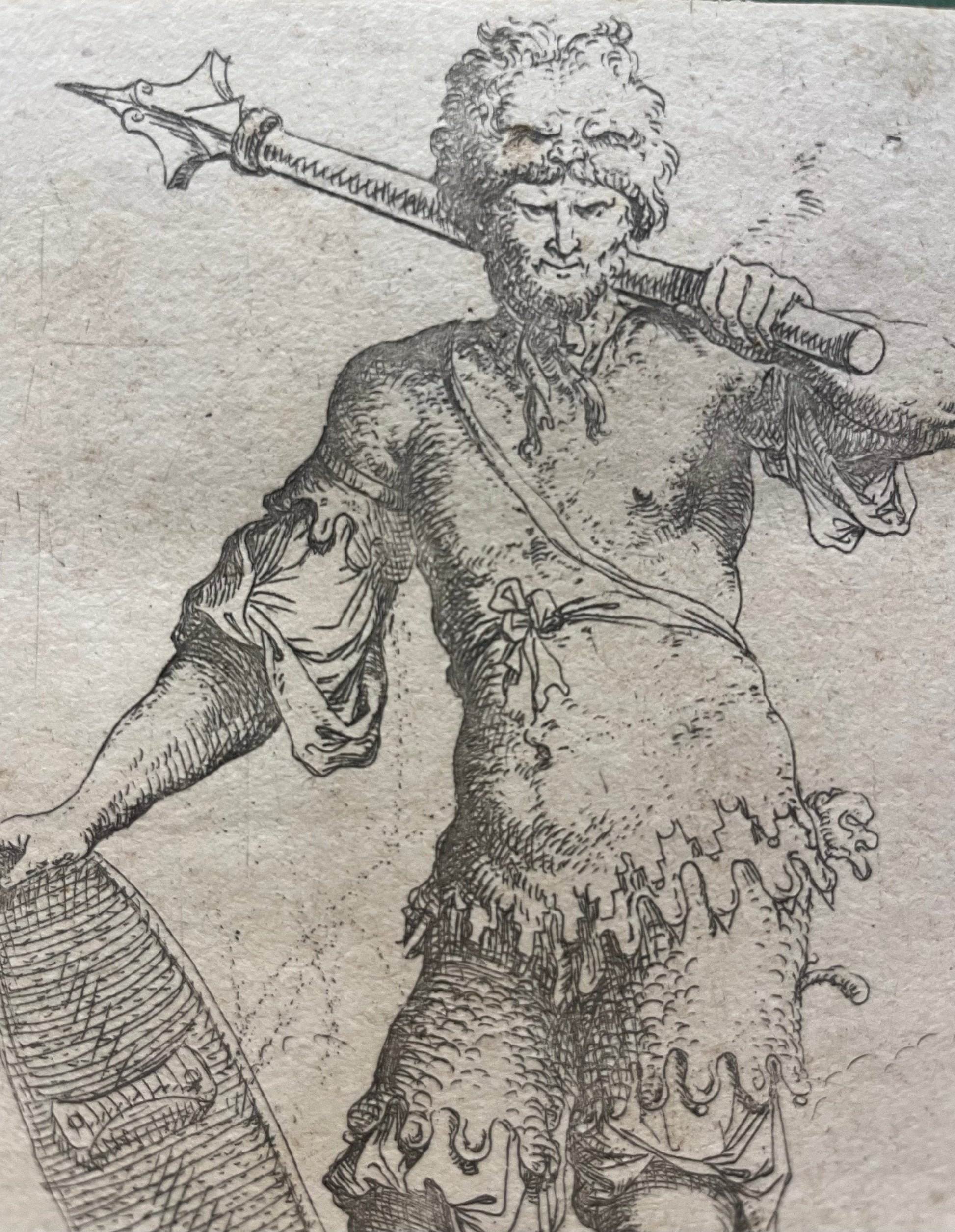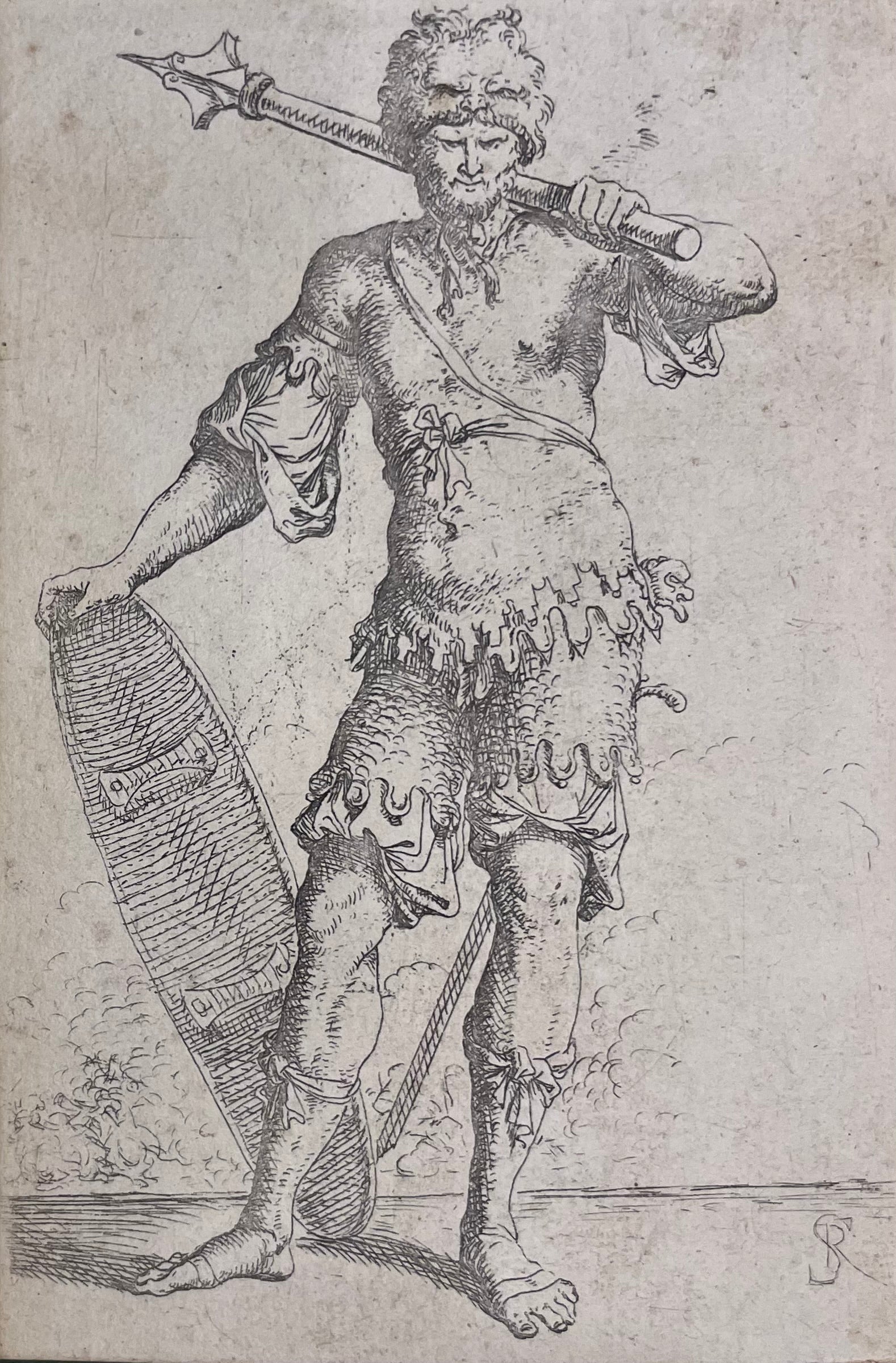Original etching signed in the plate “S.R.”, part of the Figurine series executed by Salvator Rosa during his Florentine period and the early years in Rome. The subject represents a standing warrior holding a mace and a shield, rendered with a firm and incisive line, combining naturalism with an austere sense of monumentality.