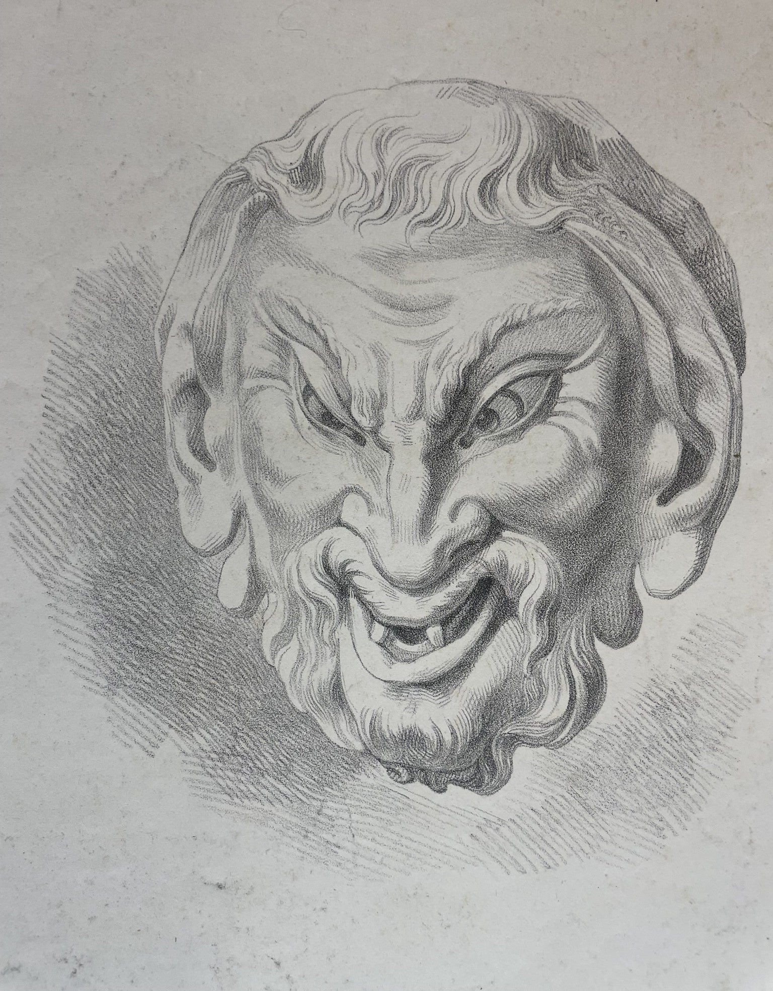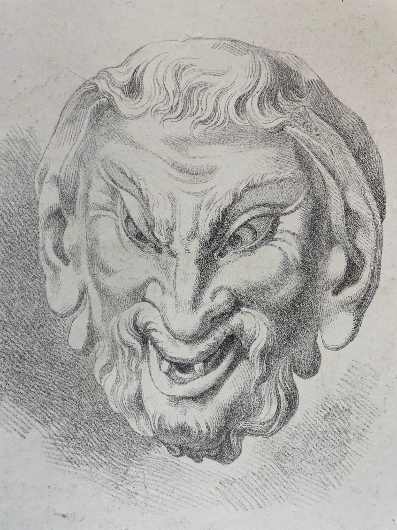 Academic study of a satyr’s head, based on an antique model and linked to the long-standing tradition surrounding Michelangelo’s lost Head of a Satyr. The drawing focuses on the expressive intensity of the face, the curling hair, and the strong modelling of the features, elements closely associated with antique satyr masks used in academic training throughout the 18th and 19th centuries.