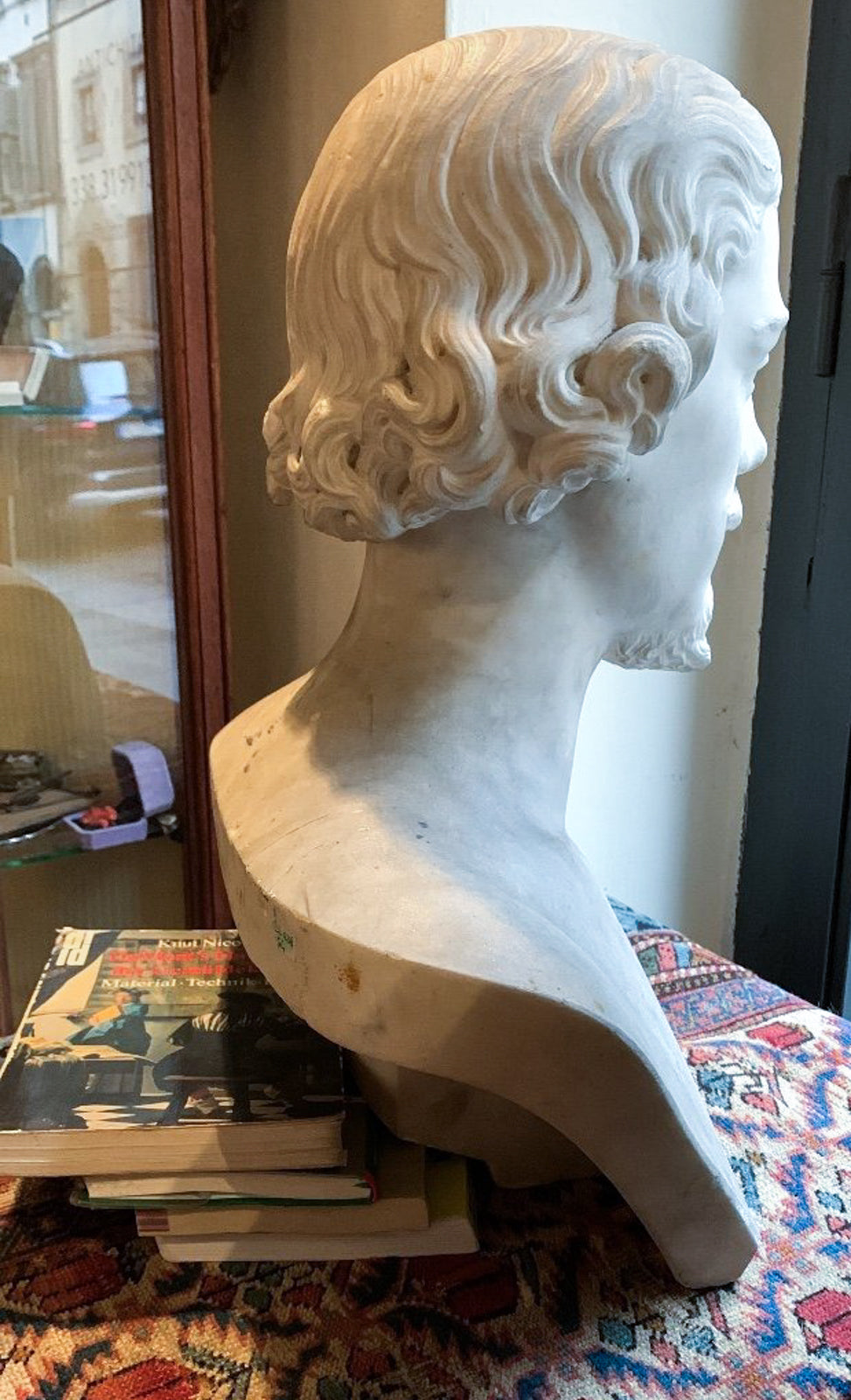 This model draws inspiration from the neoclassical era, with idealizations and heroic elements, but details such as mustache, beard, and soft curly hair clearly place it in the mid-19th century.