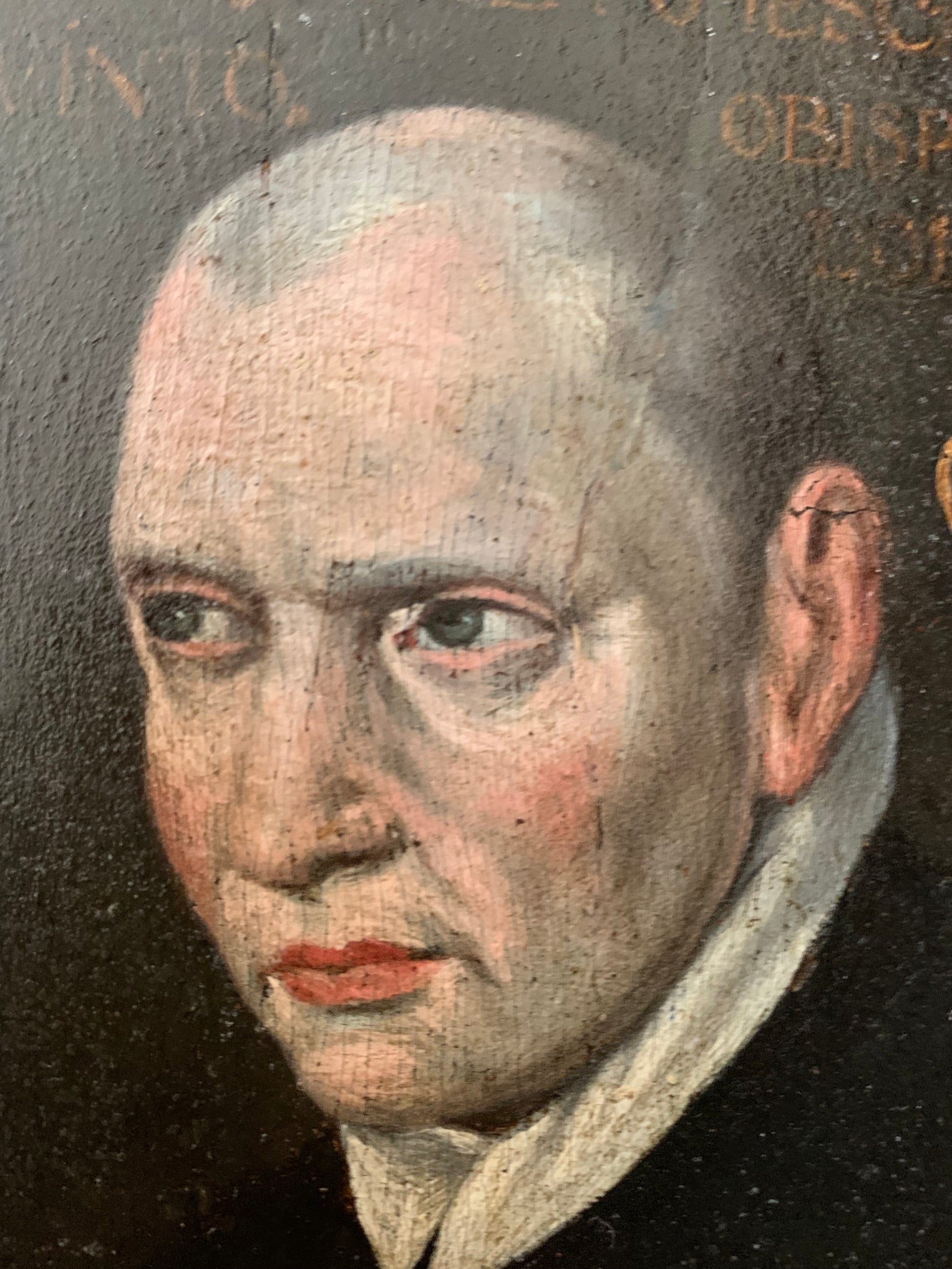 As often in Mannerist / Late Renaissance portraits, the image of the character is accompanied by the writing that runs at the top, adding a celebratory, historicising touch to the effigy. Let's bring back the sentence here: