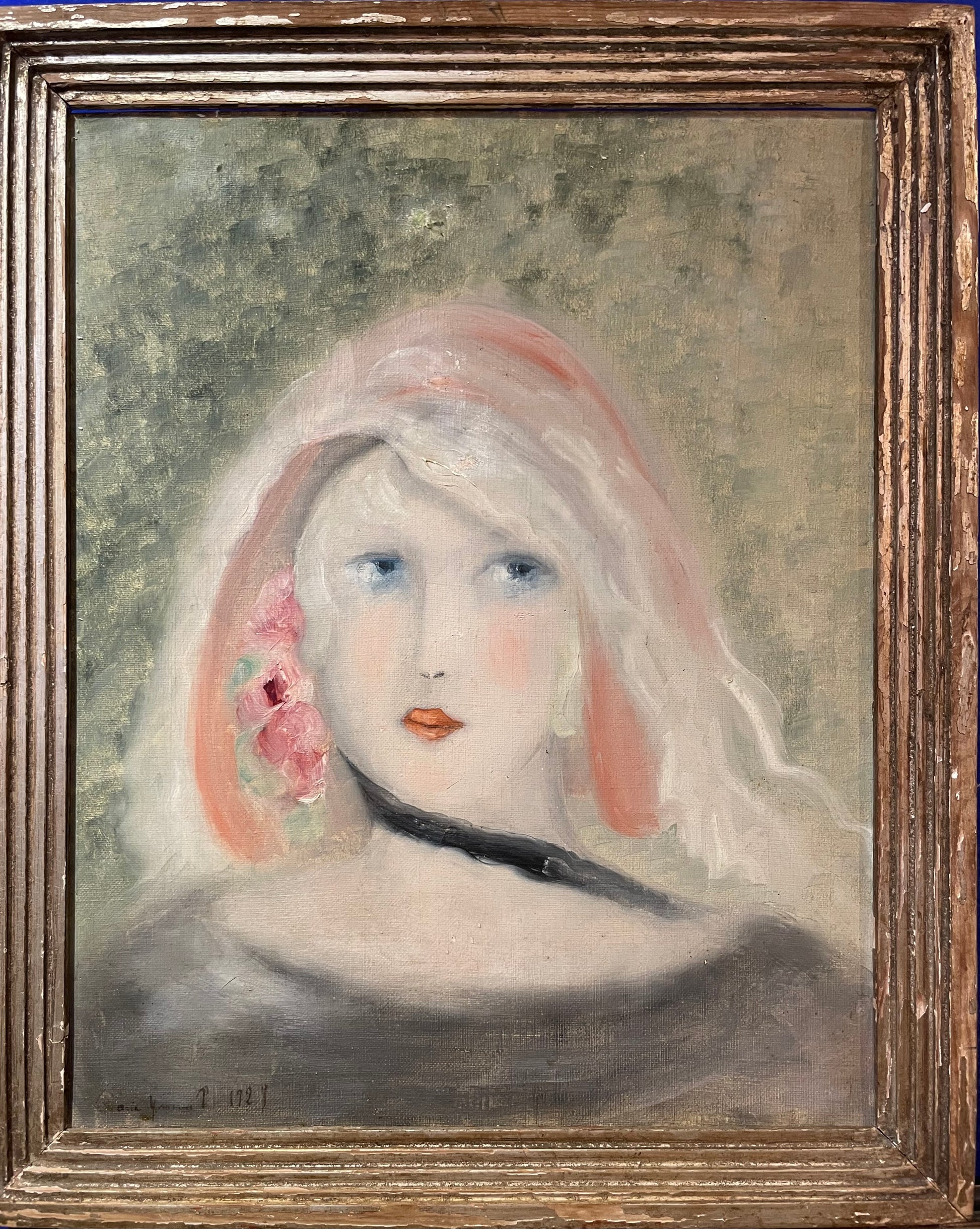Ritratto femminile impostato su una gamma morbida e cipriata, tipica della sensibilità parigina tra anni Venti e Trenta. Il volto chiarissimo, gli occhi azzurri dallo sguardo distante, le labbra corallo e la rosa tra i capelli rimandano direttamente all’immaginario intimista e decorativo sviluppato da Marie Laurencin e dalla sua cerchia.