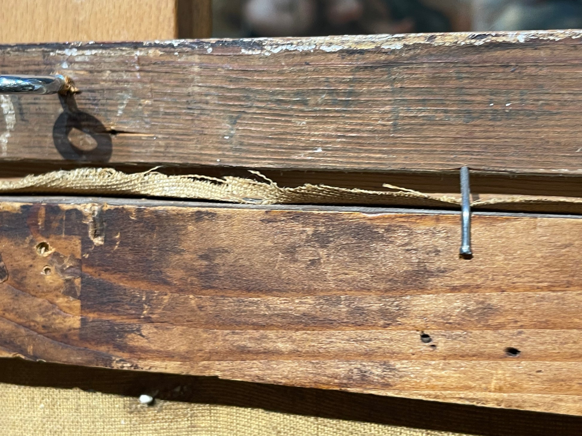 Cornice in legno argentato con patina, con alcune usure e piccole mancanze.