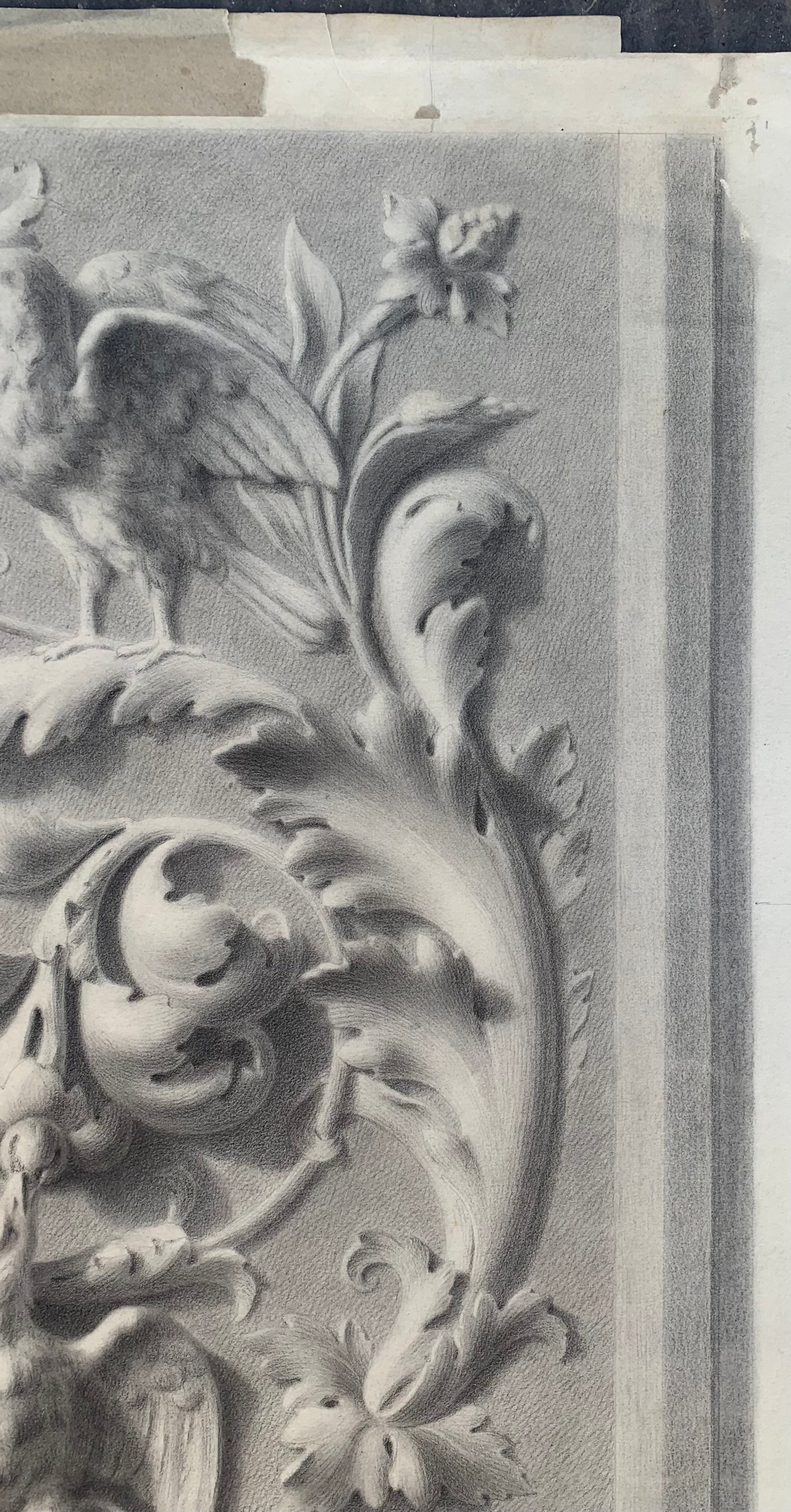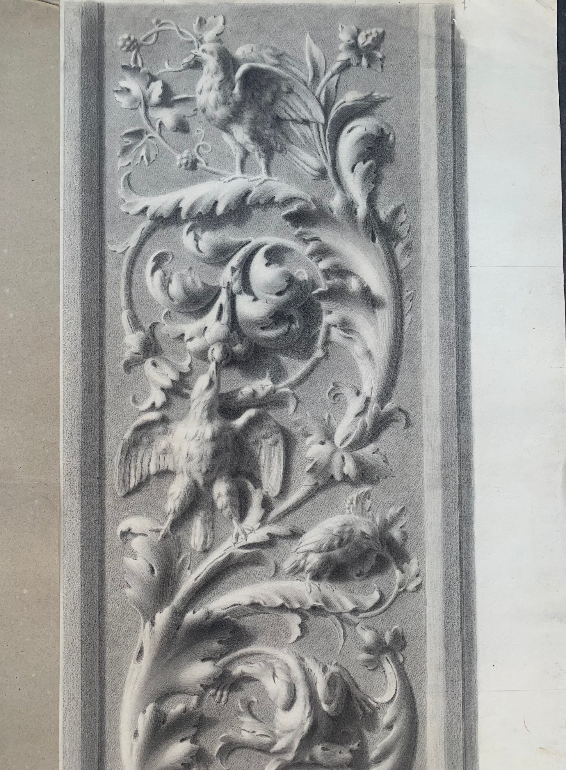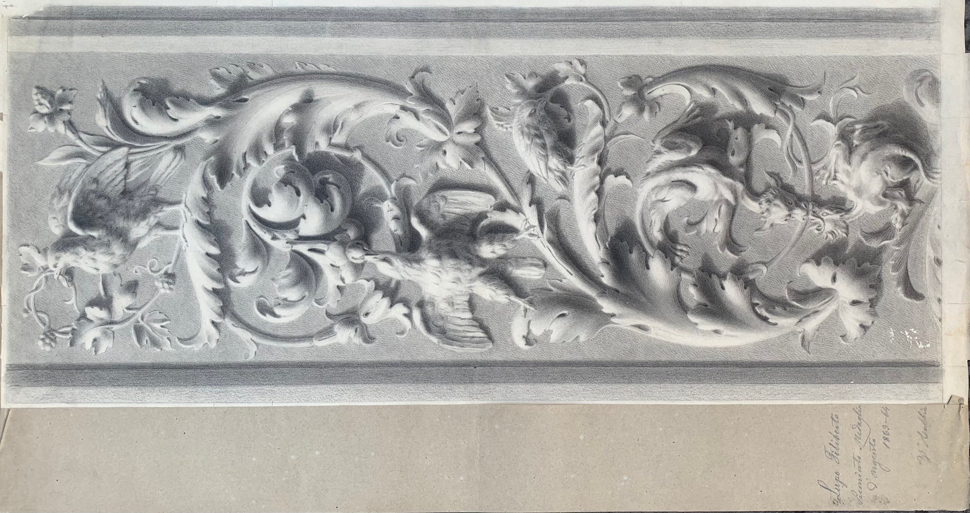 This drawing, created in 1864, is an academic study of a plaster cast of an ancient bas-relief. It is adorned with intricate grotesques, fantastical dragons, and delicate birds.