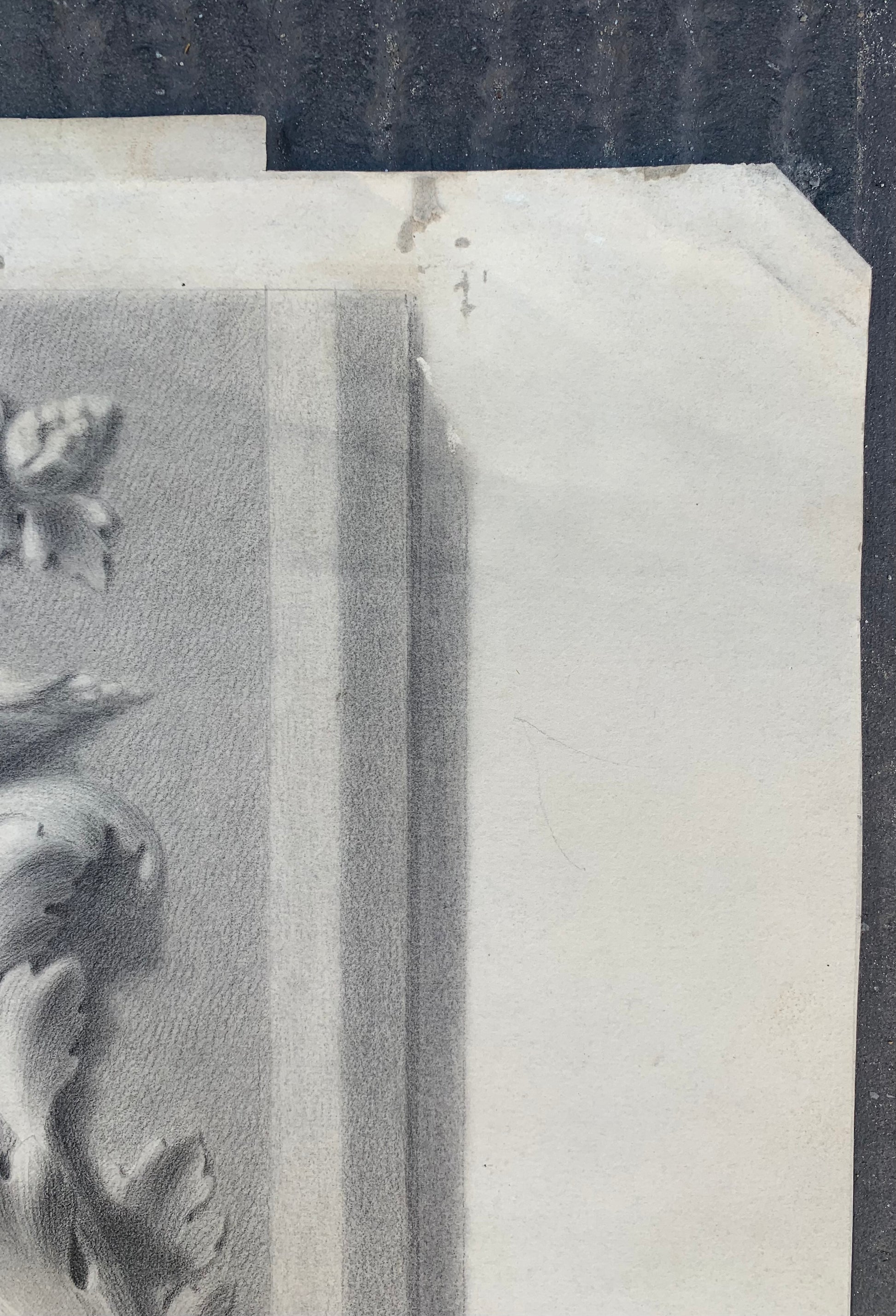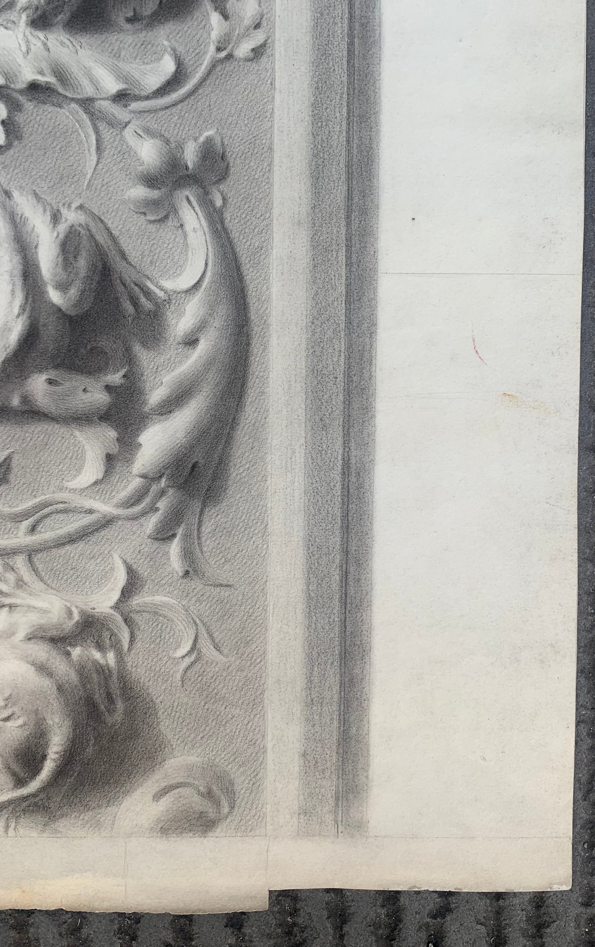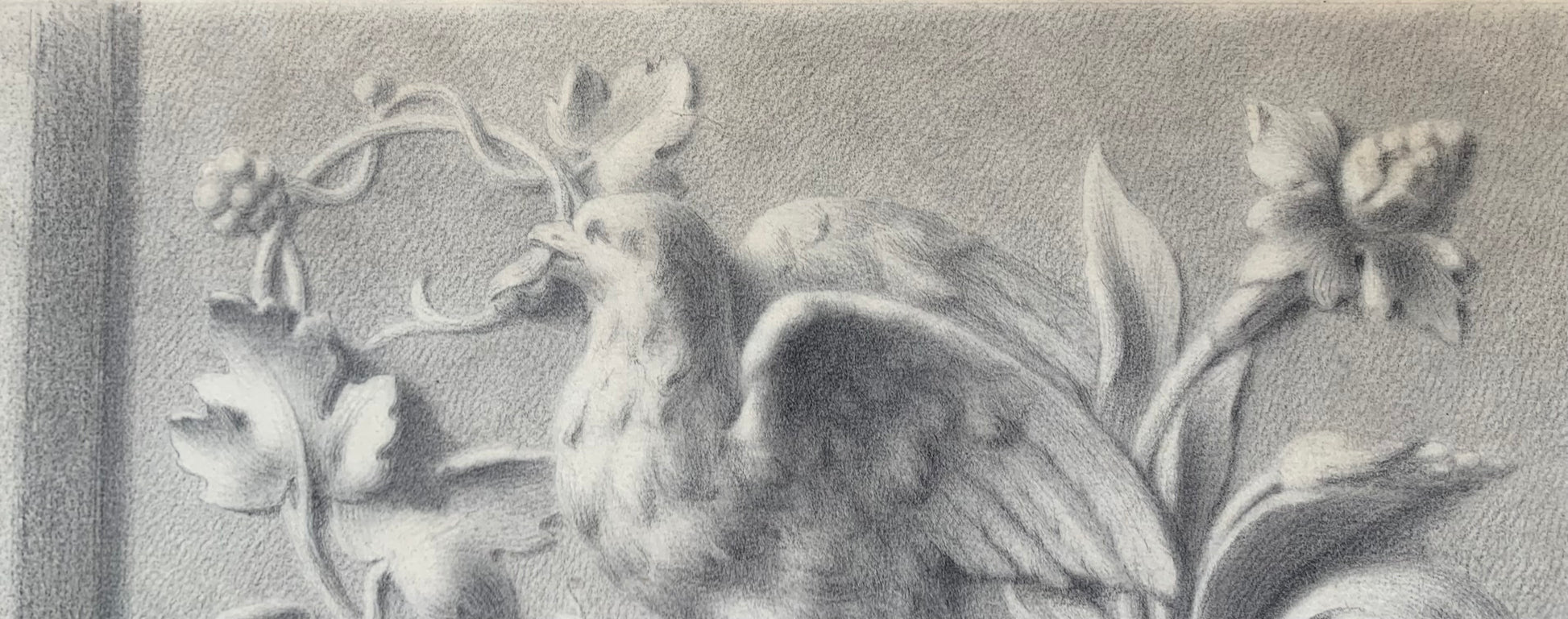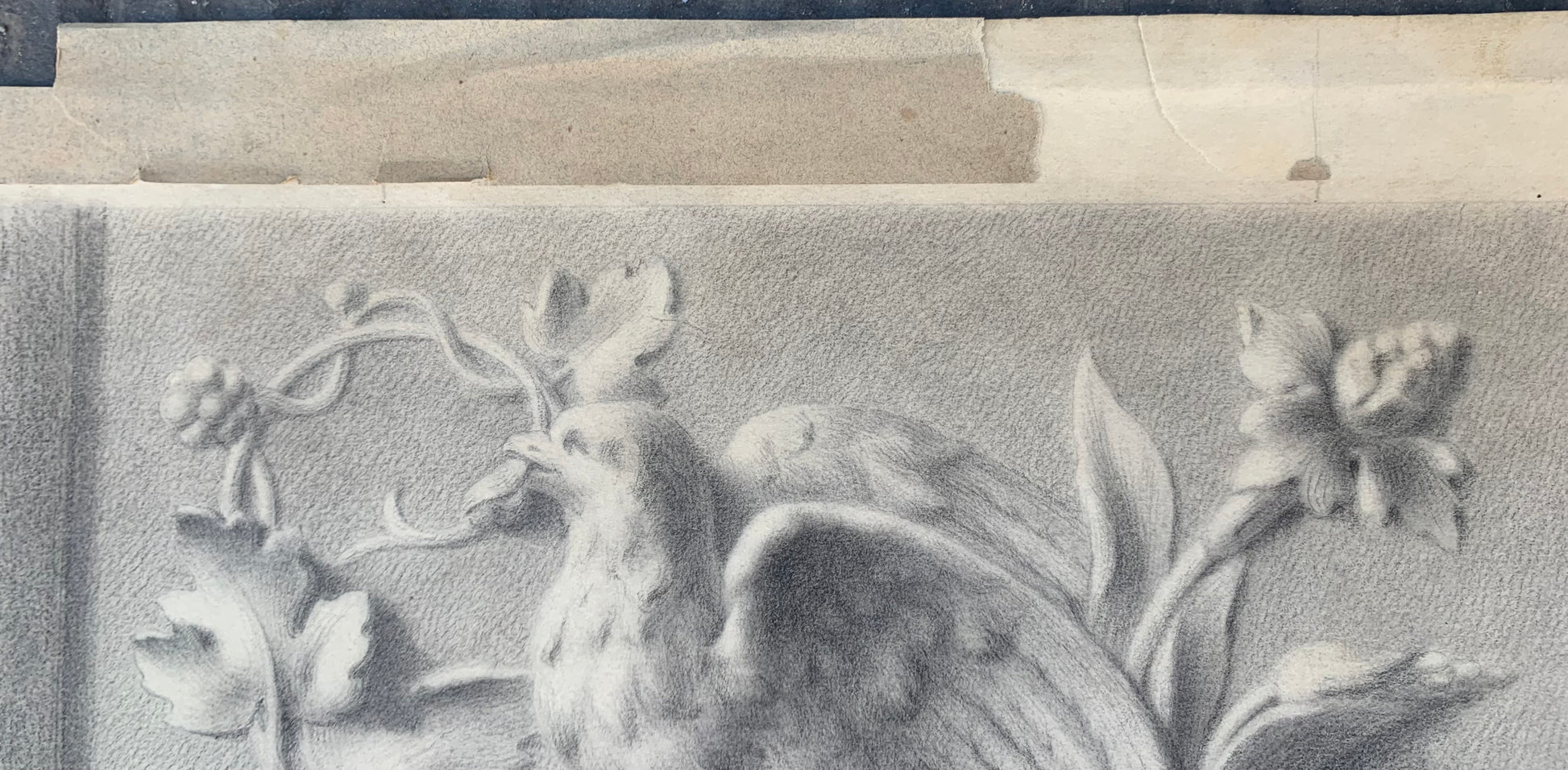 This drawing, created in 1864, is an academic study of a plaster cast of an ancient bas-relief. It is adorned with intricate grotesques, fantastical dragons, and delicate birds.